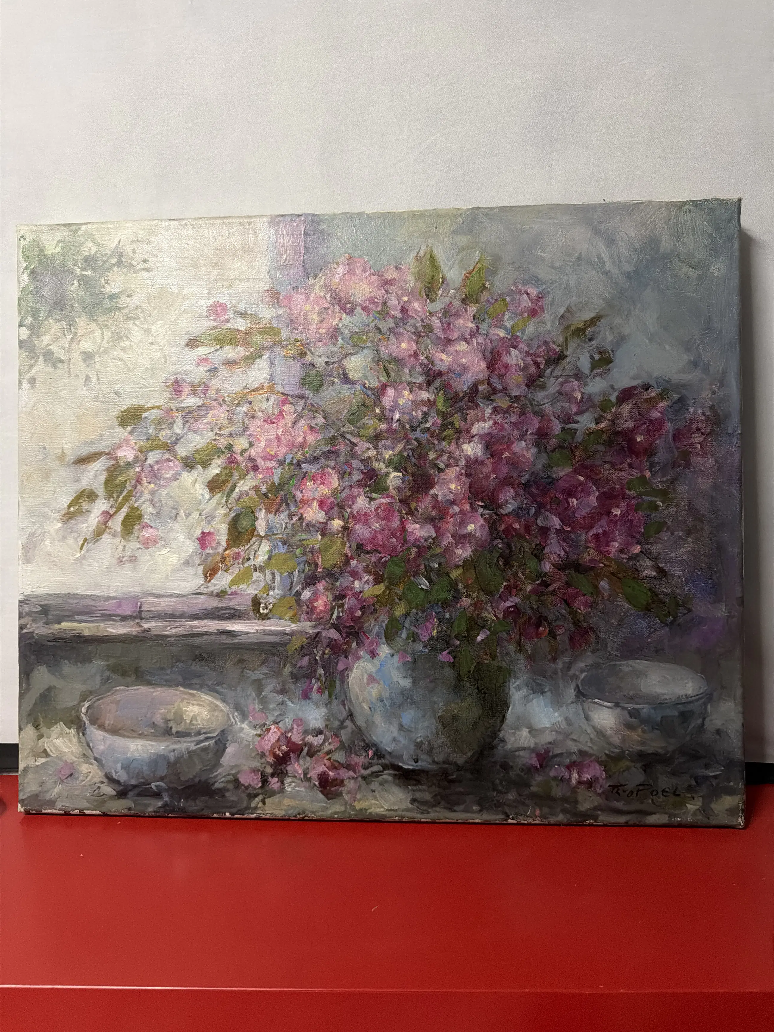 Het schilderij toont een rijk boeket roze bloesems in een vaas, geschilderd met losse, pasteuze penseelstreken en een harmonieus, ingetogen kleurenpalet. De aandacht ligt op sfeer en lichtwerking, typerend voor impressionistisch geïnspireerd werk uit de tweede helft van de 20e eeuw.