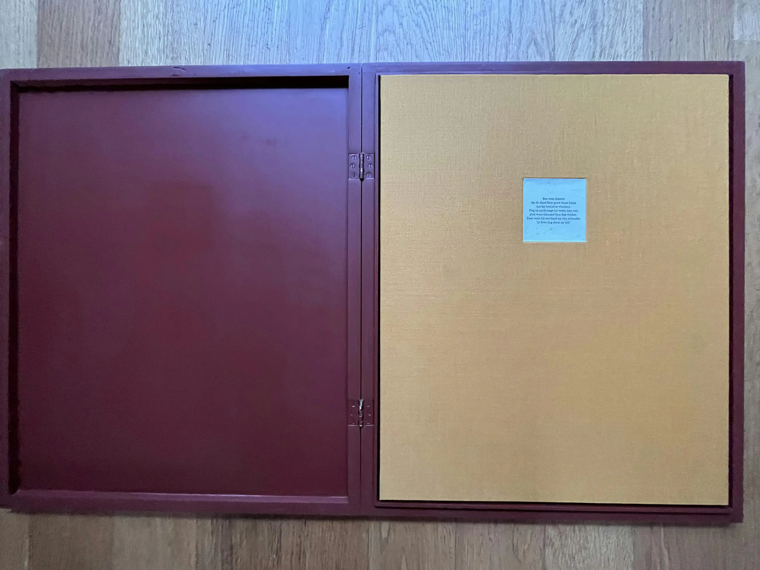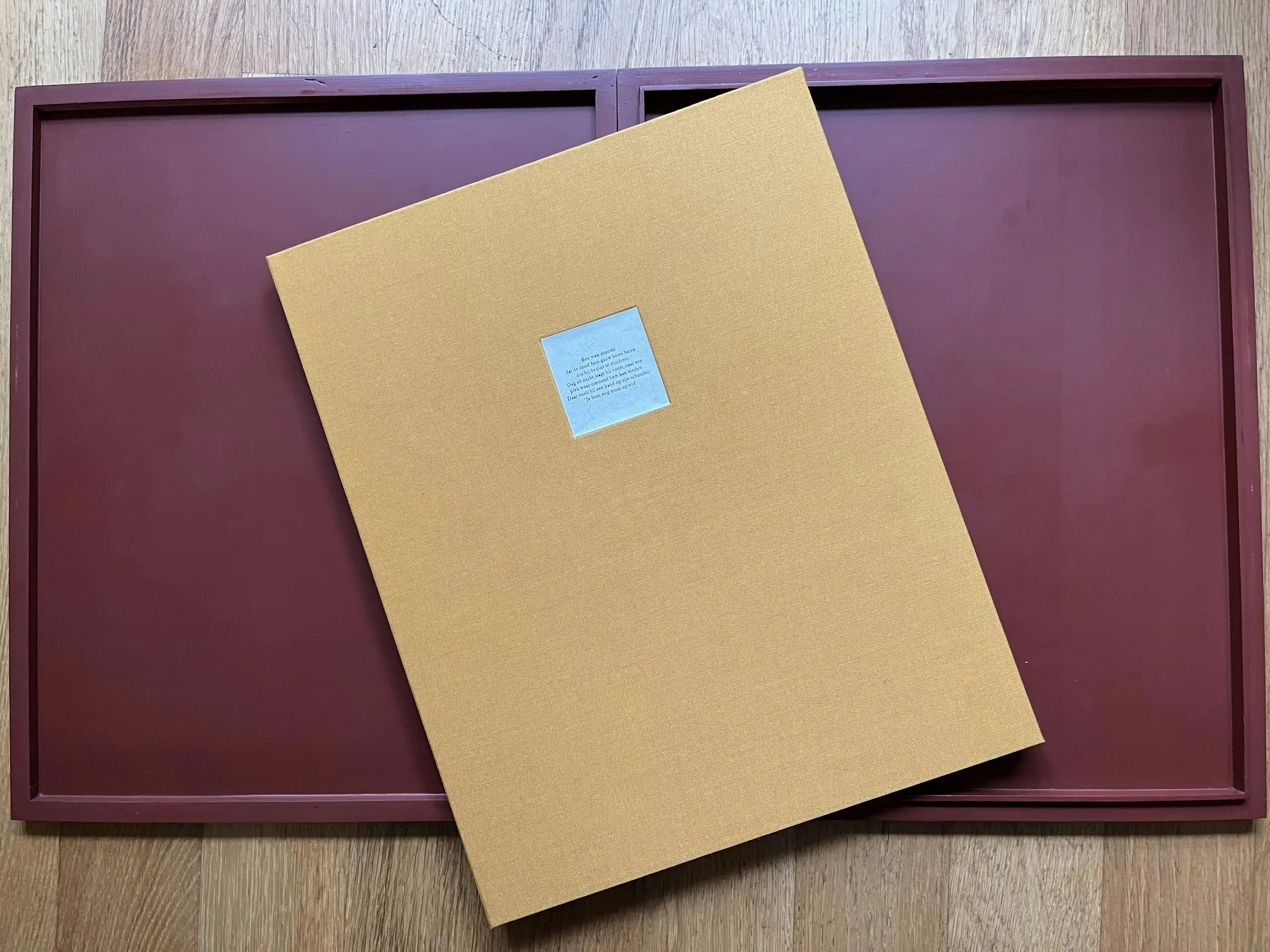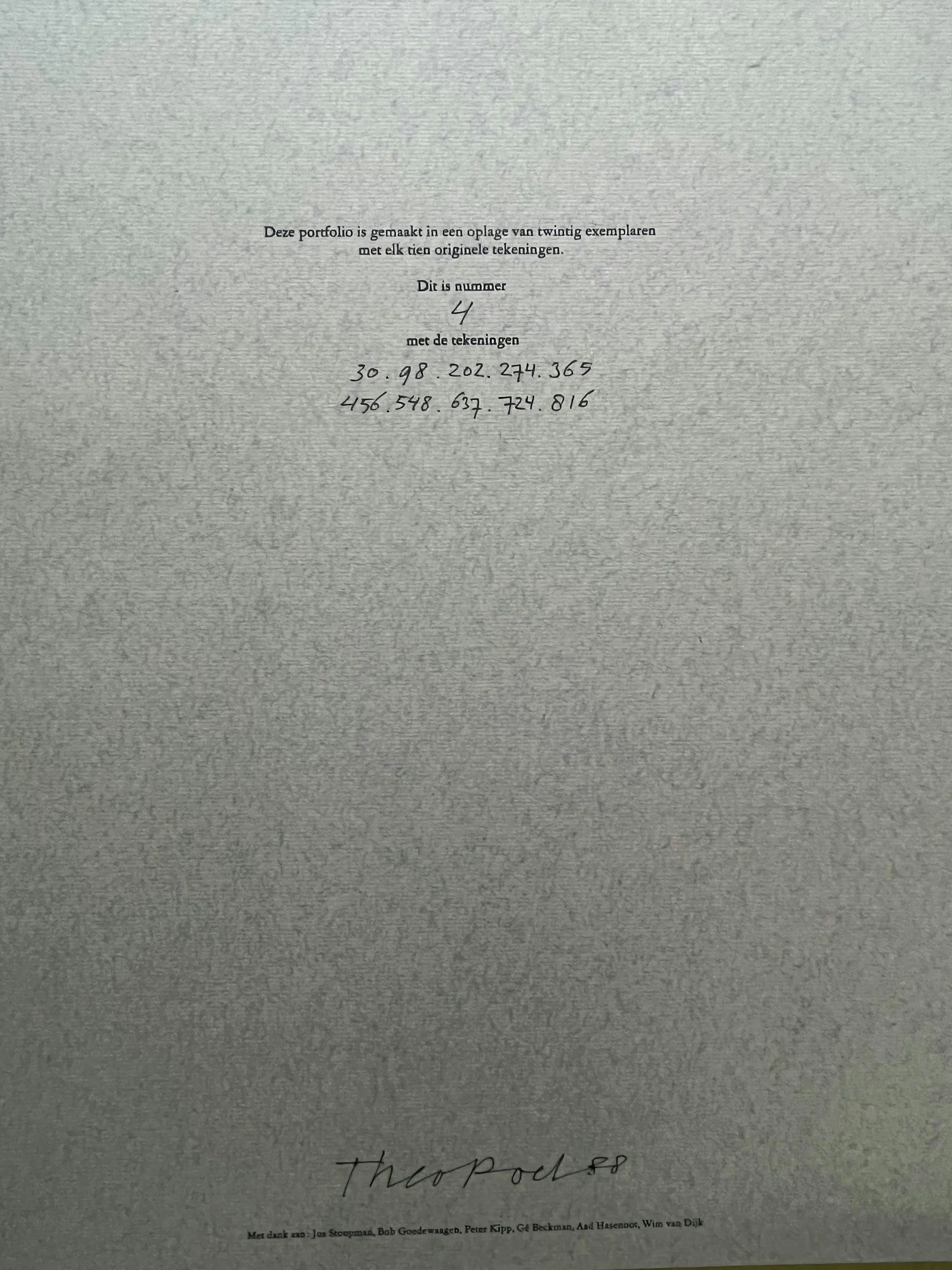 Fraaie uitgave uit 1988 met een portfolio van 10 originele, gesigneerde, tekeningen welke in een oplage van 20 is uitgegeven. De tekeningen zitten een gele map, welke in een houten kistje zitten. Tussen de tekeningen zitten schutbladen waarop de doordeweekse dagen van de week worden genoemd met een ochtend en middag editie. Afmeting tekening is 40 x 32 cm. Het roodbruine platte kistje meet 45 x 37 x 2,5 cm.