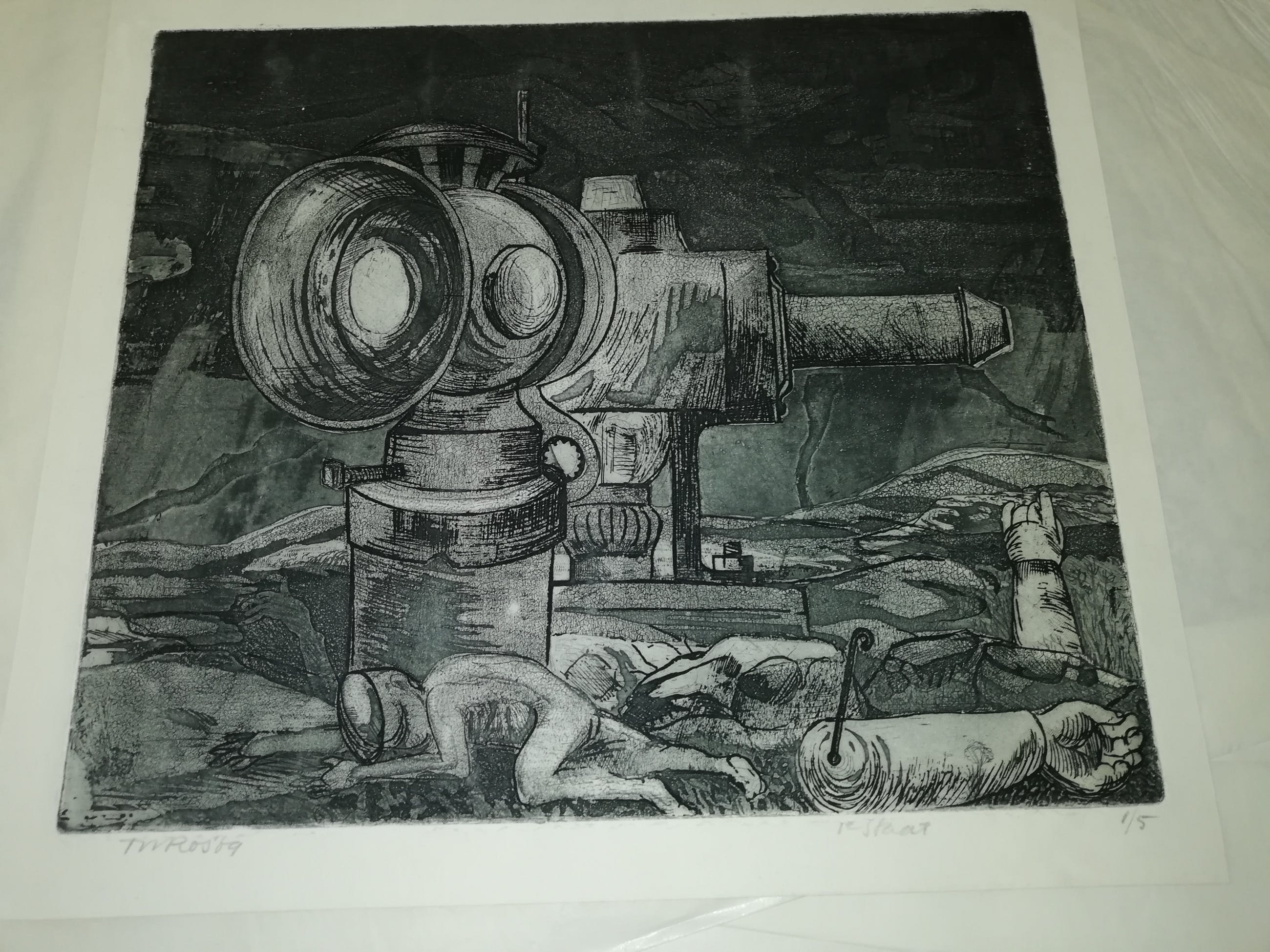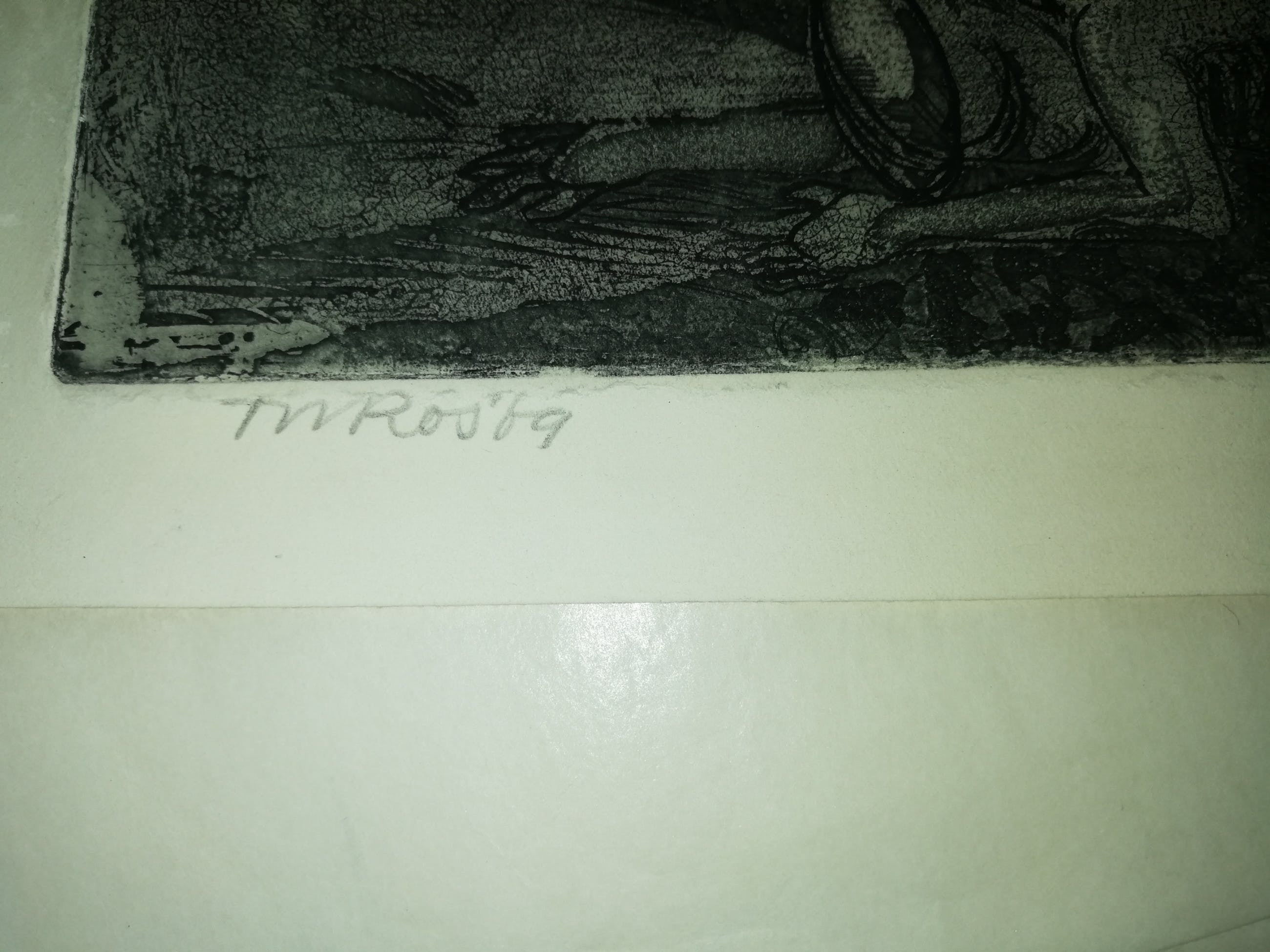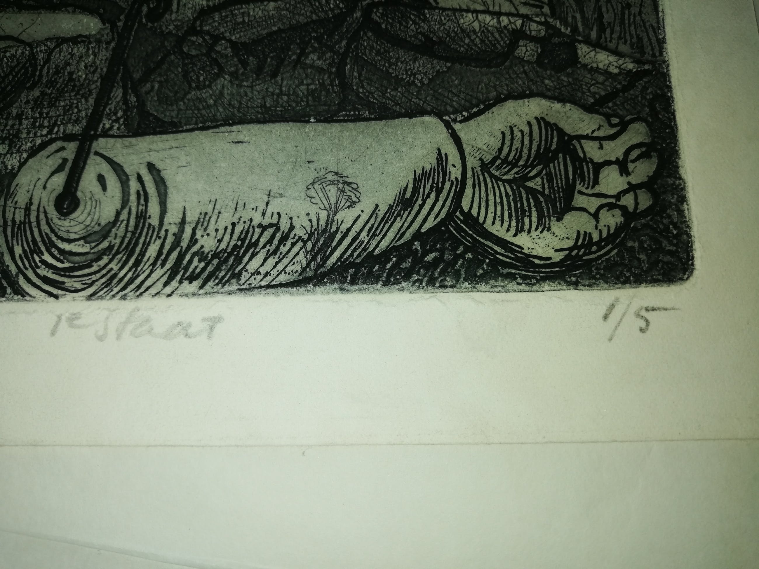 Leuk werk nr 1 van 5, nooit ingelijst geweest en de afmetingen zijn zonder witte rand. Witte rand is verkleurd maar met passe-partout niet storend.