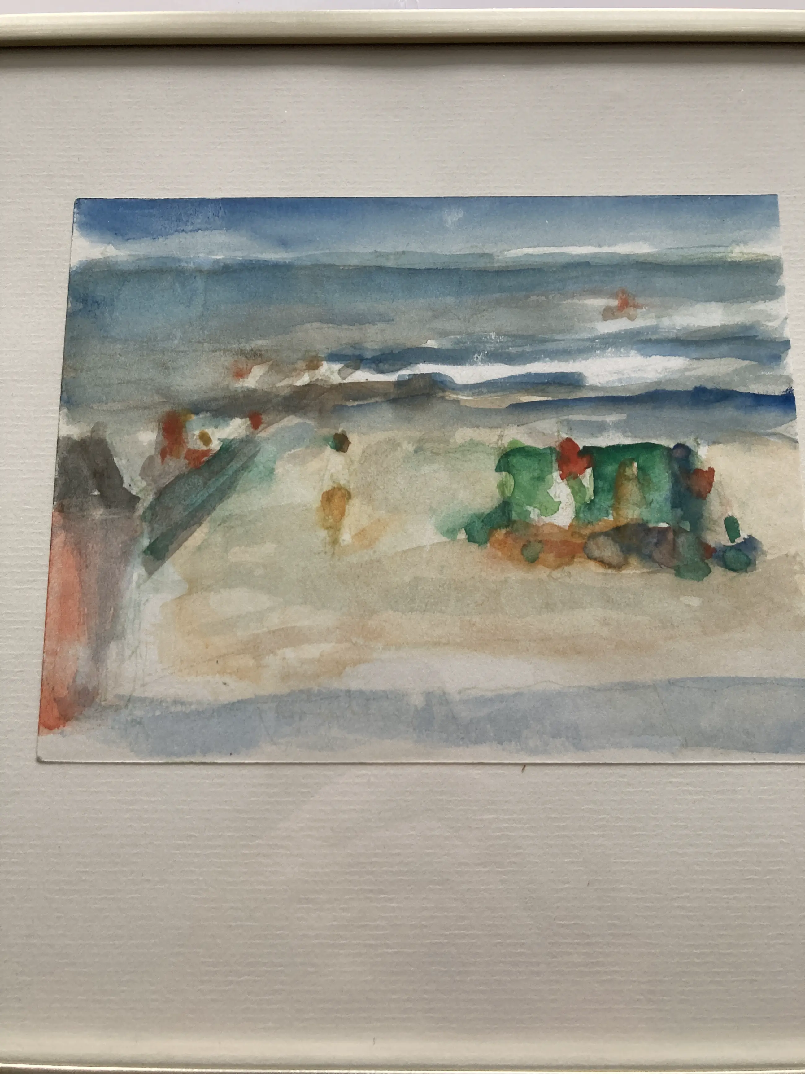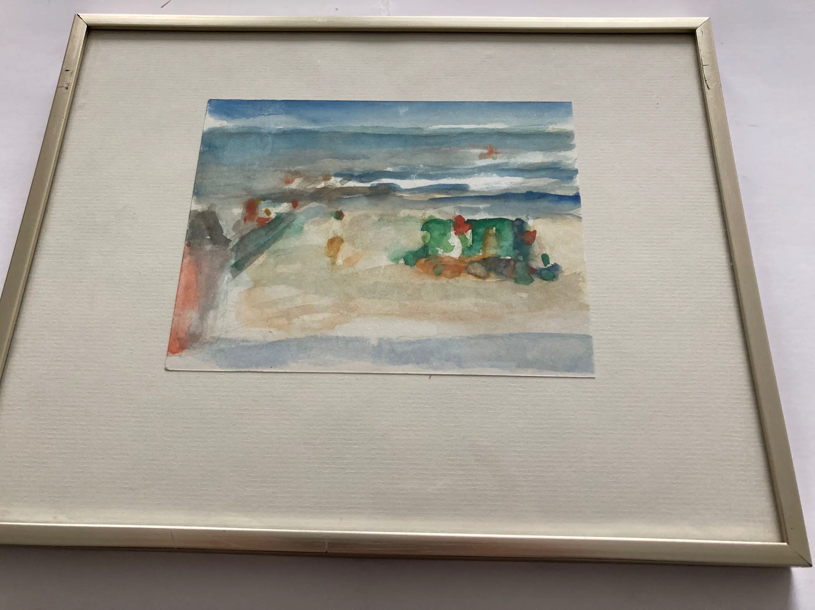Een kleine maar fraaie aquarel met de afbeelding van een strandtafereel.