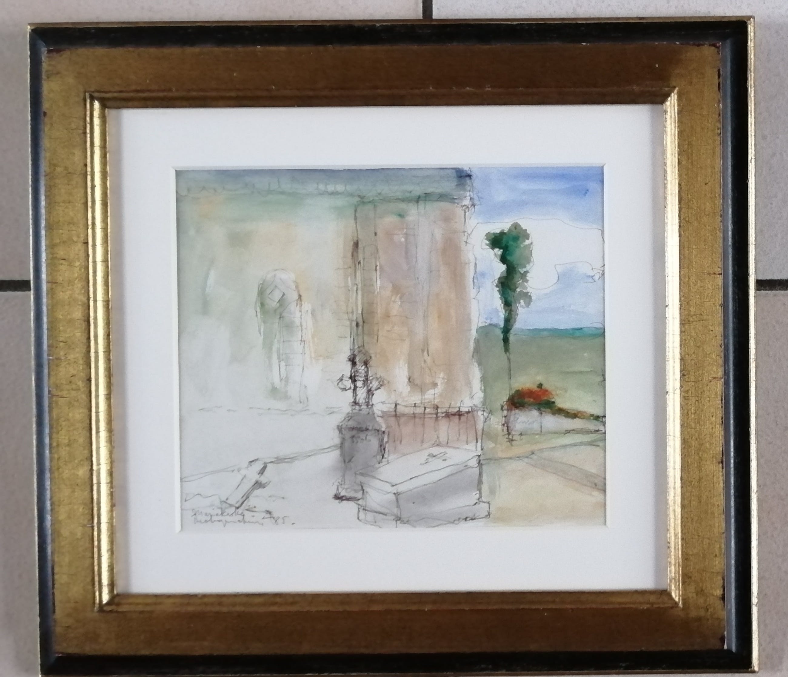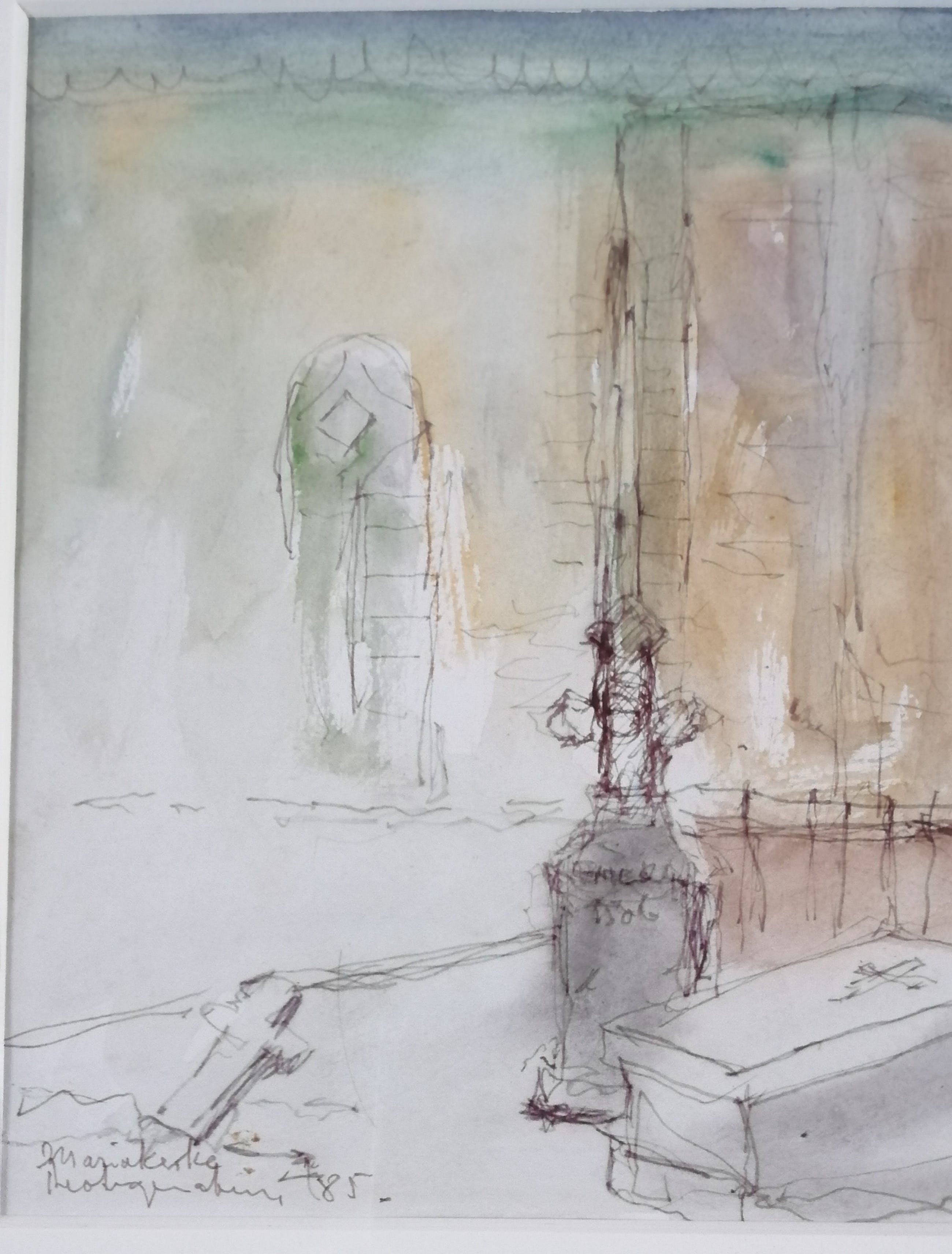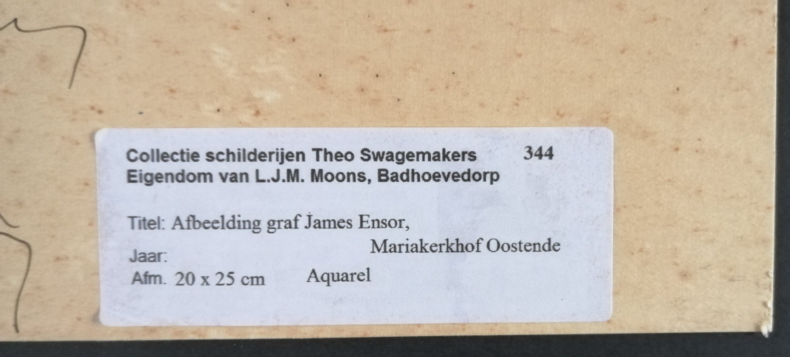Gesigneerd en gedateerd '85 linksonder. Voorstellende het graf van James Ensor bij de Maria Kerke te Oostende (België). Dit werk is afkomstig uit de verzameling van Louis Moons, destijds eigenaar van het Theo Swagemakers Museum te Haarlem. Theo Swagemakers wer geboren te Tilburg op 25 december 1898 en overleed te Laren (N-H) op 27 mei 1994. Opleiding aan de Académie des Beaux Arts te Brussel en de Académie Colarossi te Parijs.