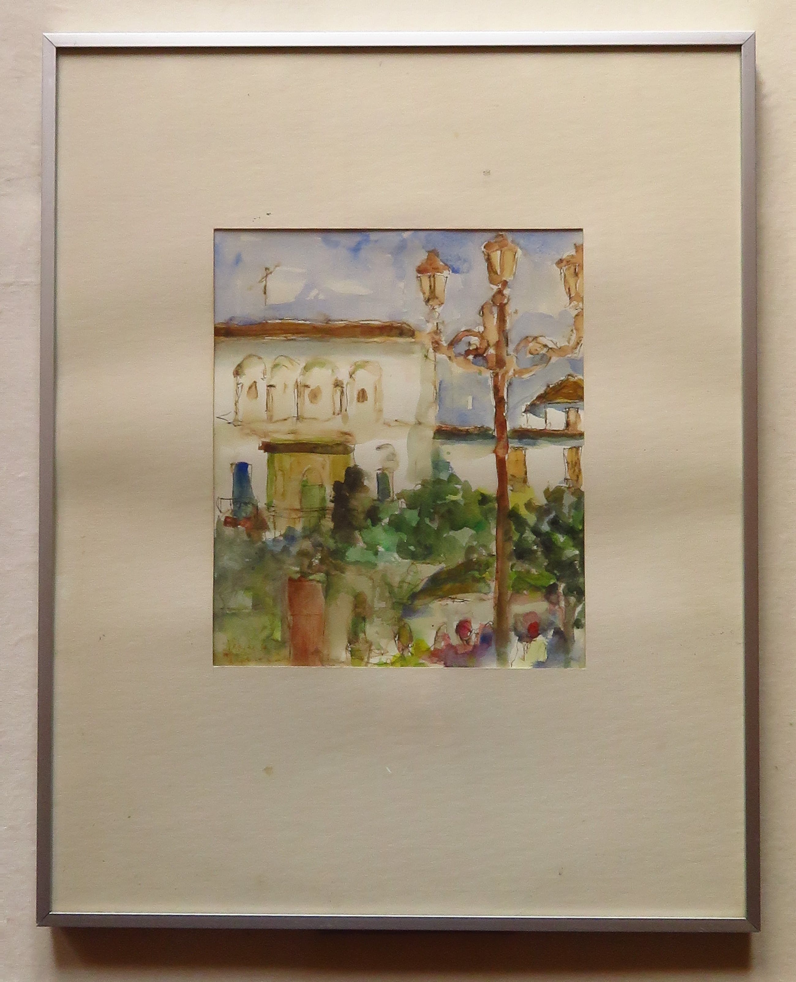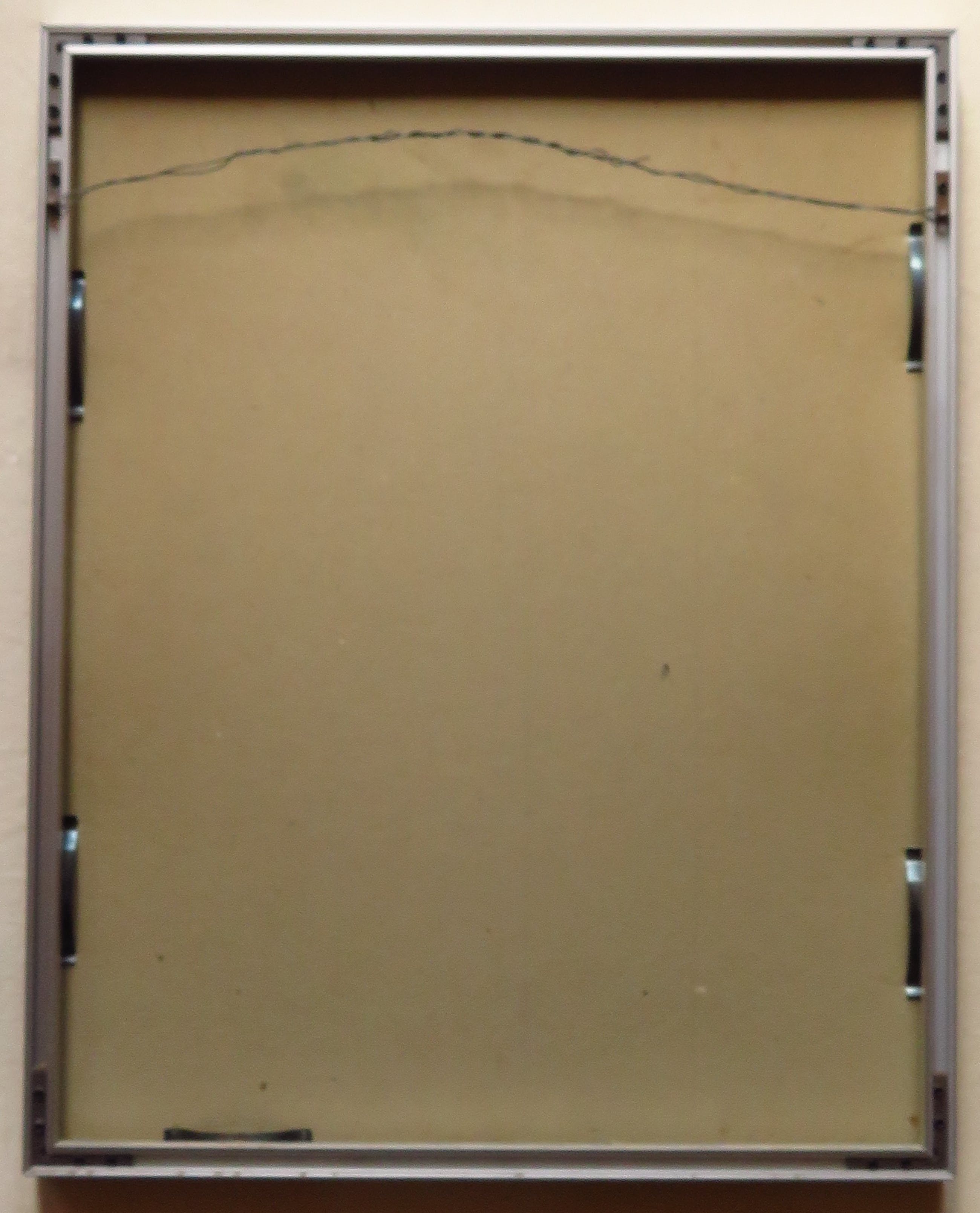 De aquarel is met passe-partout achter glas ingelijst. Aluminium lijst. De aquarel is in uitstekende staat. Er zitten vlekjes op het passe-partout.