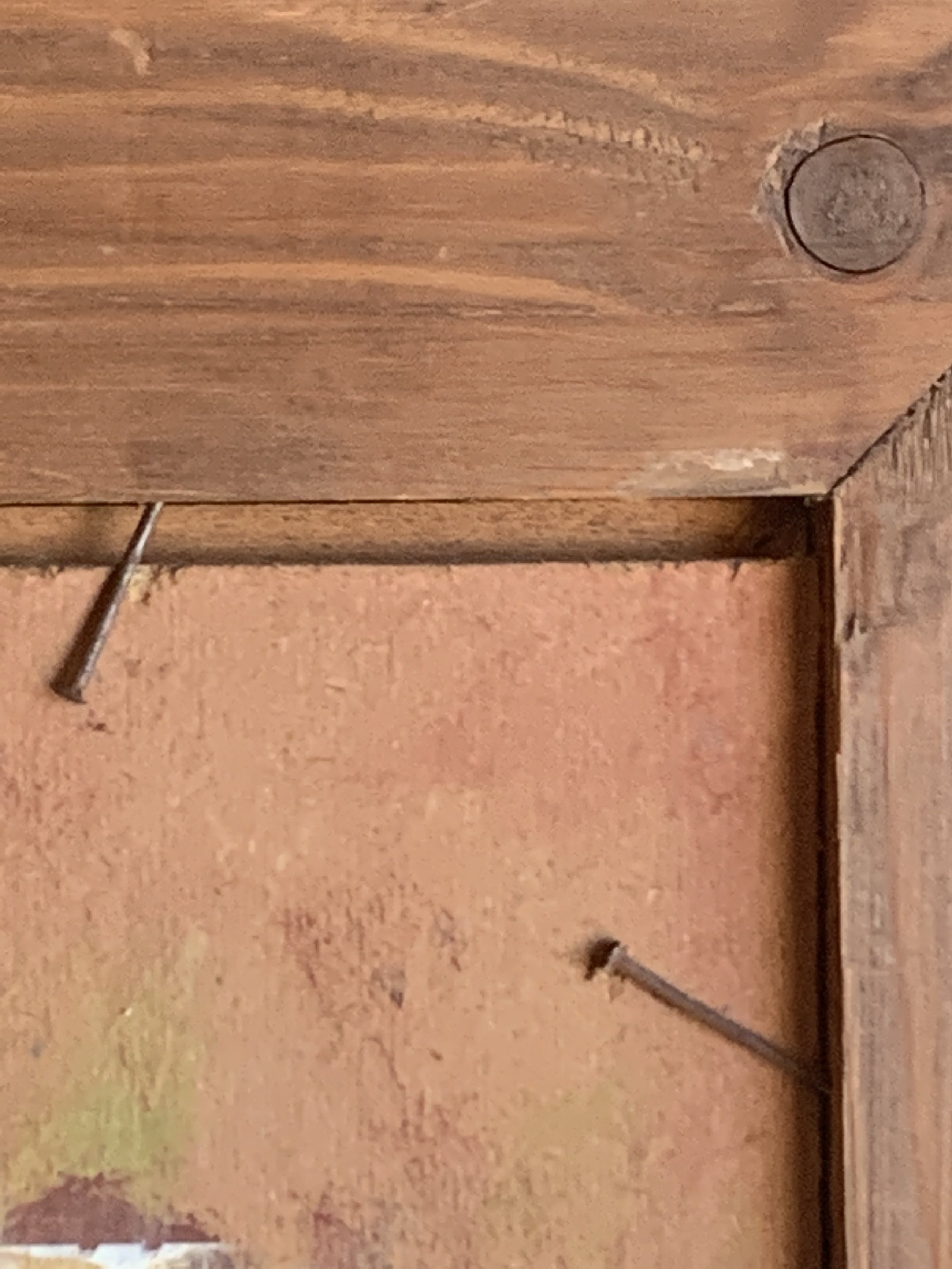 Werk achter glas in prima staat. De lijst is deels linnen (?) en die is in de loop der jaren wel vuil geworden.