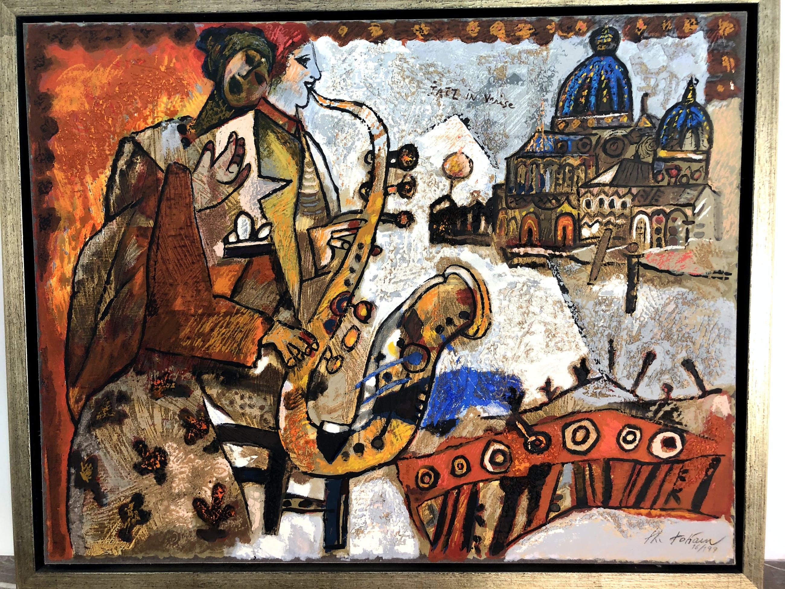 Terragraph op doek van Theo Tobiasse met een voorstelling van een man en een vrouw met een saxofoon en op de achtergrond een beeld van Venetië. Door de gebruikte techniek is er duidelijk reliëf en oogt het als een schilderij.