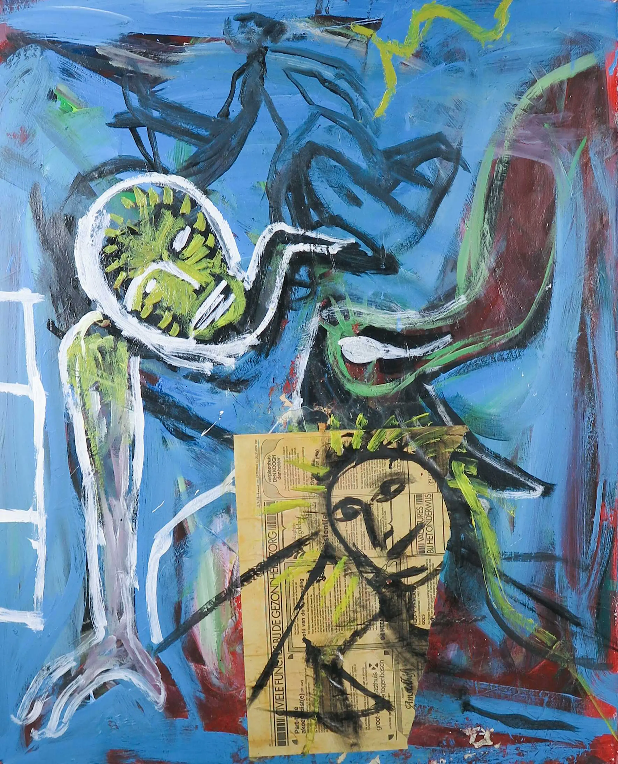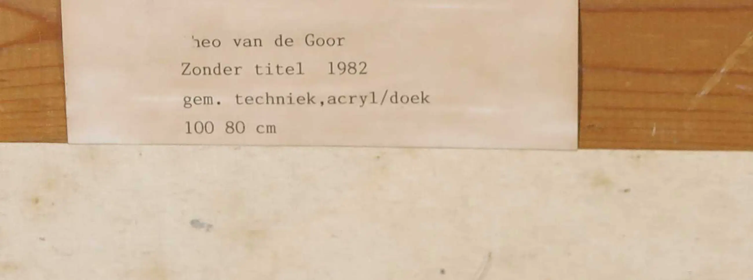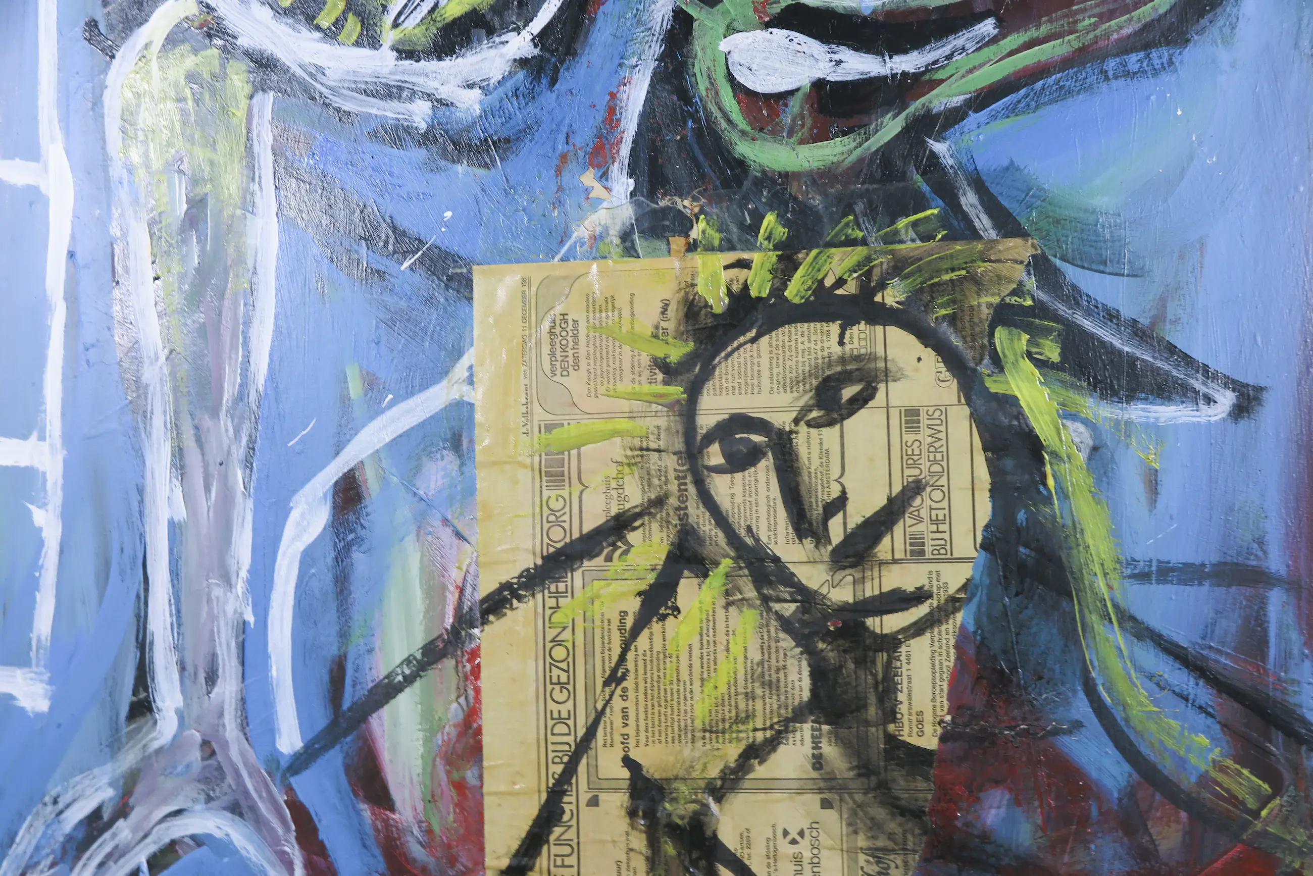 De onderzijde heeft wat beschadigingen en resten van papier die tegen het werk geplakt zijn. Er loopt een scheur door het doek midden-onder / achter krantpagina die gerepareerd is (waarschijnlijk al door kunstenaar bij vervaardiging, zie foto achterzijde). Zie ook foto's. | |