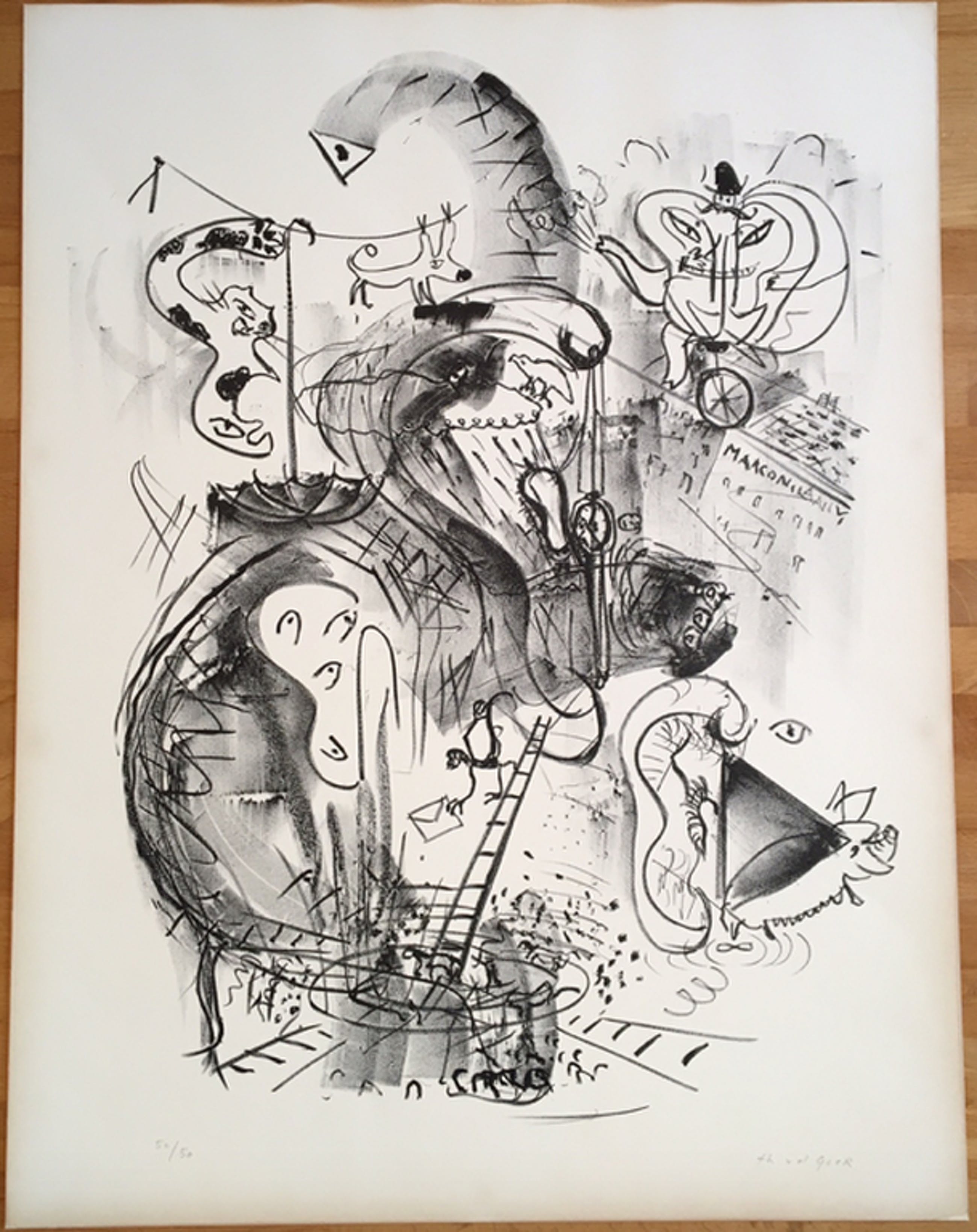 Theo van de Goor, zonder titel, 50/50 grafiek hand gesigneerd // werk is in goede staat lichte verkleuring aan papierraden niet op het werk.