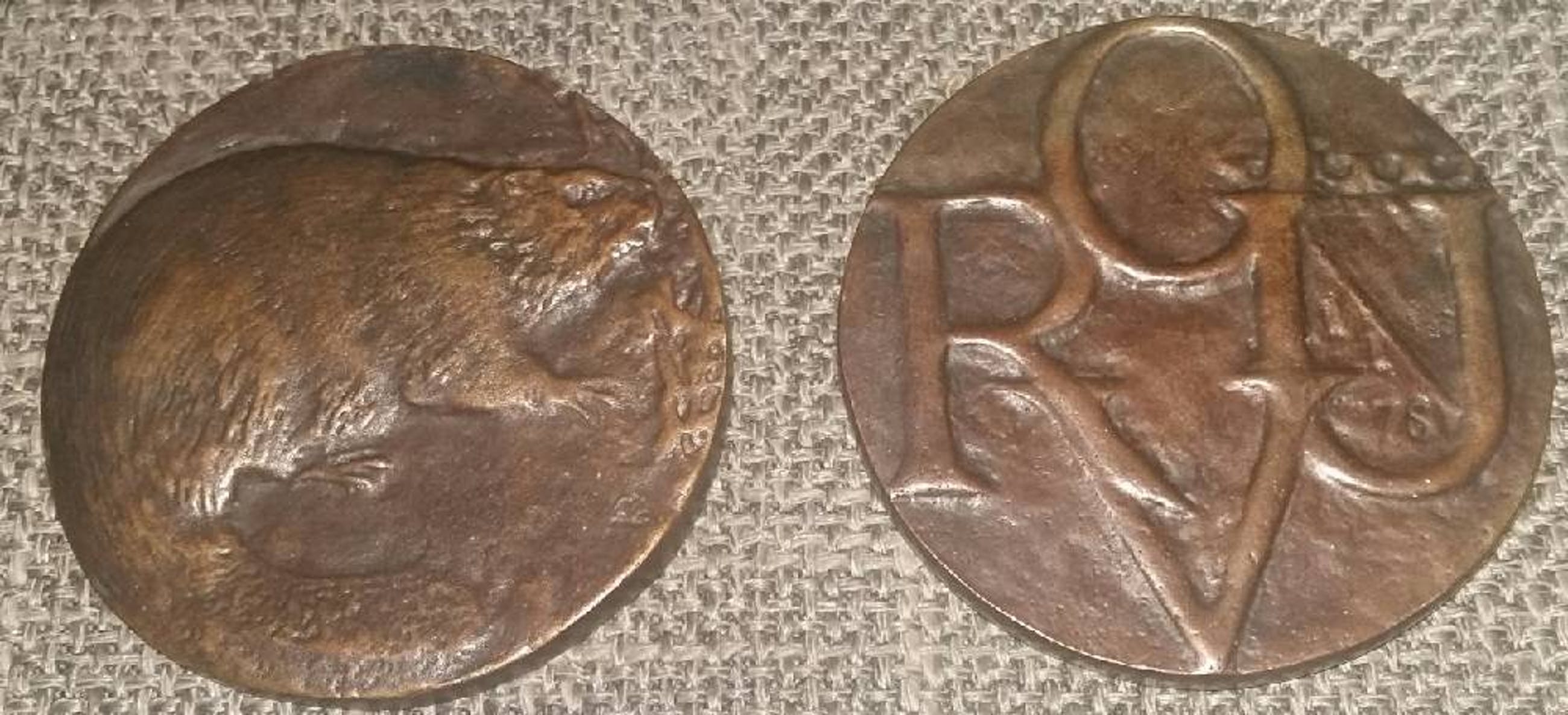 Theo van de Vathorst (*1934) Penning voor de Dienst Ruimtelijke Ordening en Volkshuisvesting (ROVU) van de Gemeente Utrecht, 1978. Voorzijde: Bever bij zijn bouwstelsel. Keerzijde: Logo met daarin verwerkt het Utrechts stadswapen. Brons, gegoten, De opgegeven maten zijn niet correct. Diameter is 7,1 cm de dikte van de penning is ca 4 mm