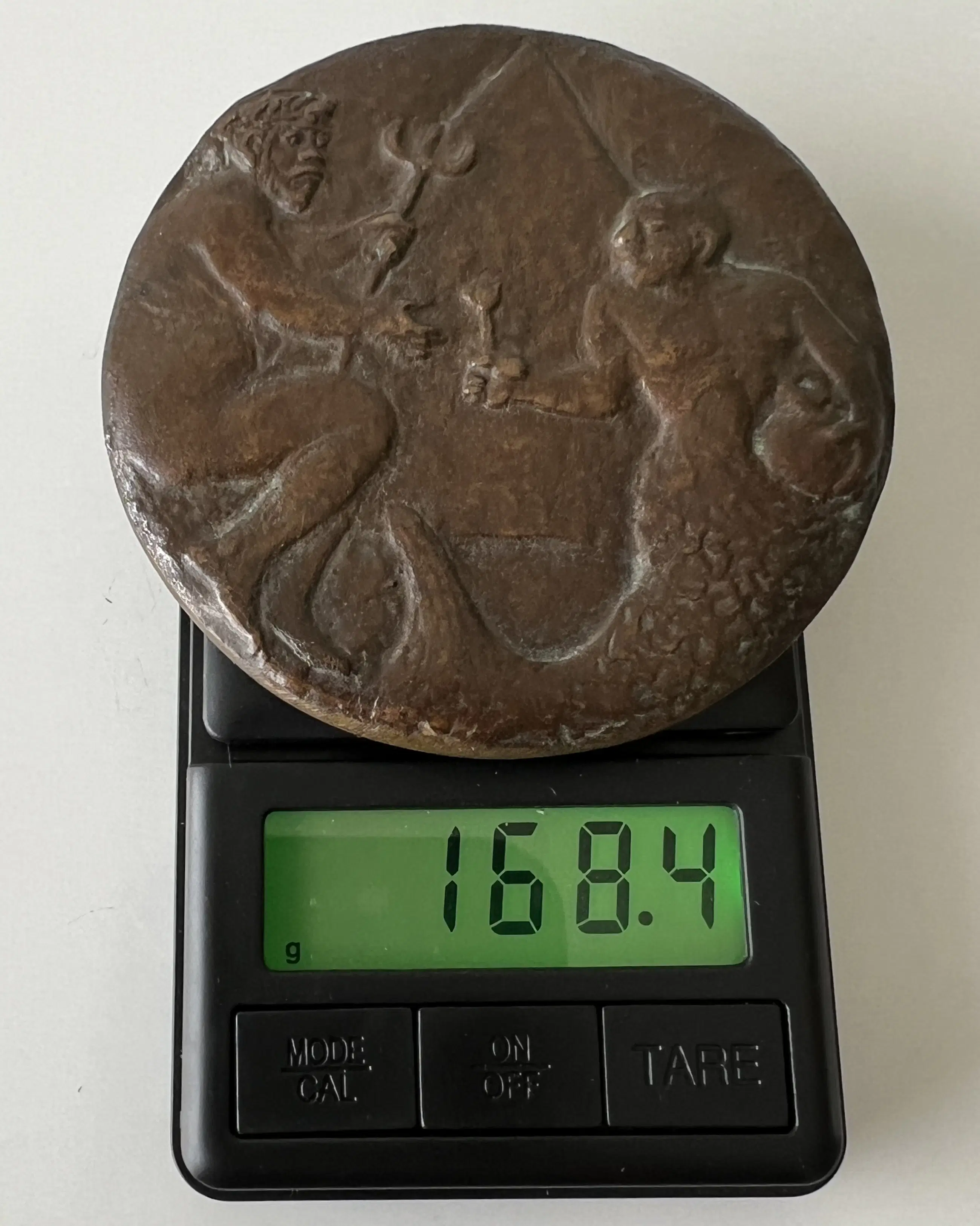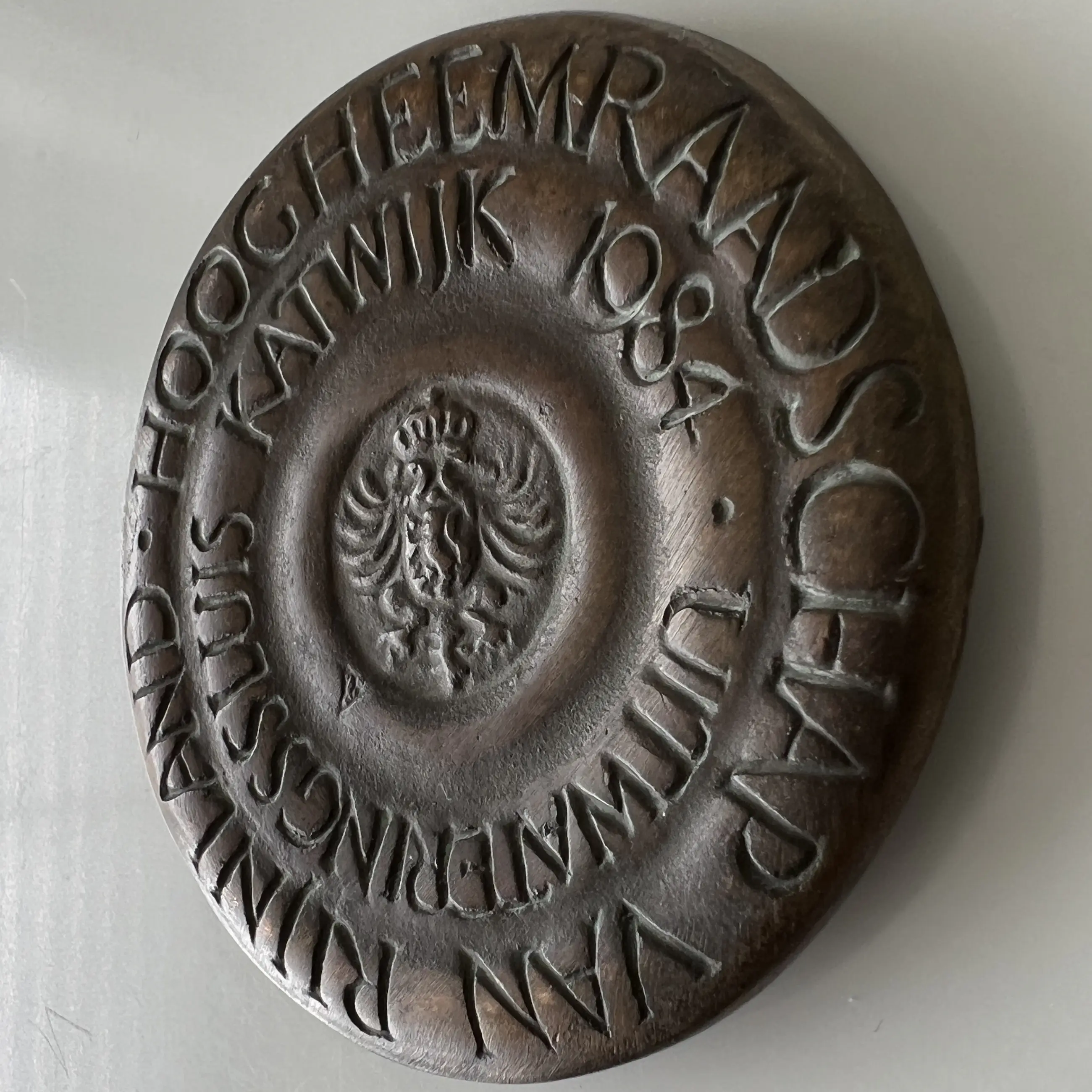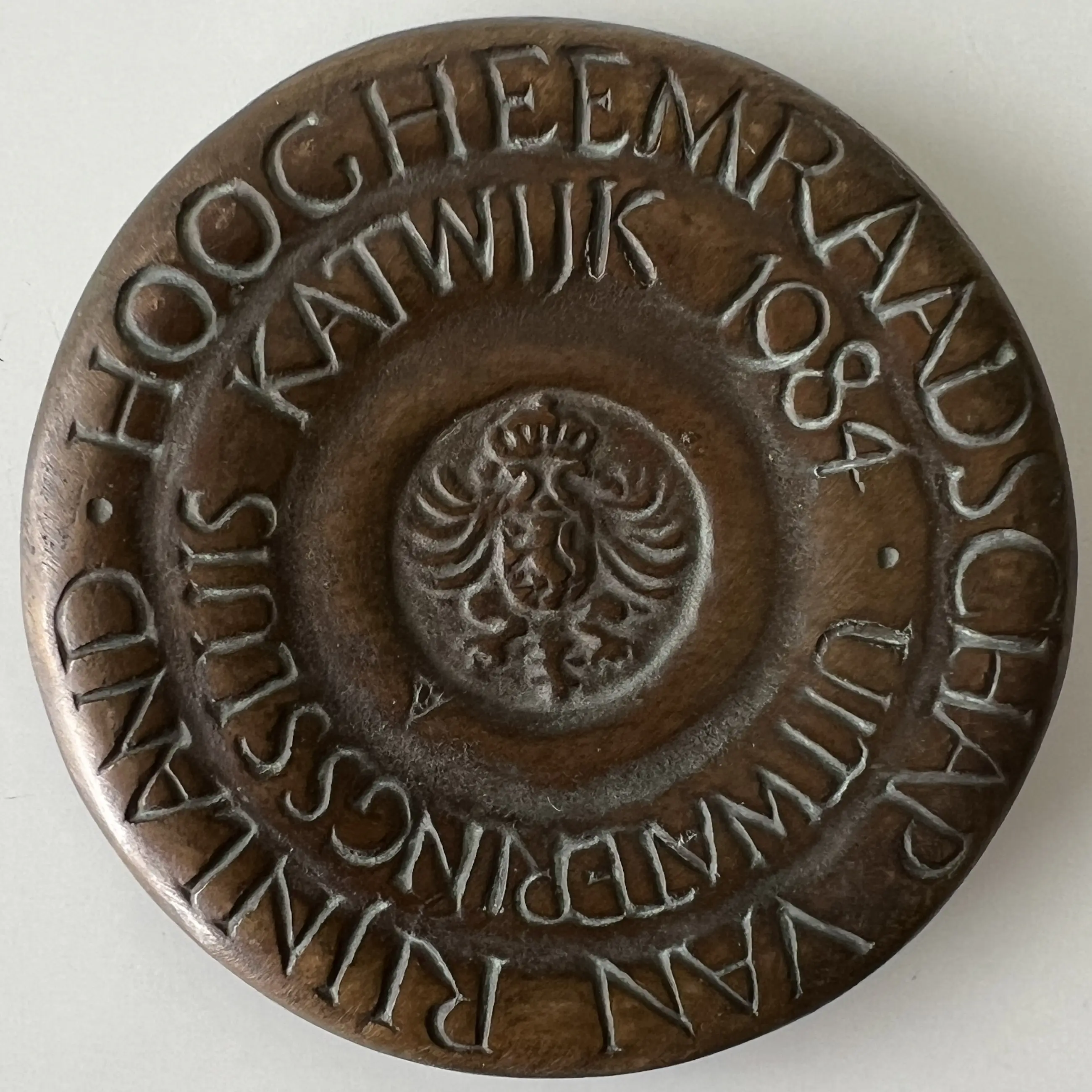 Deze bronzen penning werd uitgegeven door het hoogheemraadschap van Rijnland ter gelegenheid van de officiële ingebruikstelling van de nieuwe uitwateringssluis te Katwijk op 14 maart 1984.