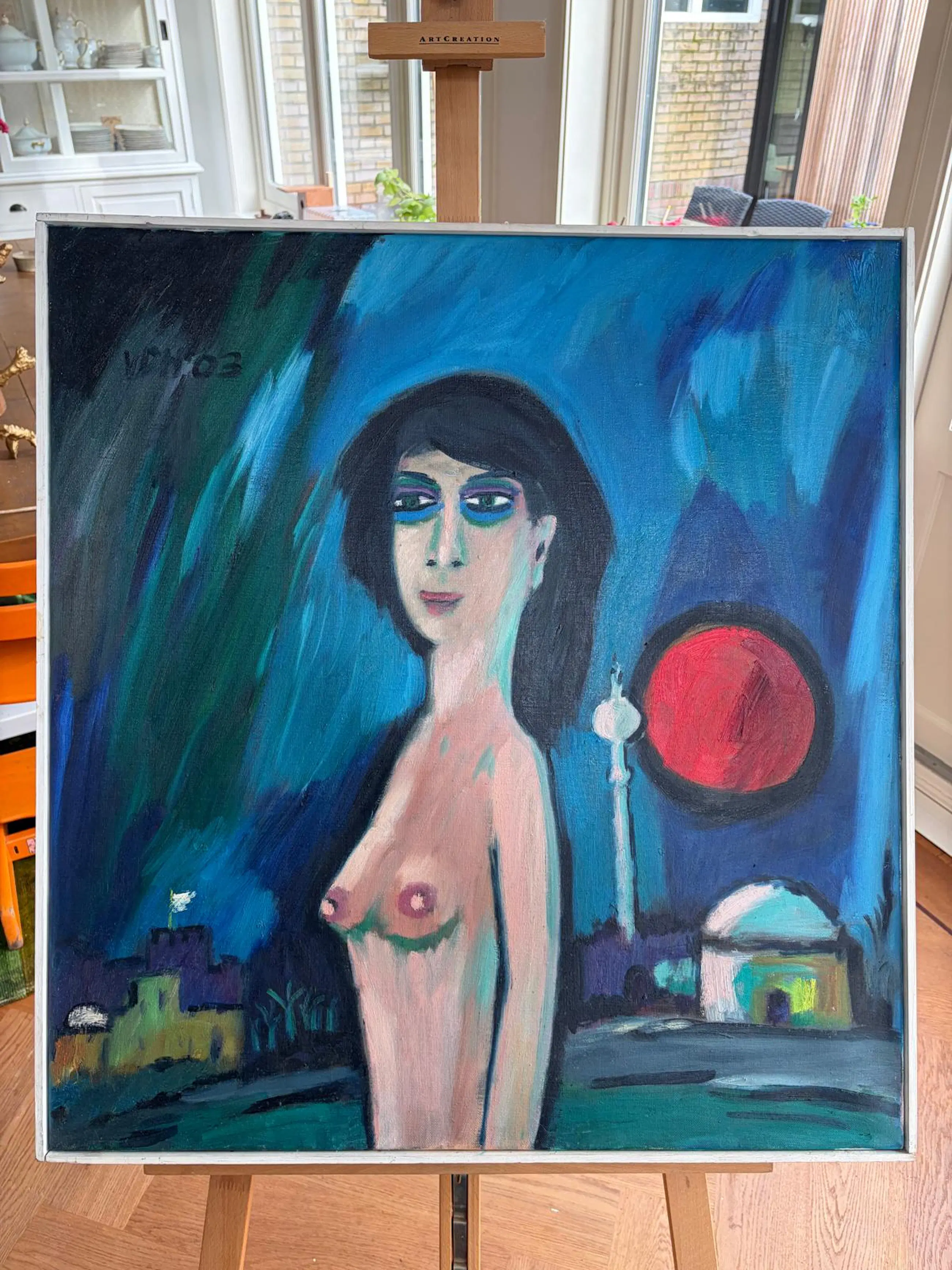 Naaktschilderij ( titel: feestelijk naakt in Mekka ) van de kunstenaar Theo van der Horst (1921-2003). Ingelijst en gesigneerd links boven. Gedateerd 2003. Afmetingen met lijst: 76,5 cm. x 82 cm. Doekmaat: 75 cm. x 80 cm. Conditie: heel goed. Gezien de grootte en kwetsbaarheid verdient het grote voorkeur dit werk bij ons op te halen in Amersfoort. Wij bieden nog een groot schilderij van deze kunstenaar aan op Kunstveiling.
