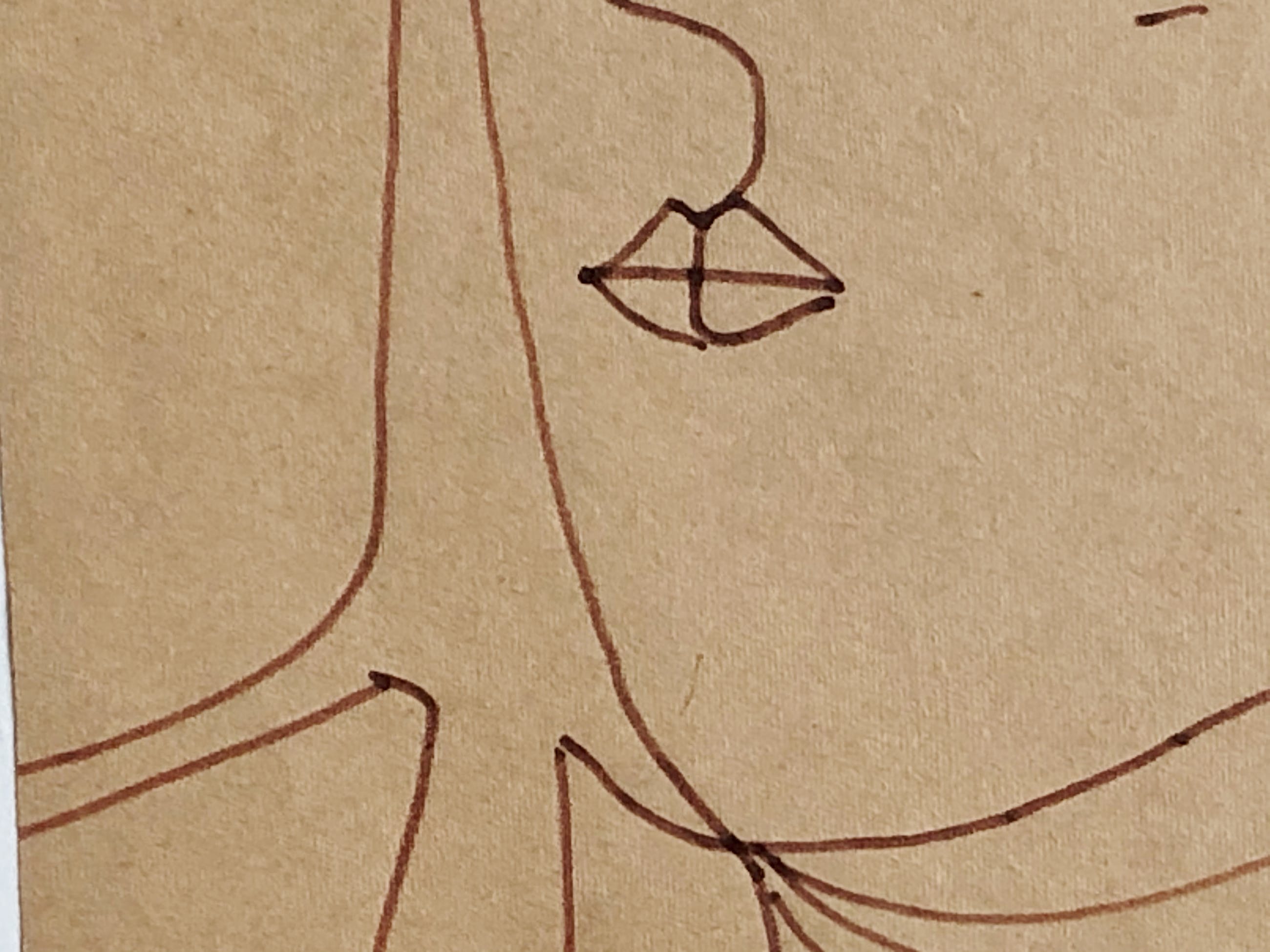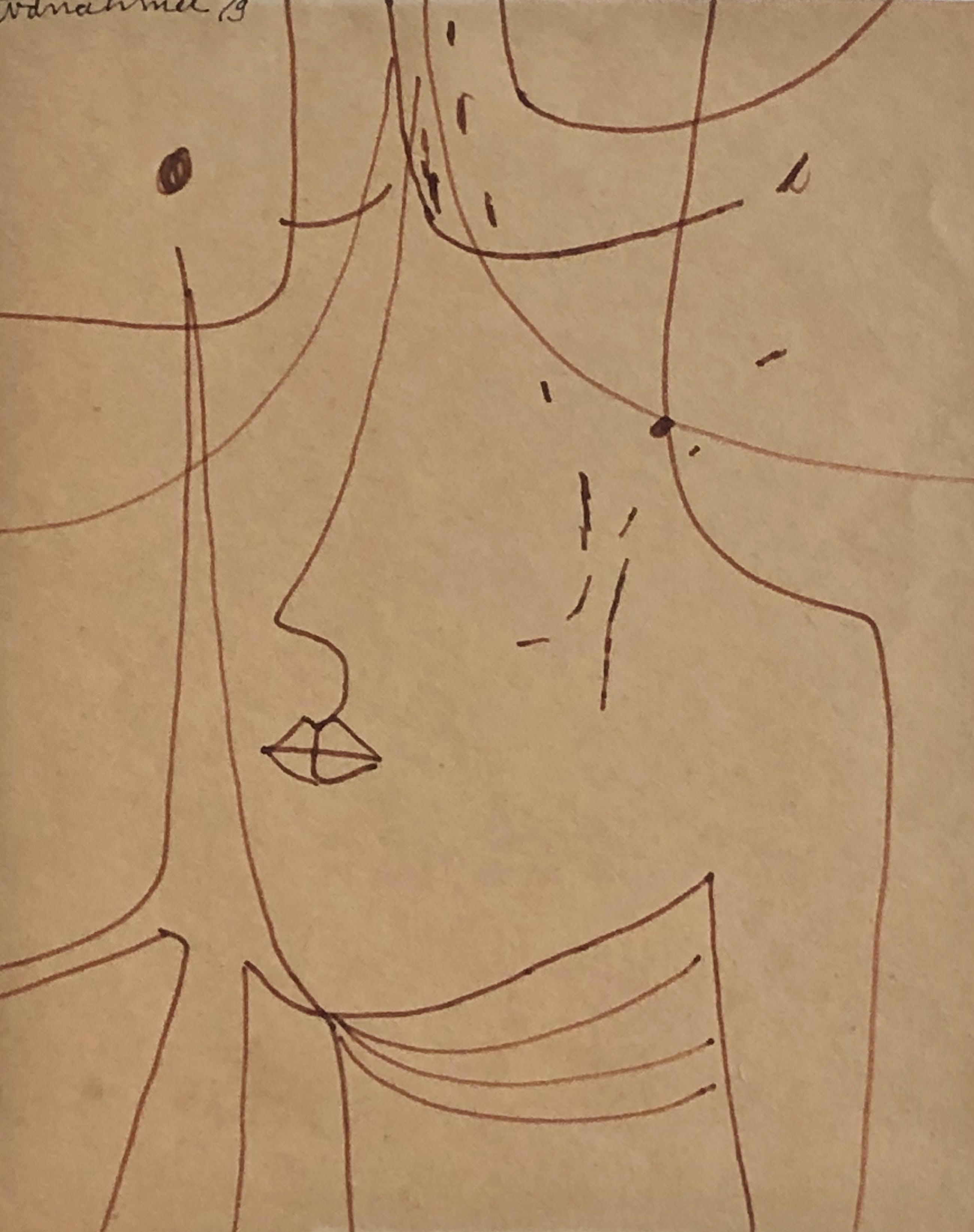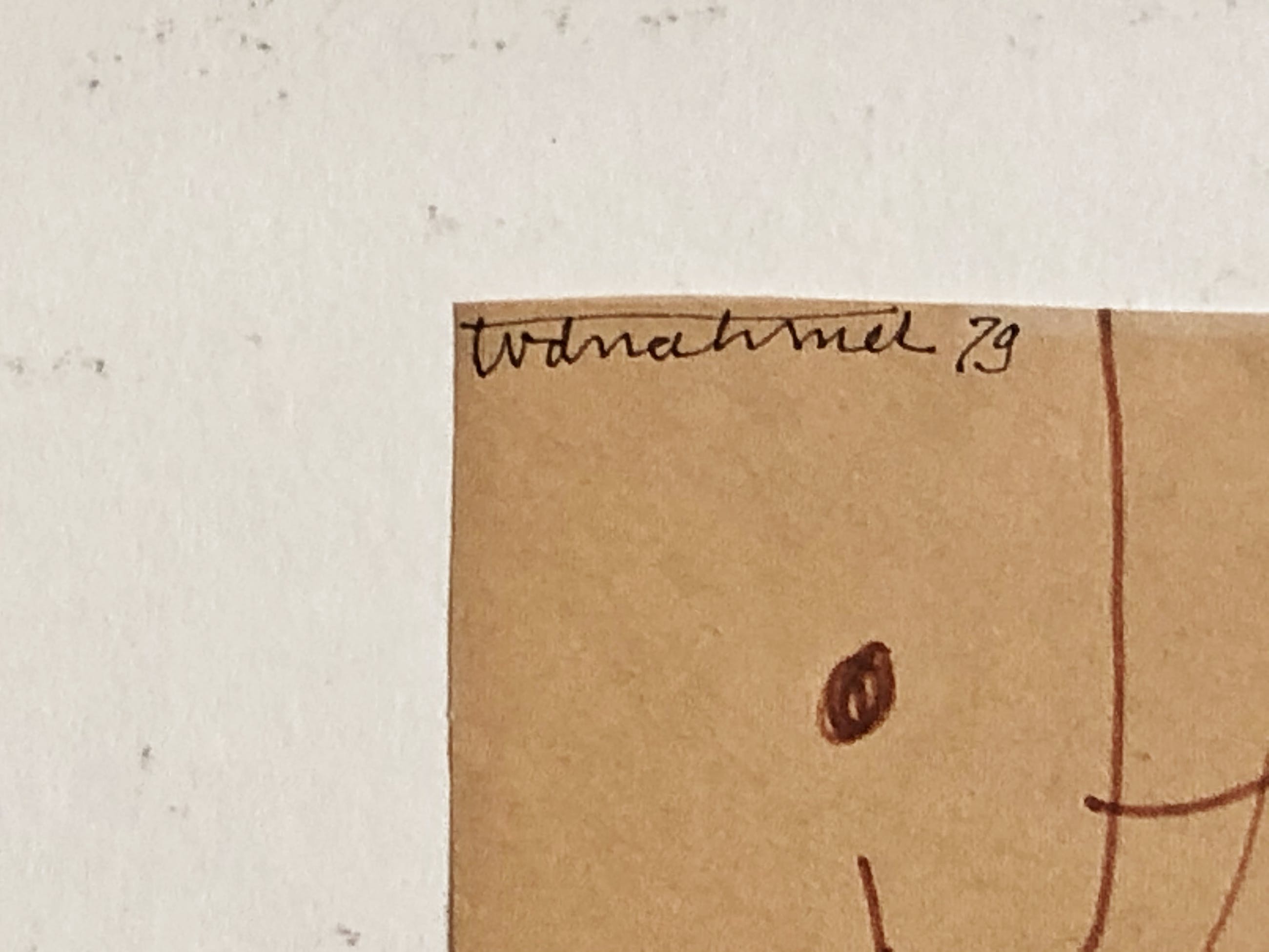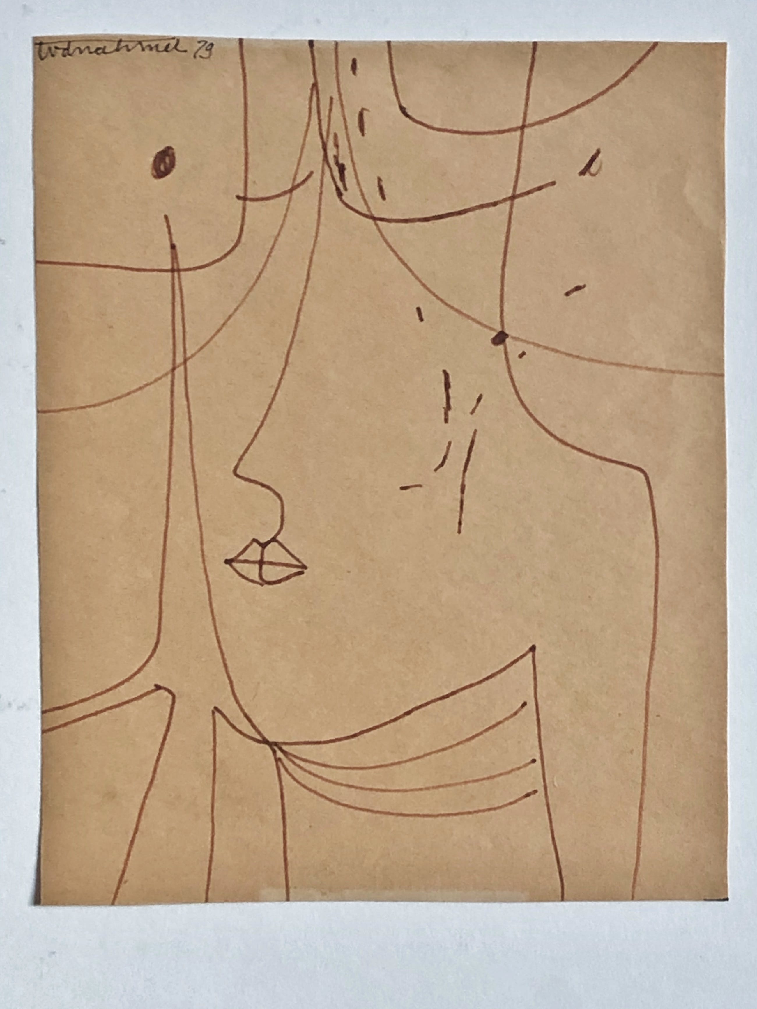Tekening in bruine viltstift op geelbruin papier. Signatuur “tvdnahmer” in