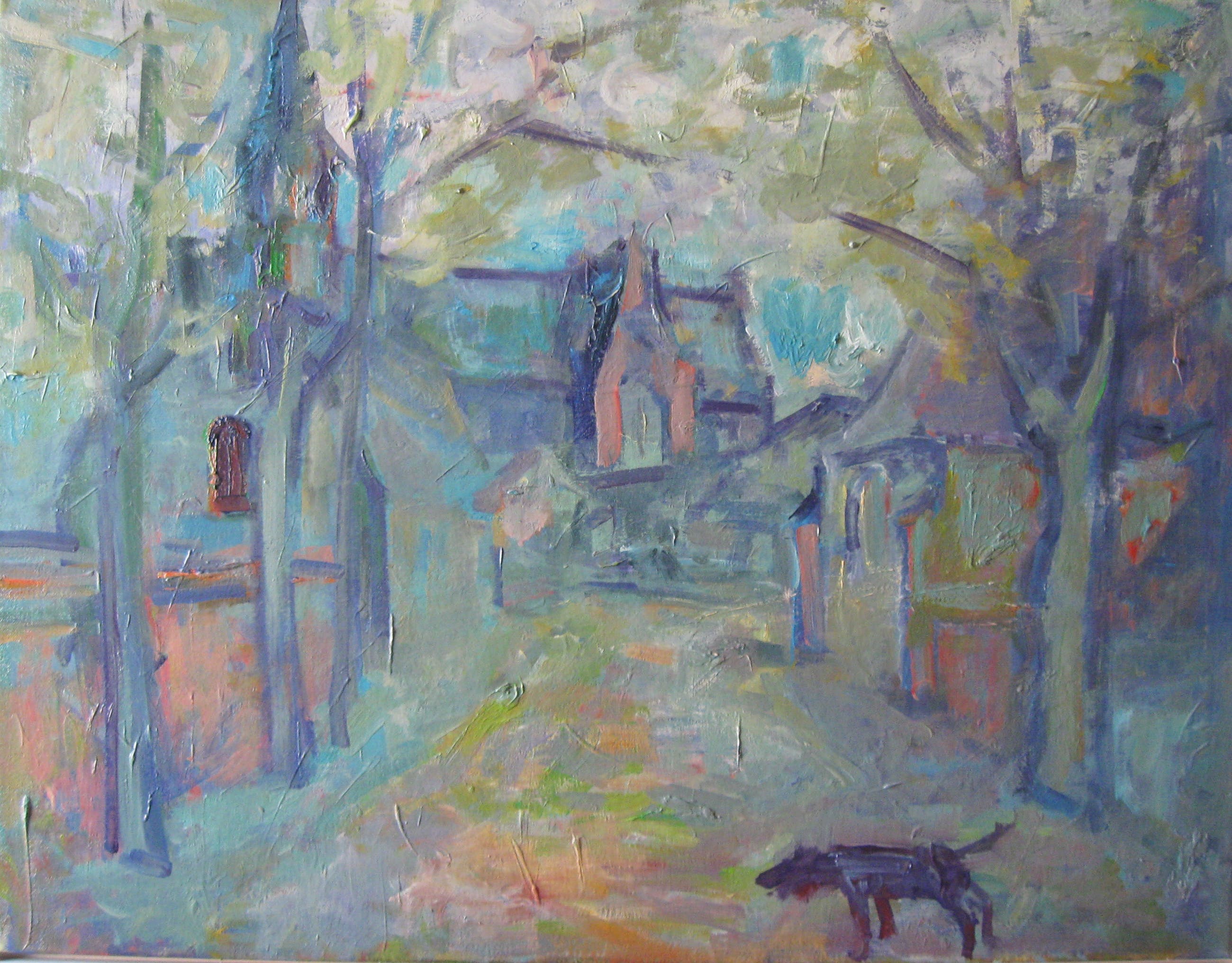 "Alem", van Theo van der Steen (1952). Geschilderd met olieverf op linnen. In met transparant wit geschilderde houten baklijst. Alem is een dorp aan de Maas ten noordwesten van Oss. Gesigneerd en gedateerd rechtsboven in de verf. Theo van der Steen kreeg zijn opleiding aan de academies van Den Bosch en Antwerpen. Hij woont en werkt in Tilburg en heeft een website.