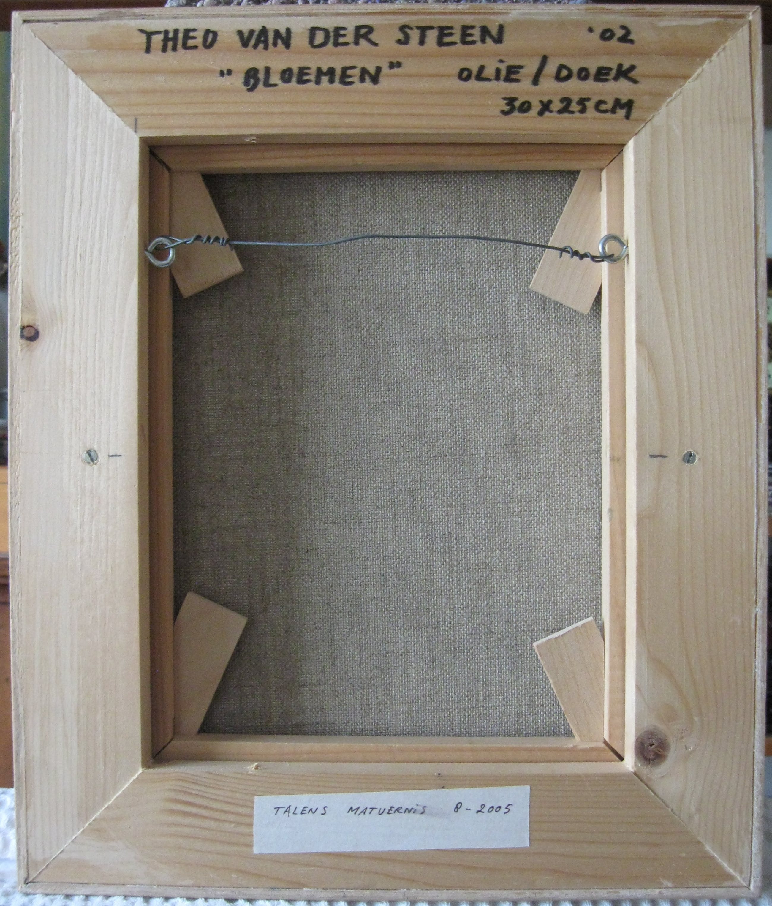 Bloemenschilderij van Theo van der Steen (1952). Geschilderd met olieverf op linnen. Gesigneerd en gedateerd in de verf. In met transparant wit geschilderde houten baklijst. Theo van der Steen kreeg zijn opleiding aan de academies van Den Bosch en Antwerpen. Hij woont en werkt in Tilburg en heeft een website.