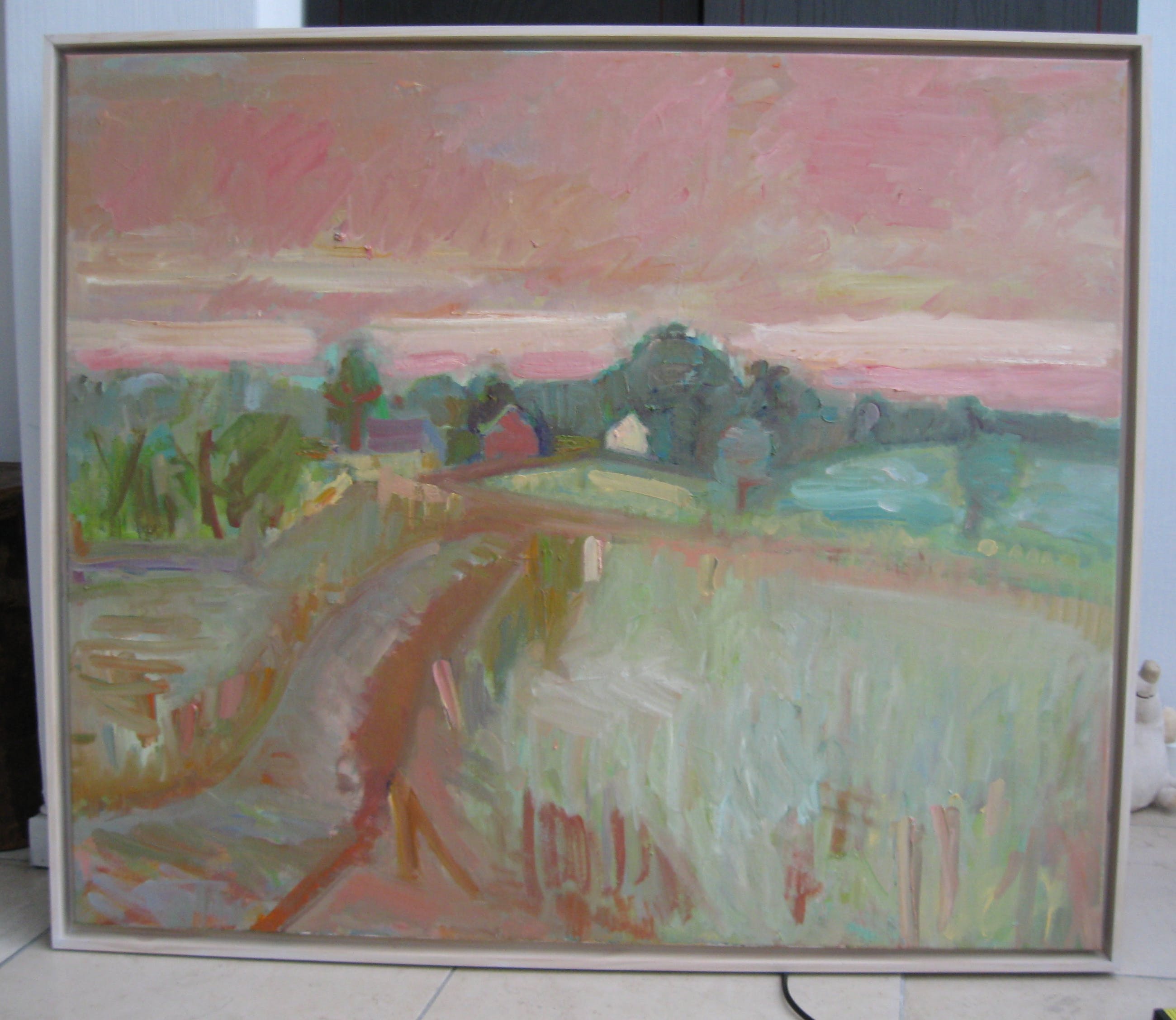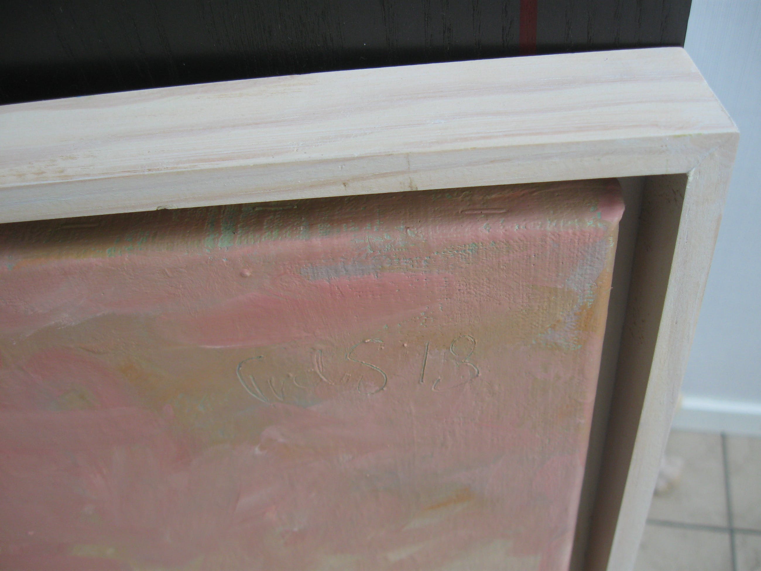 Schilderij zit goed opgespannen op spieraam. Geen beschadigingen. In perfecte staat. Voorzien van houten baklijst.