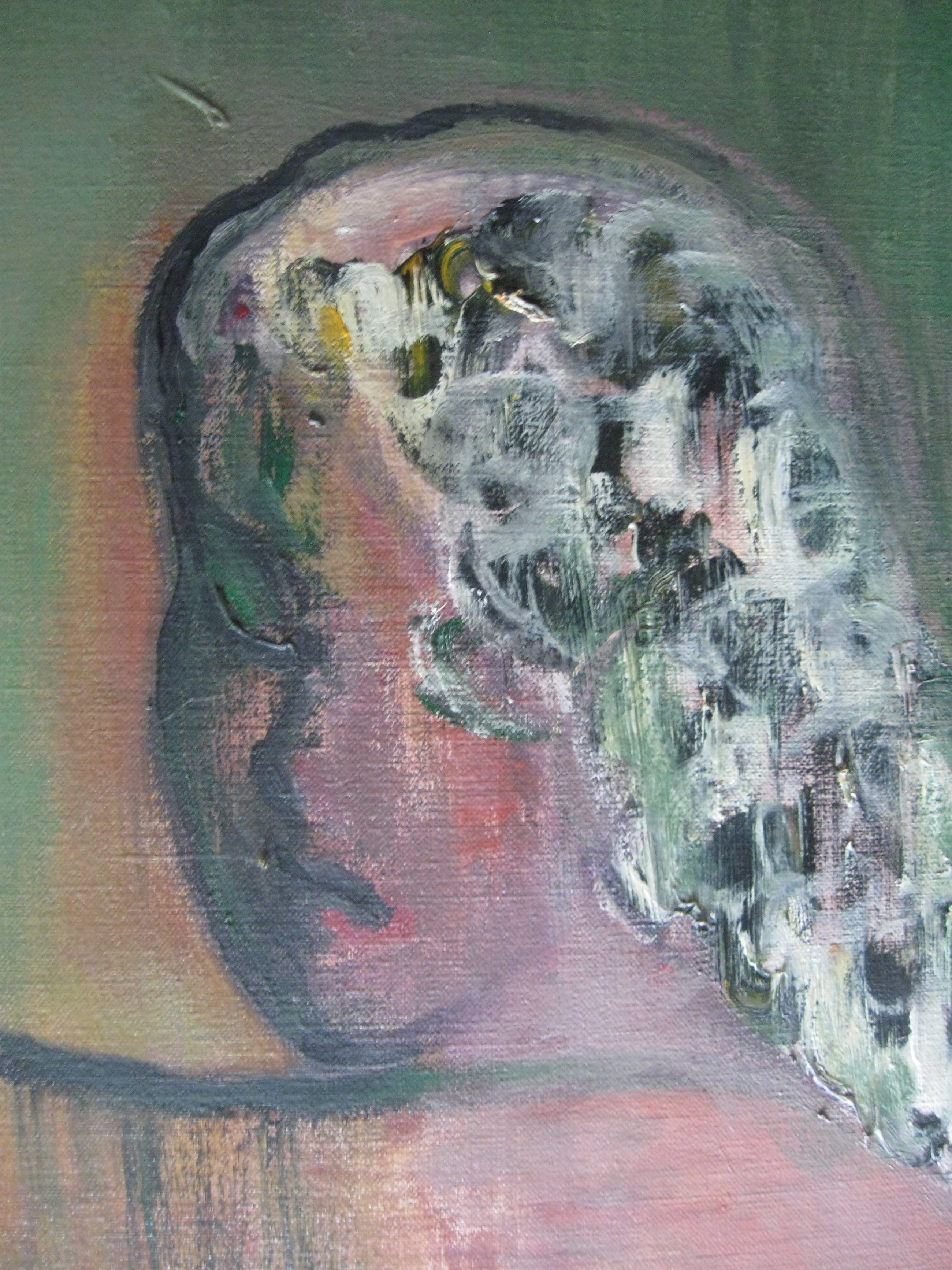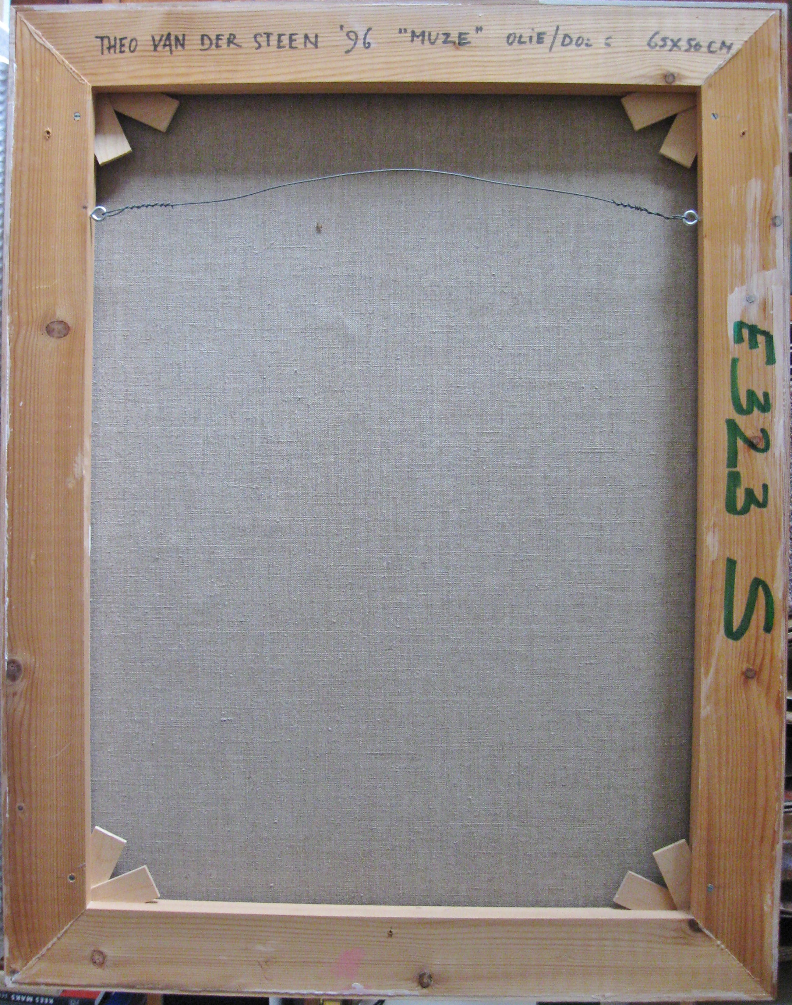 "Muze" van Theo van der Steen (1952). Geschilderd in 1996 met olieverf op linnen. In met transparant wit geschilderde houten baklijst. Gesigneerd en gedateerd linksonder. Theo van der Steen kreeg zijn opleiding aan de academies van Den Bosch en Antwerpen. Hij woont en werkt in Tilburg en heeft een website.