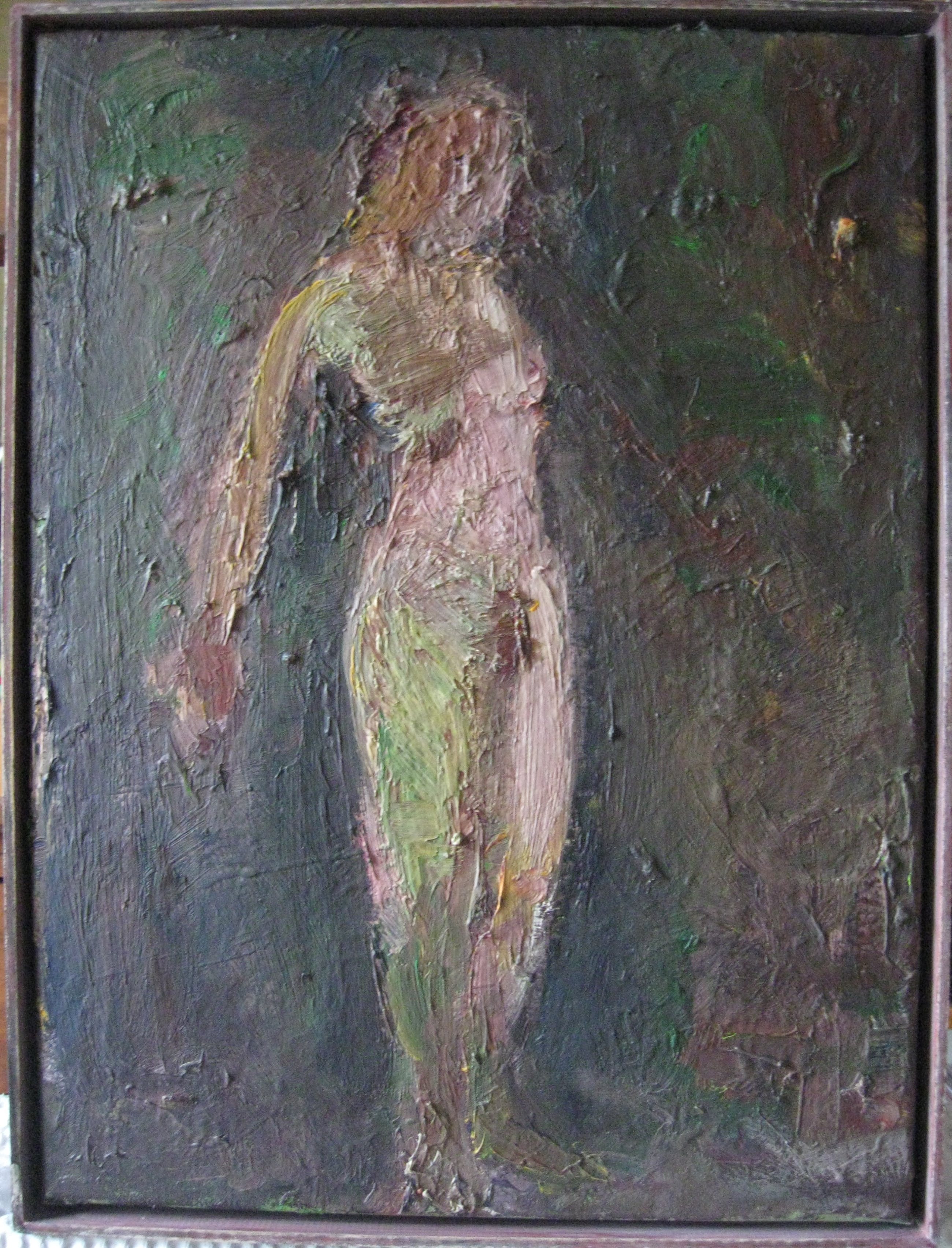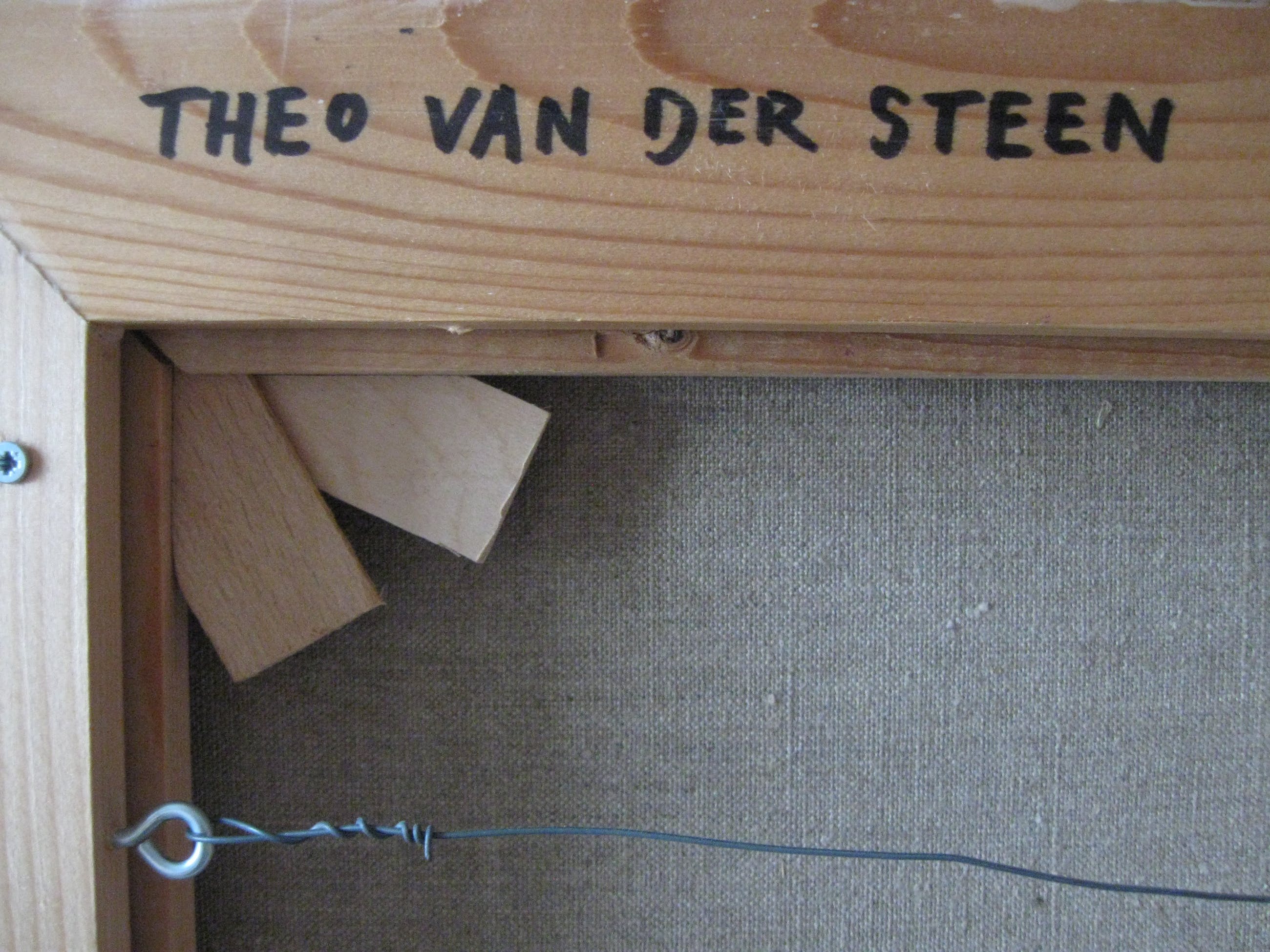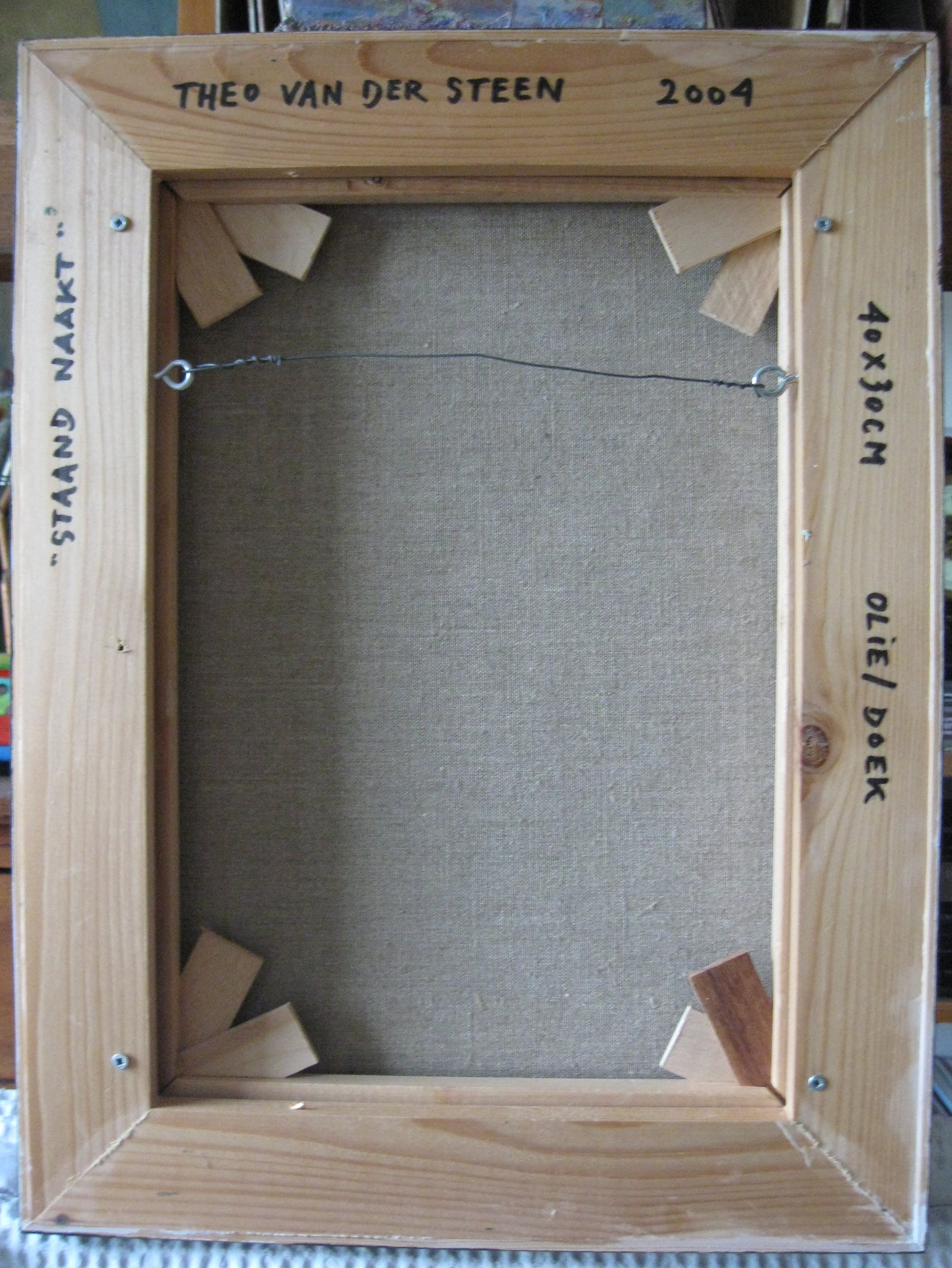 "Staand naakt" van Theo van der Steen (1952). Geschilderd met olieverf op linnen. In met acrylverf geschilderde houten baklijst (origineel). Theo van der Steen kreeg zijn opleiding aan de academies van Den Bosch en Antwerpen. Hij woont en werkt in Tilburg en heeft een website.