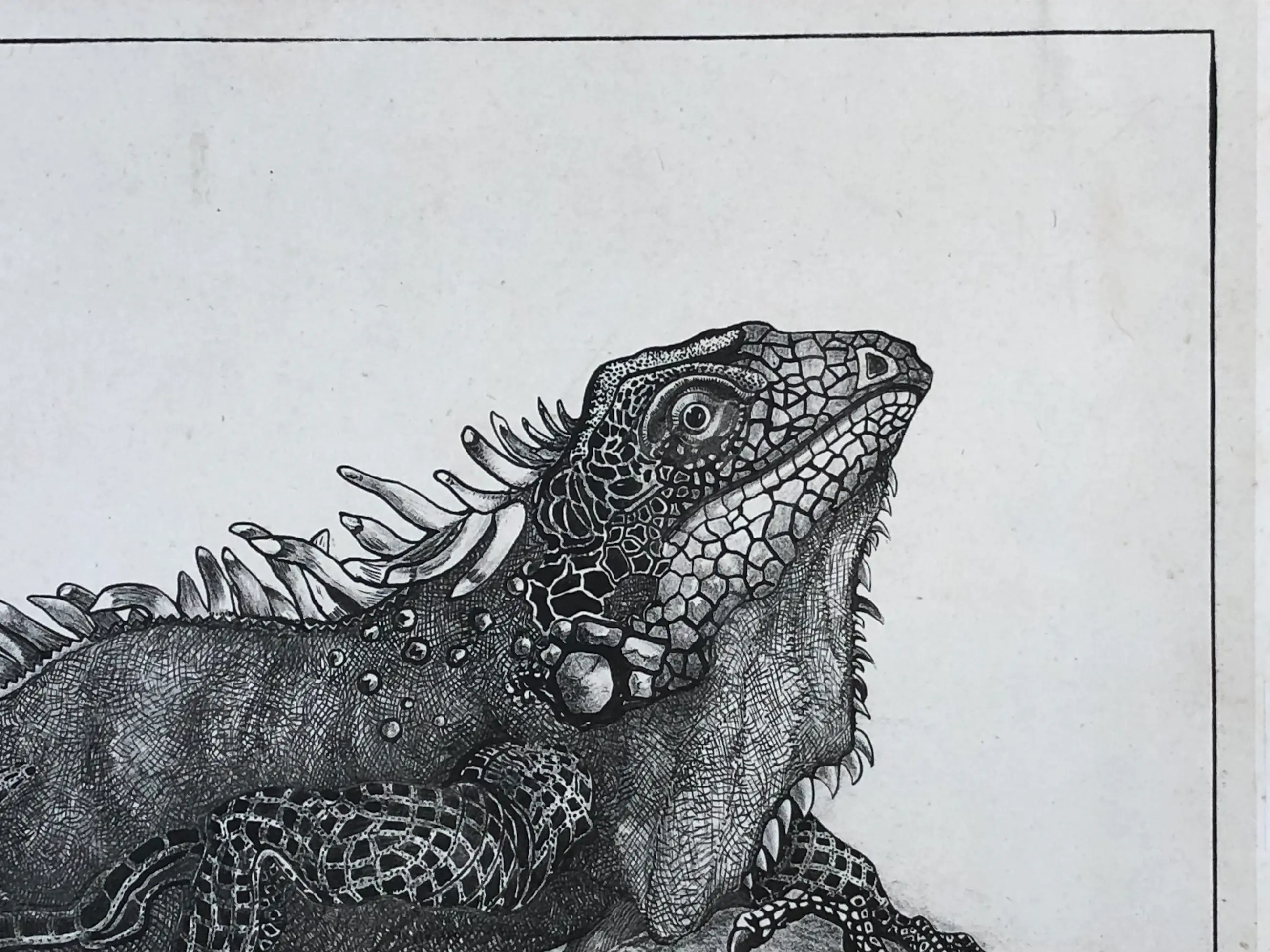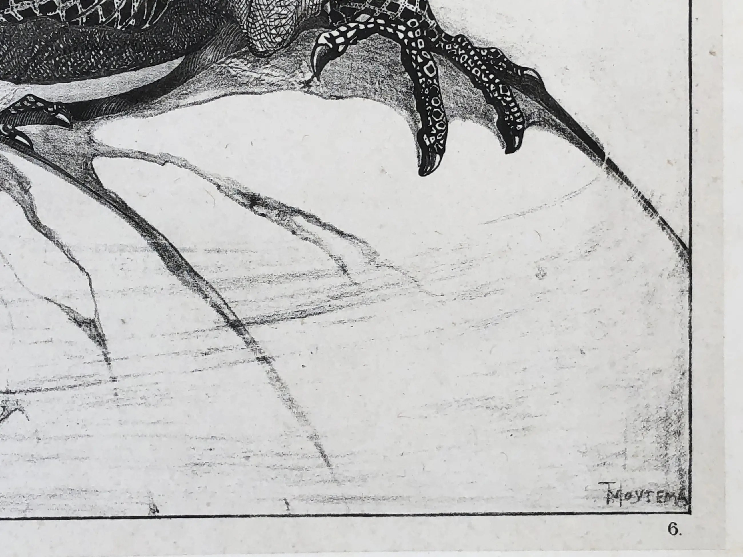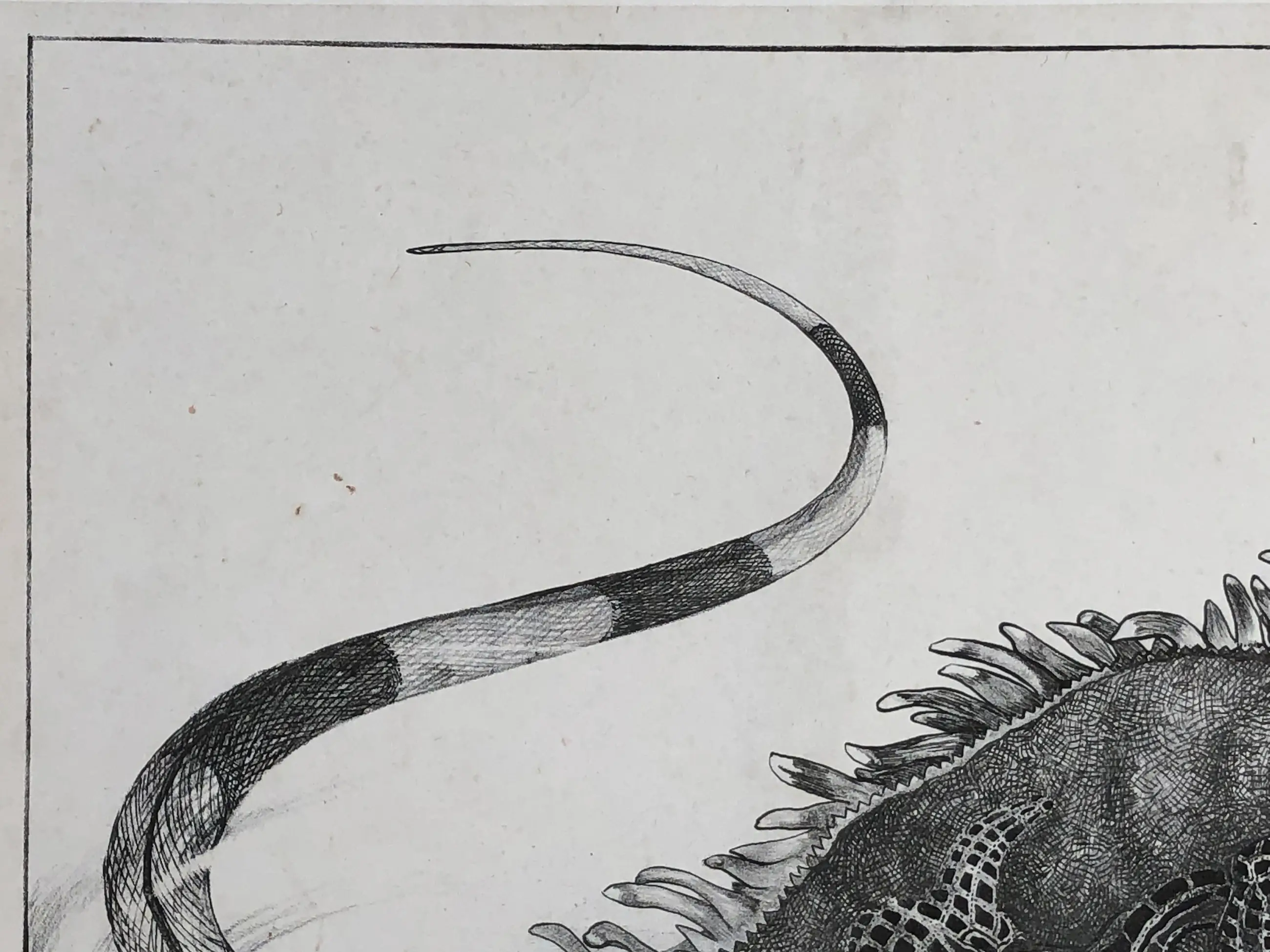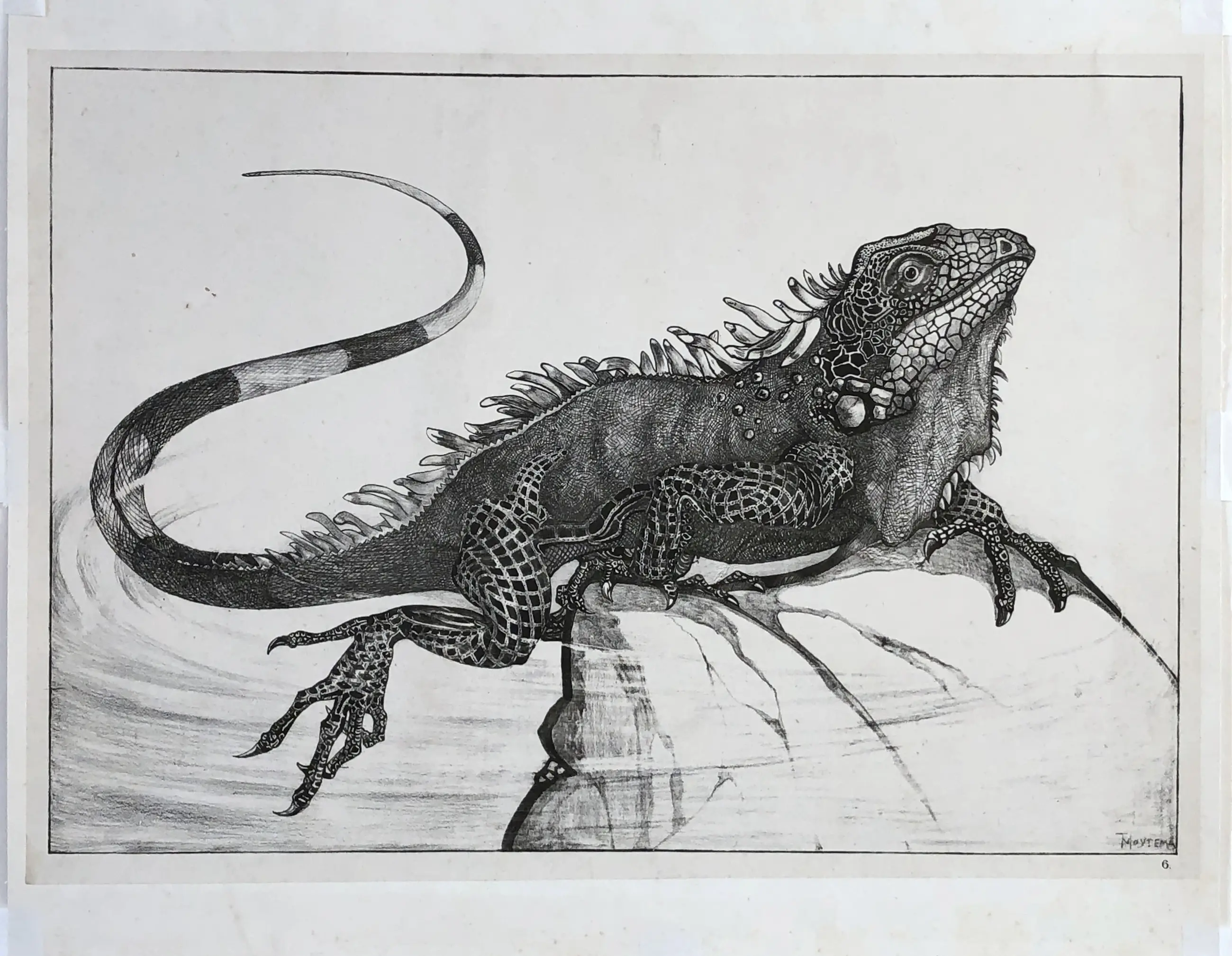 Grote litho van een leguaan, zittend op een steen in het water. Dit is nr.6 uit de serie van zes grote dierstudies uit 1898, waaronder behalve de leguaan o.a. de beroemde angorakonijnen en de zilverreiger. De zes litho’s worden vanwege hun uiterst gedetaillerde uitwerking beschouwd als het belangrijkste lithografische werk van Van Hoytema. De zes litho’s zijn uitgegeven als map en slechts zeer beperkt gesigneerd in potlood. De meeste signaturen in potlood zijn later toegevoegd, al dan niet door de kunstenaar. Zie o.a. Rijksmuseum / de Groot 90 (ii/III).