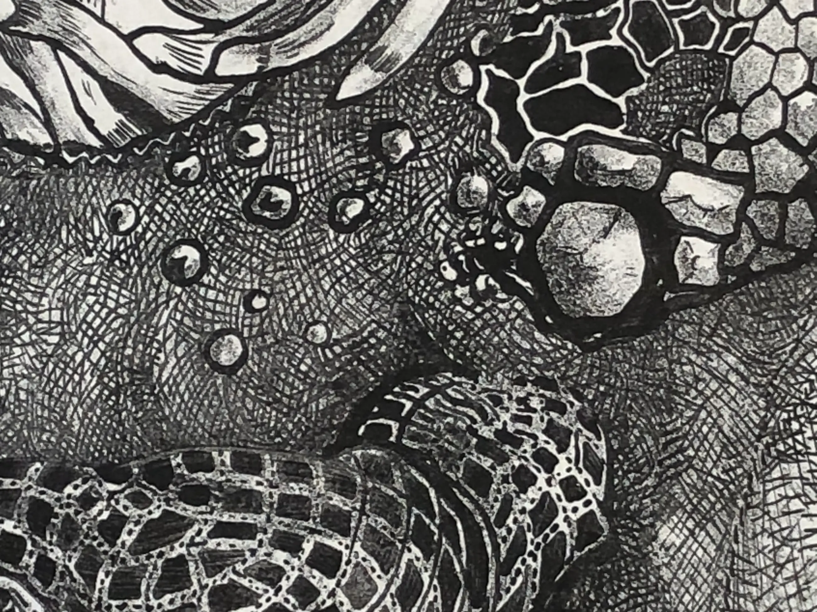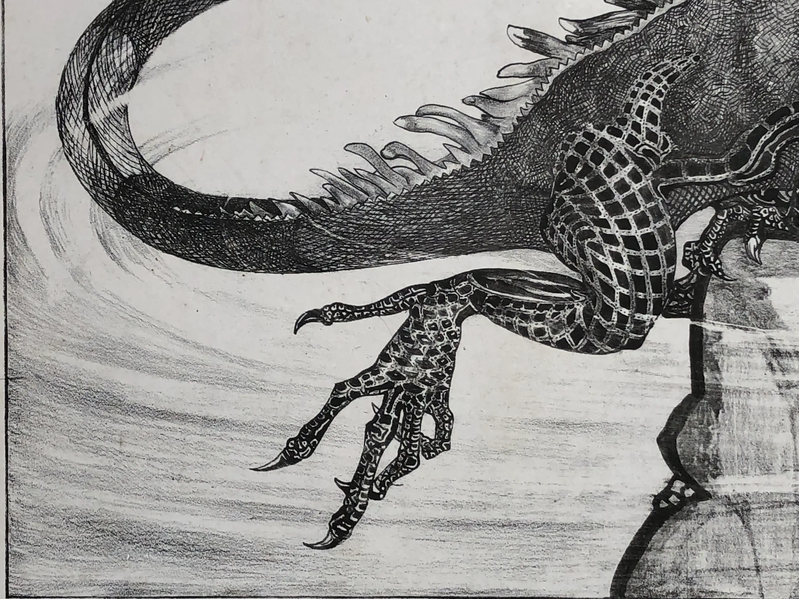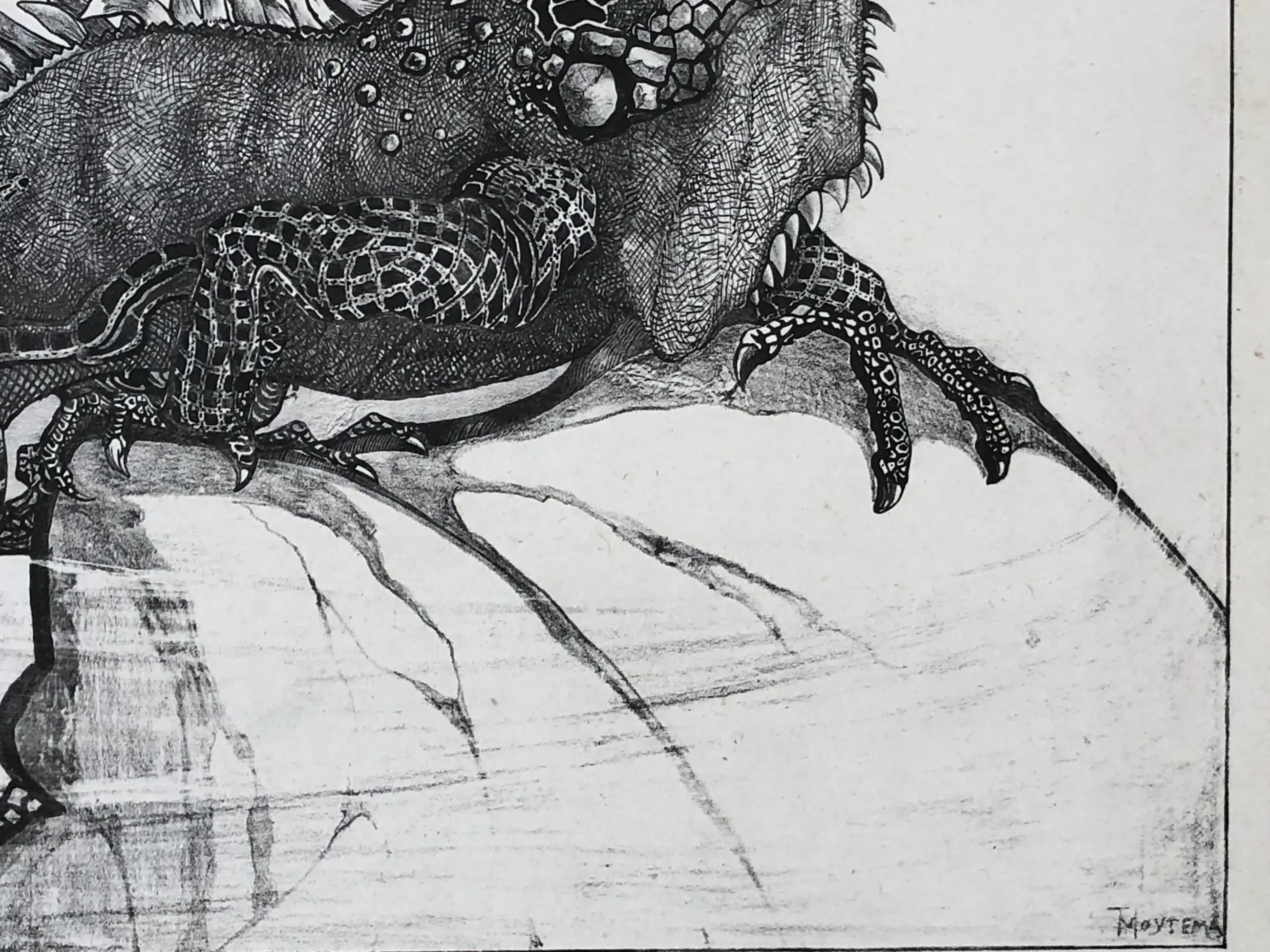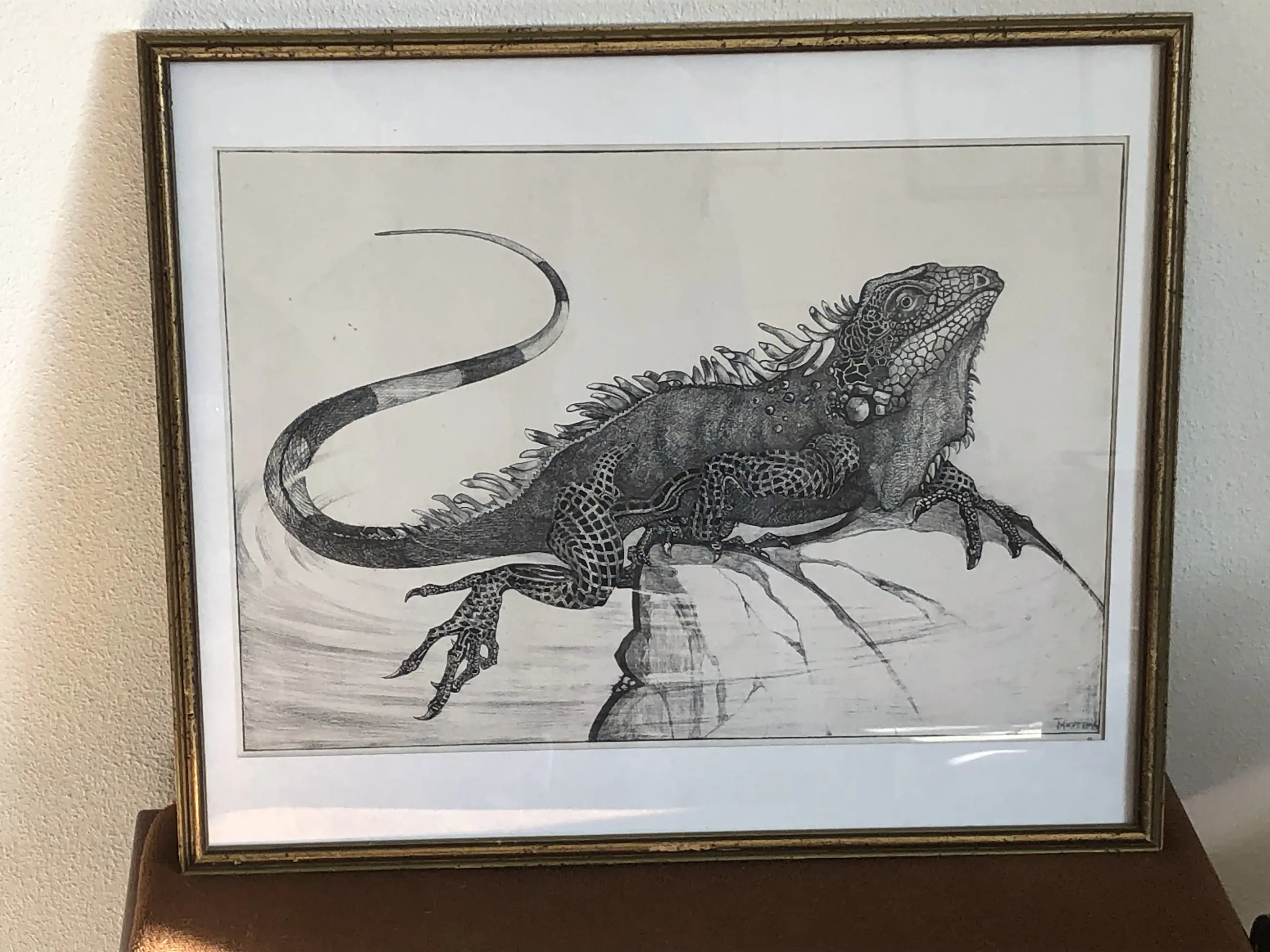 Grote litho van een leguaan, zittend op een steen in het water. Dit is nr.6 uit de serie van zes grote dierstudies uit 1898, waaronder behalve de leguaan o.a. de beroemde angorakonijnen en de zilverreiger. De zes litho’s worden vanwege hun uiterst gedetaillerde uitwerking beschouwd als het belangrijkste lithografische werk van Van Hoytema. De zes litho’s zijn uitgegeven als map en slechts zeer beperkt gesigneerd in potlood. De meeste signaturen in potlood zijn later toegevoegd, al dan niet door de kunstenaar. Zie o.a. Rijksmuseum / de Groot 90 (ii/III).