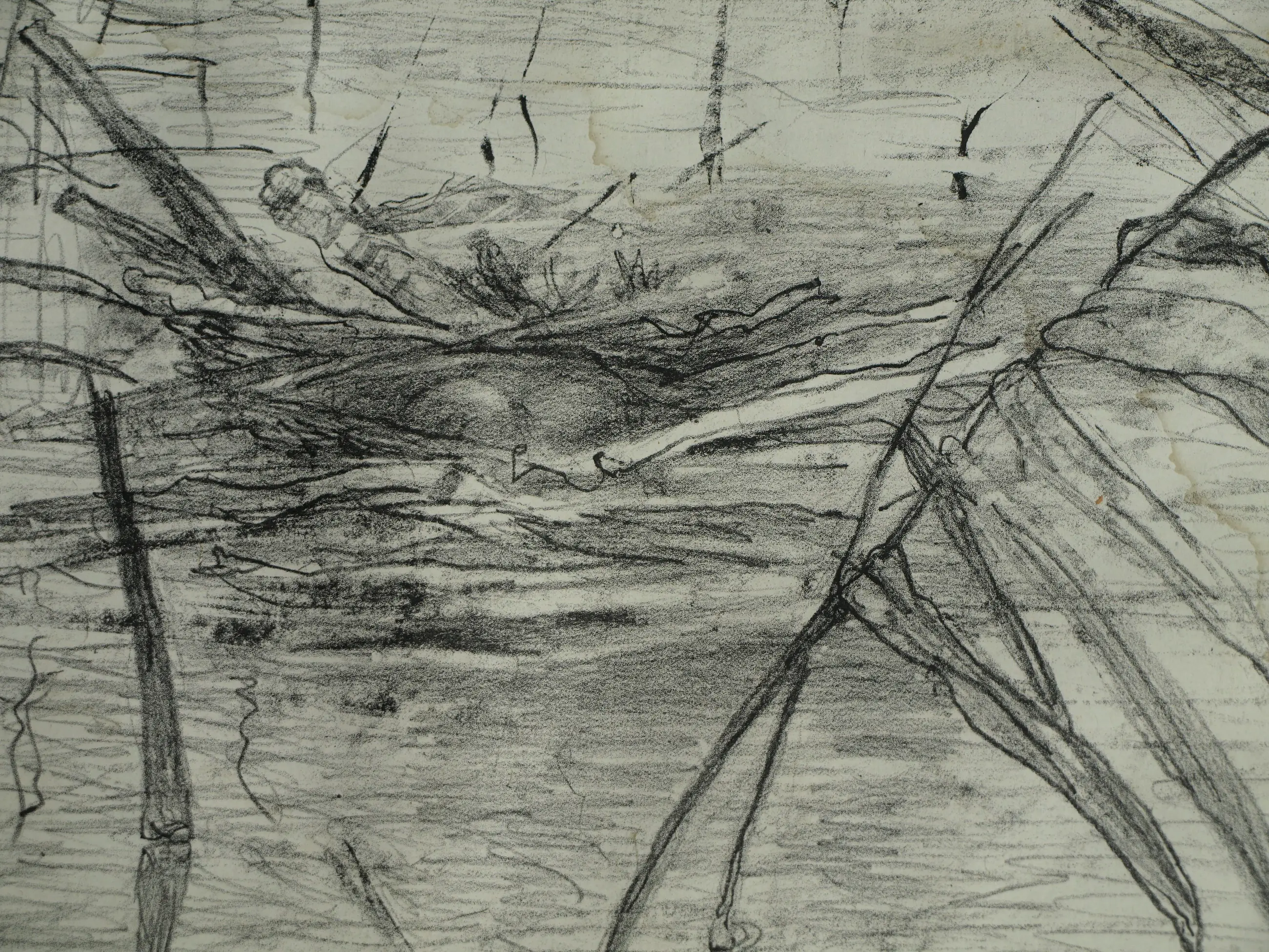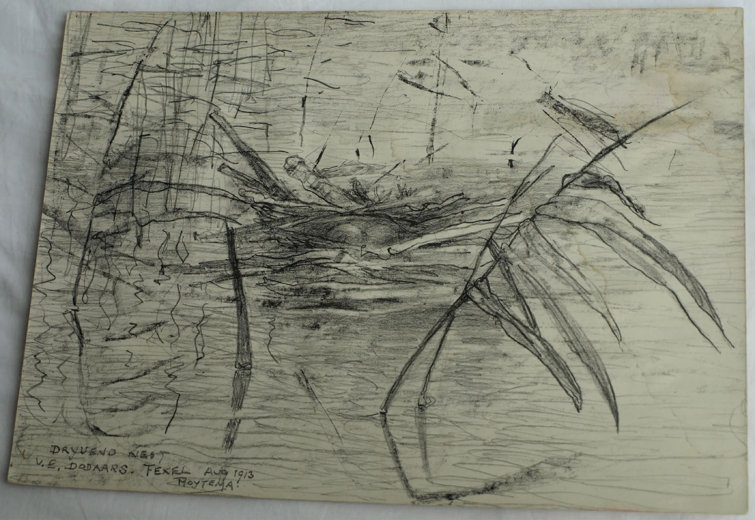Een litho uit 1913 van de Nederlandse kunstenaar Theo van Hoytema (1863-1917), met een voorstelling van het nest van een dodaars op het eiland Texel.