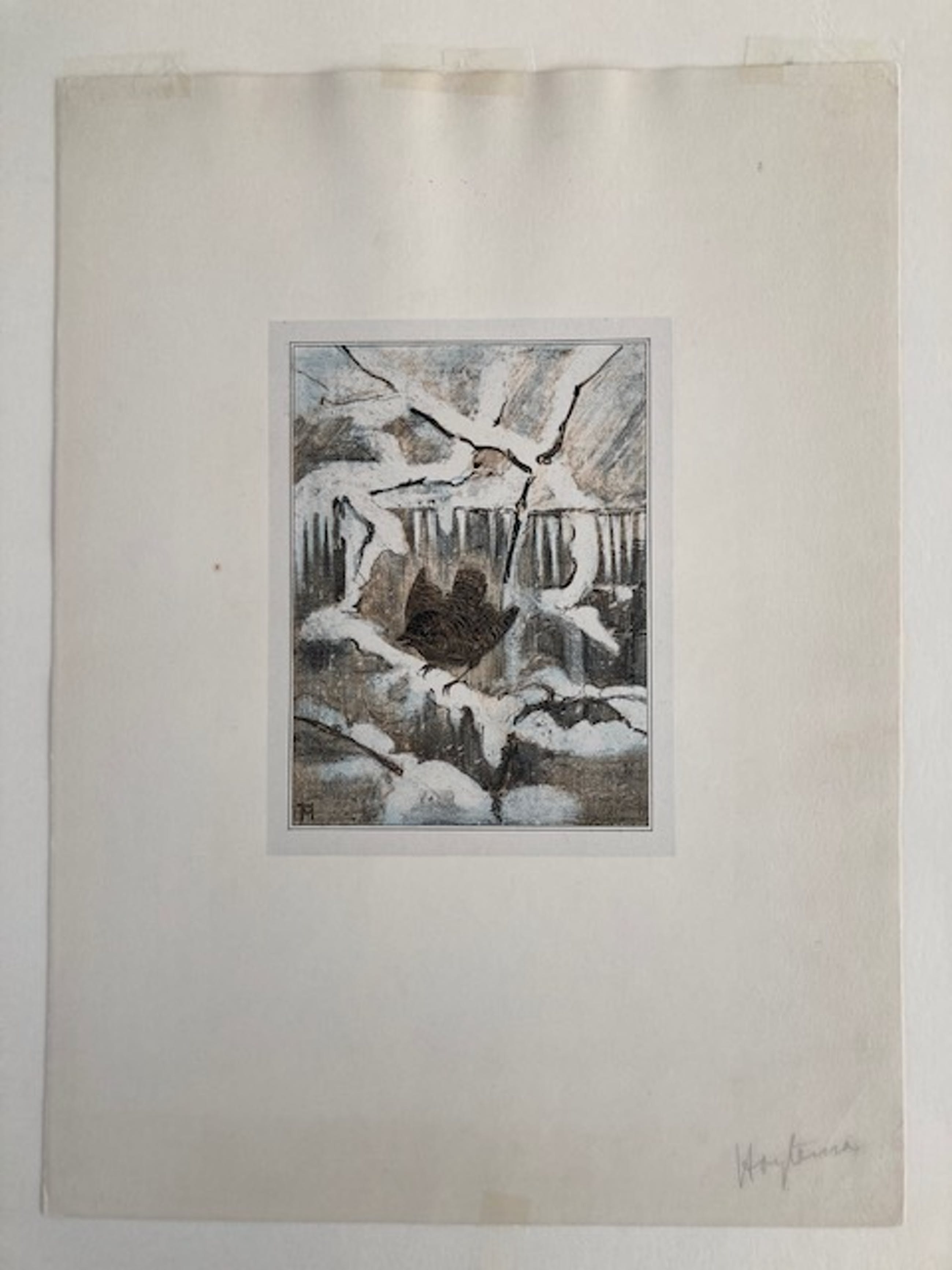 Fraaie werk van Theodoor Hoytema. Op het wit van het vel gesigneerd met potlood. Deze litho komt uit 1900 in 1907 is dezelfde prent uitgebracht in een kalender (december).