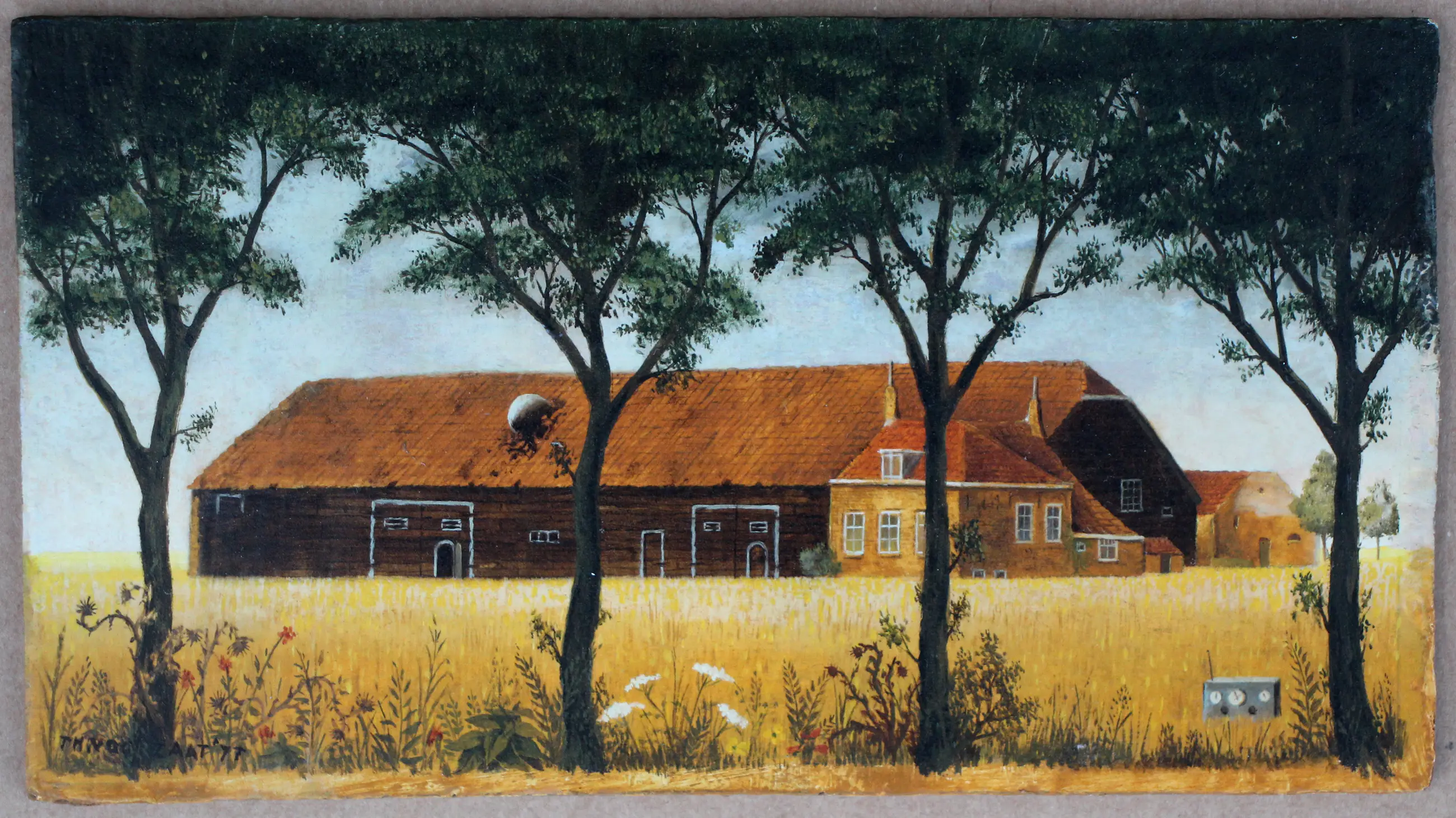 Olieverf op board, van Theo Voorzaat. Voorstelling van een gezicht op de boerderij. Jaar: 1977. Afmetingen werk: H10 x b18cm. Het werk is linksonder, gesigneerd('THVoorzaat') en gedateerd, door de kunstenaar. De authenticiteit van het aangeboden werk wordt volledig gegarandeerd. Een certificaat van echtheid kan, op aanvraag, worden gemaild.