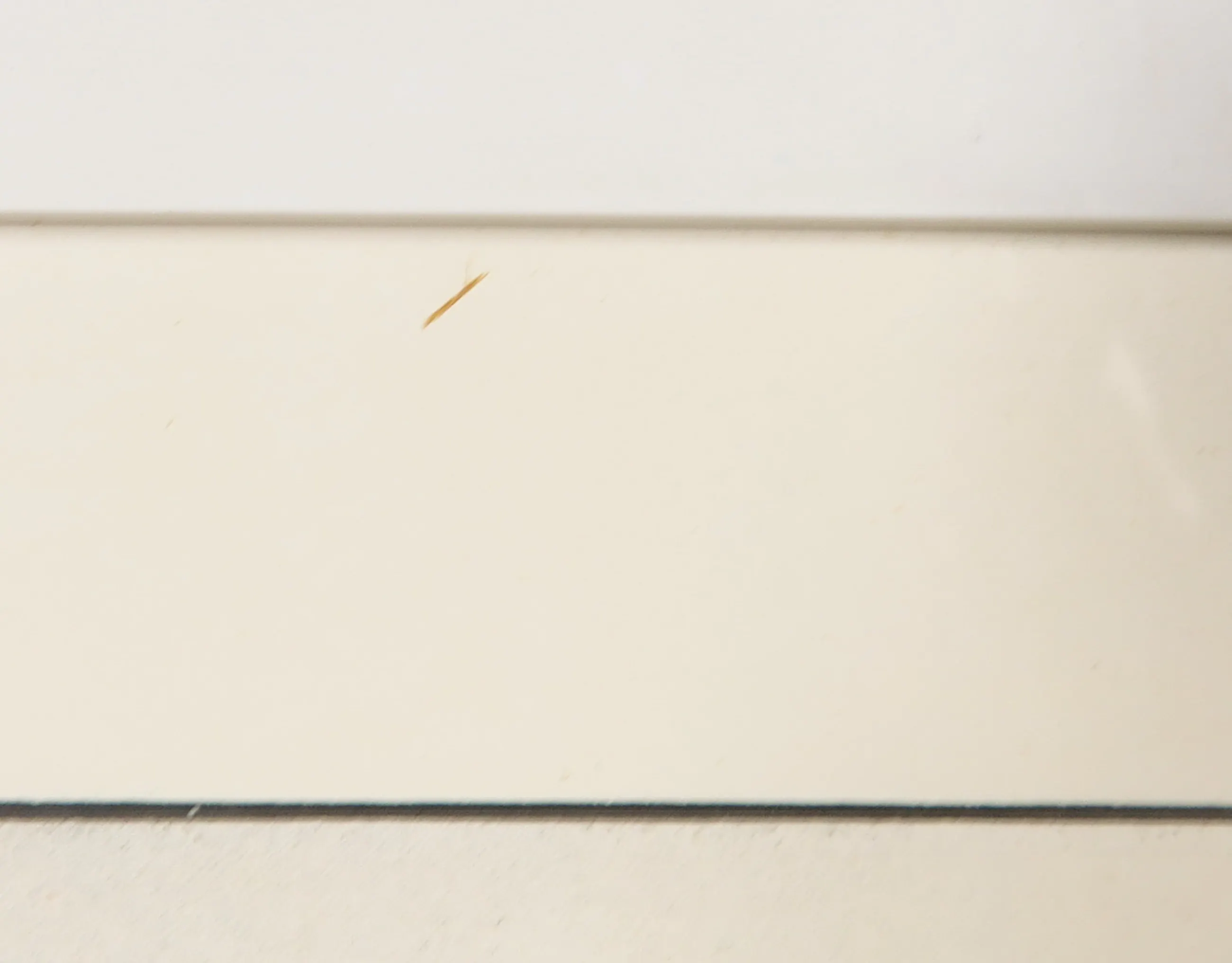 | Het papier is vergeeld met hier en daar wat foxing. Stofdeeltjes en haartjes achter de glasplaat. Lijst is flink beschadigd. | |