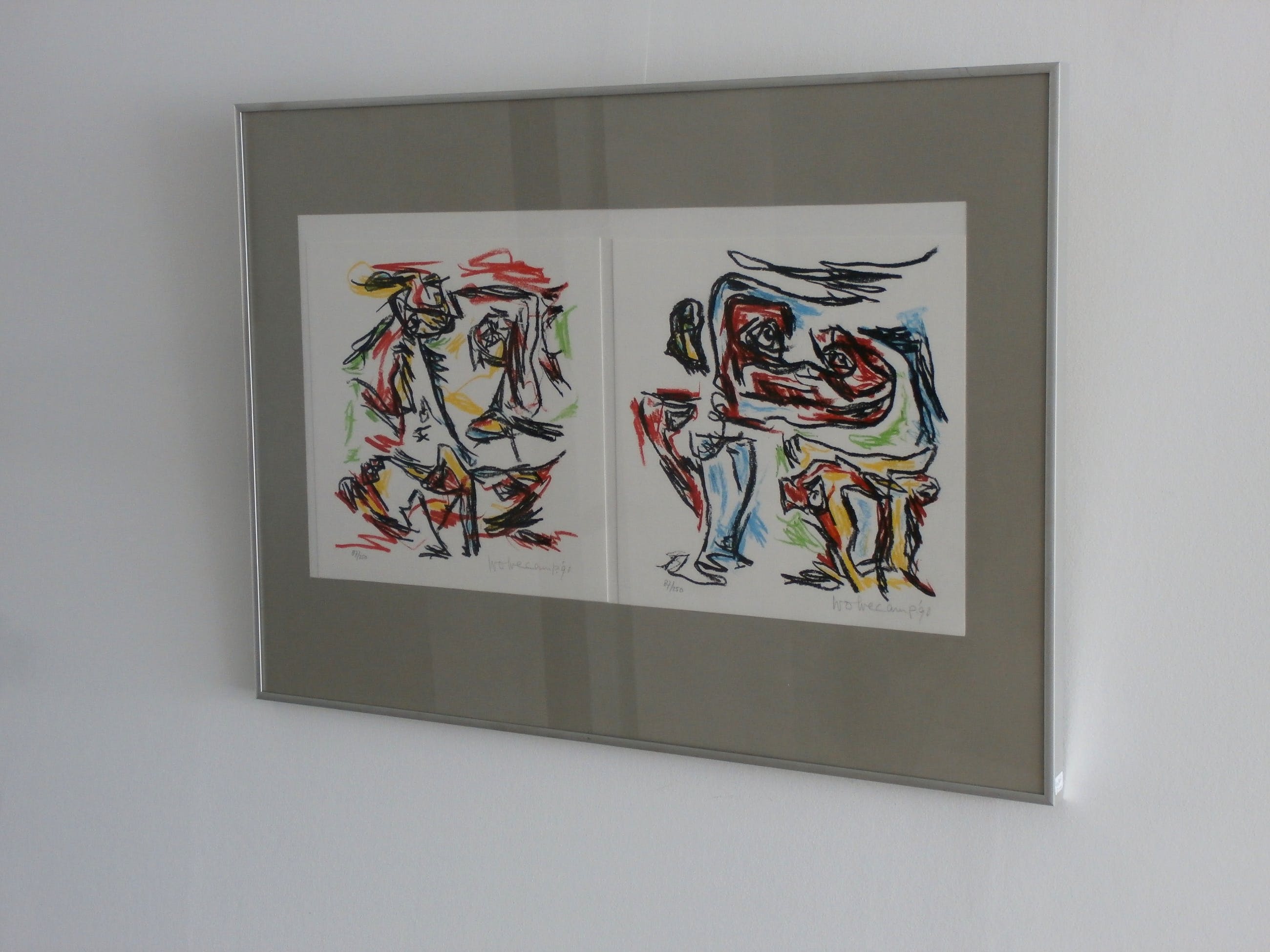 2 ingelijste litho's van Theo Wolvecamp in één lijst. Nummer: 87/250. Beide litho's zijn met potlood gesigneerd. Jaar: 1990. Afmetingen incl. lijst: H50 x b70 cm. Afmetingen litho: H 28 x b28 cm (totaal 2 litho's: 56 x 56 cm). Conditie: in zeer goede staat. Op de foto ziet u de spiegeling van het glas. Lijst is in goede staat.