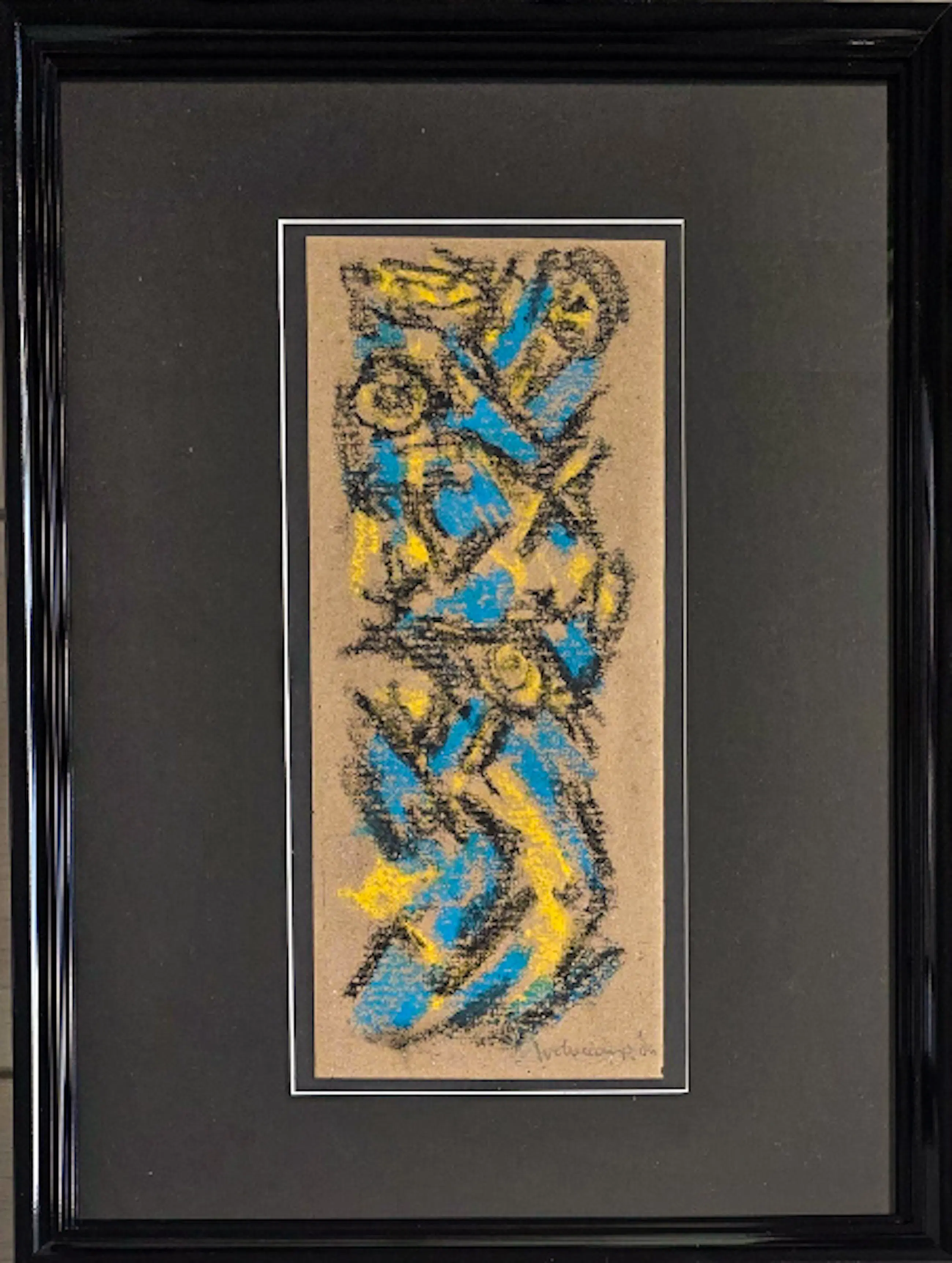 Abstracte compositie Pastel op papier Afmetingen: ca. 31 × 23 cm Gesigneerd rechtsonder Professioneel ingelijst met kwaliteitsomlijsting en zuurvrij passe-partout. Aangekocht via veiling.
