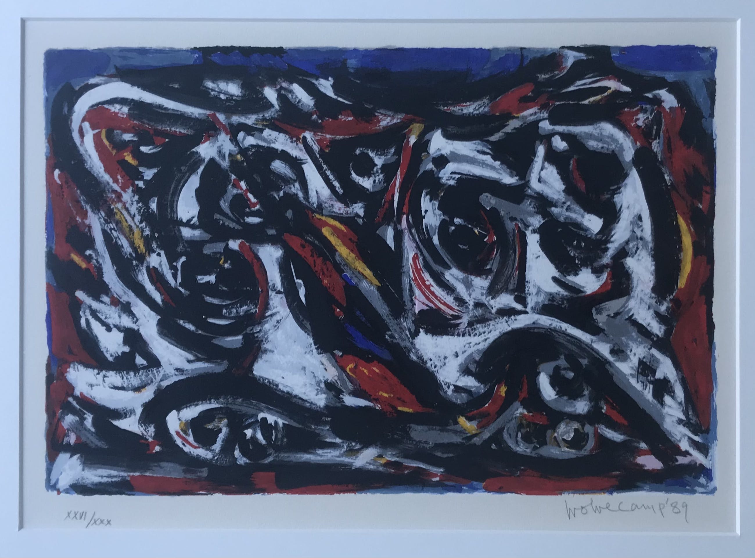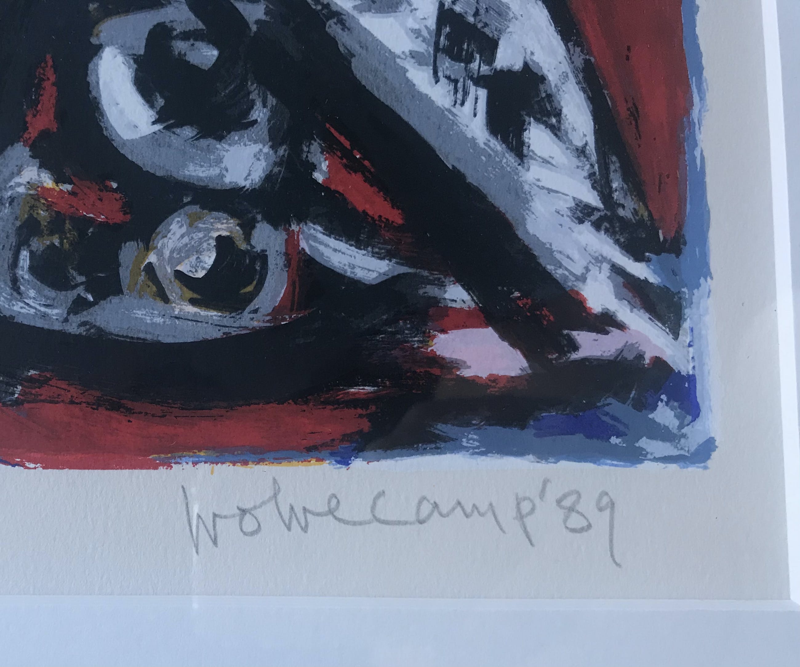 Een abstracte compositie van Theo Wolvecamp Zeefdruk op papier gesigneerd rechtsonder en links onder oplage van 30stuks XXVI /XXX. (26 van 30 stuks)