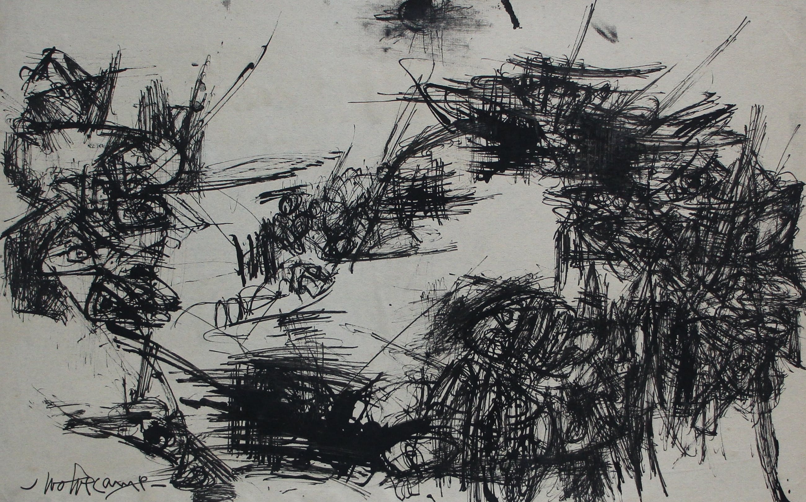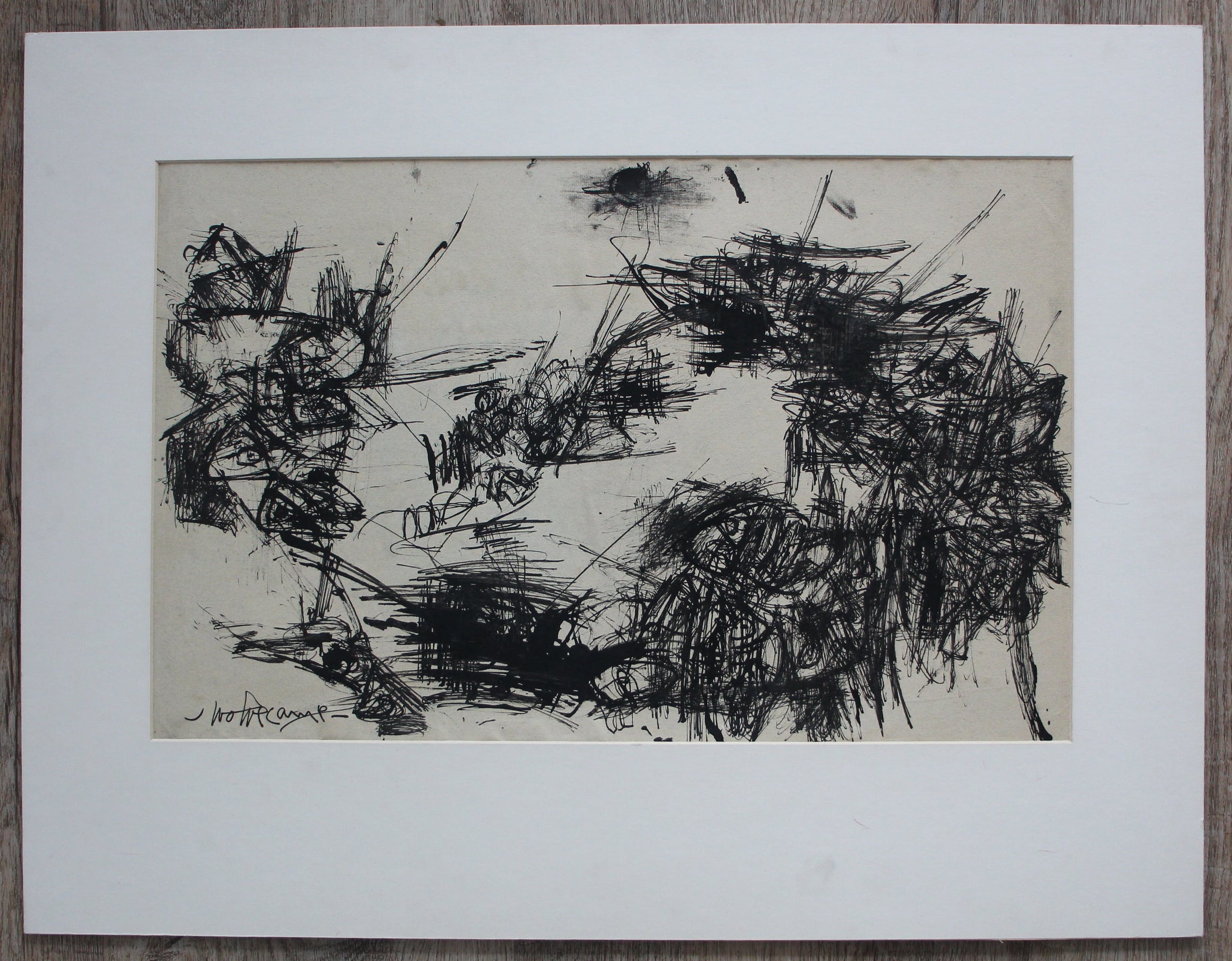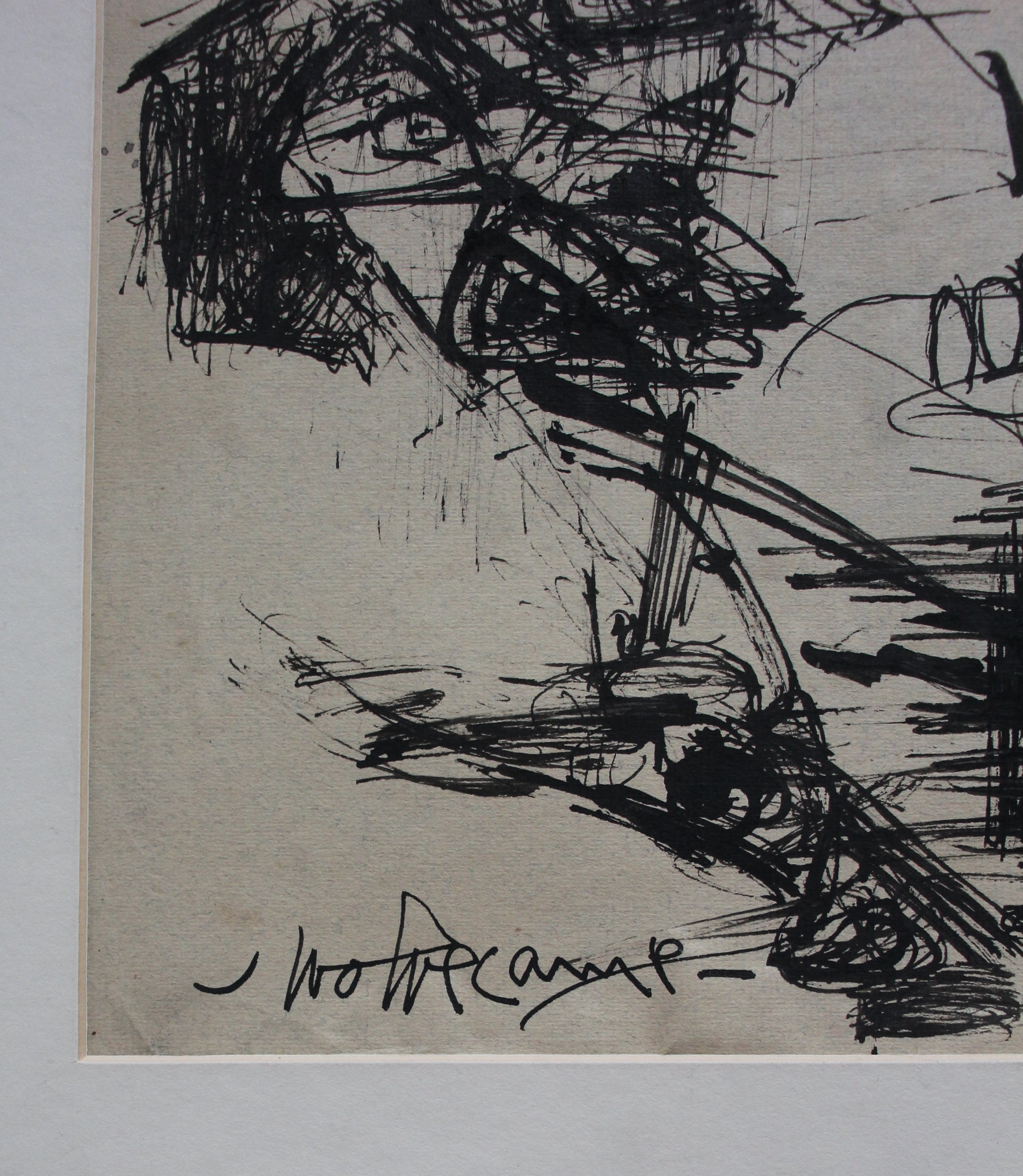 Grote inkttekening afkomstig uit de collectie van Hans en Alice de Jong. De Hengelose kousenfabrikant Hans de Jong, de in 1973 overleden directeur van het textielbedrijf Jovanda, begon na de oorlog met het verzamelen van kunst. Zijn huis aan de Enschedesestraat in Hengelo werd een trefpunt voor kunstenaars, onder wie Karel Appel. Met steun van Theo Wolvecamp en Alice bouwde hij een verzameling op die uniek was in Nederland.