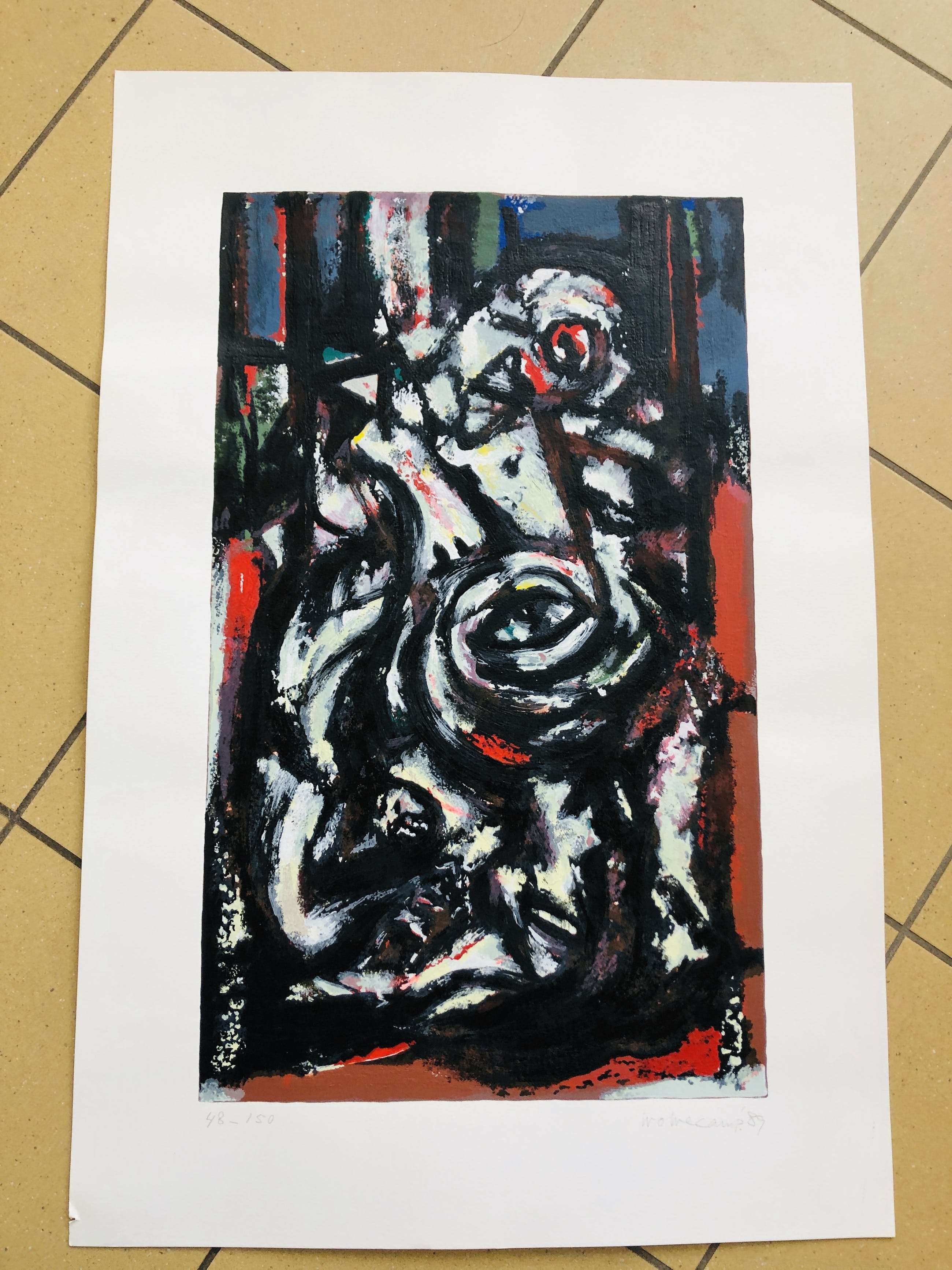 Mooie zeefdruk van CoBrA- kunstenaar Theo Wolvecamp. Het werk is in goede conditie.U kunt het werk vooraf komen bekijken in de Schatkamer van galerie Rotor in Gorcum, na aankoop afhalen of per aangetekende post toegestuurd krijgen.