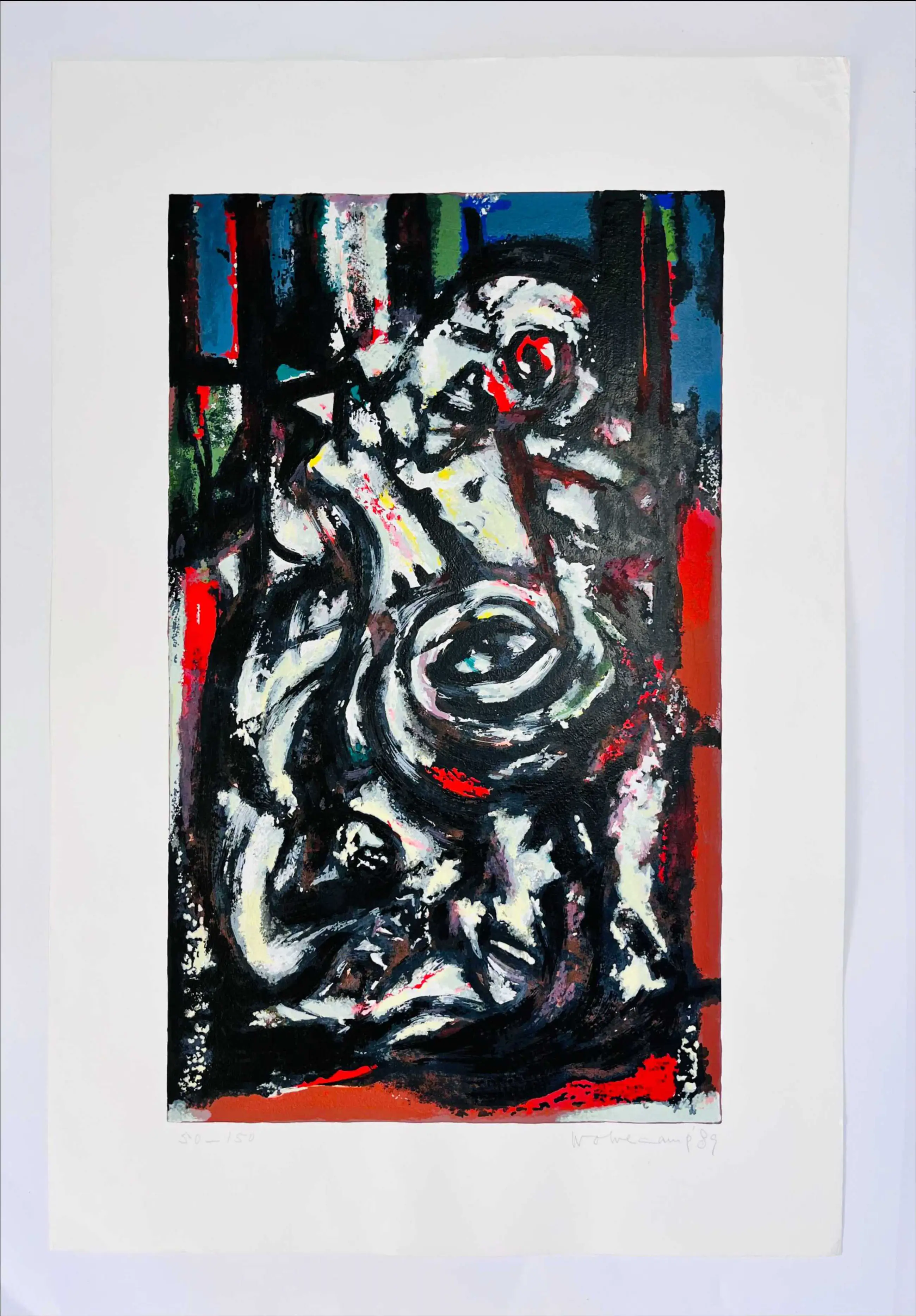 Fraaie zeefdruk van CoBra-kunstenaar Theo Wolvecamp in zeer goede staat. Genummerd en gesigneerd door de kunstenaar. U kunt het werk vooraf komen bekijken in de Schatkamer van galerie Rotor in Gorcum, na aankoop afhalen of verzenden per aangetekende post toegestuurd krijgen. Ook kunnen wij uw inlijstingen verzorgen. In overleg kunt u uw aankopen laten opslaan in onze verwarmde opslagruimte en ze in een later stadium ophalen.