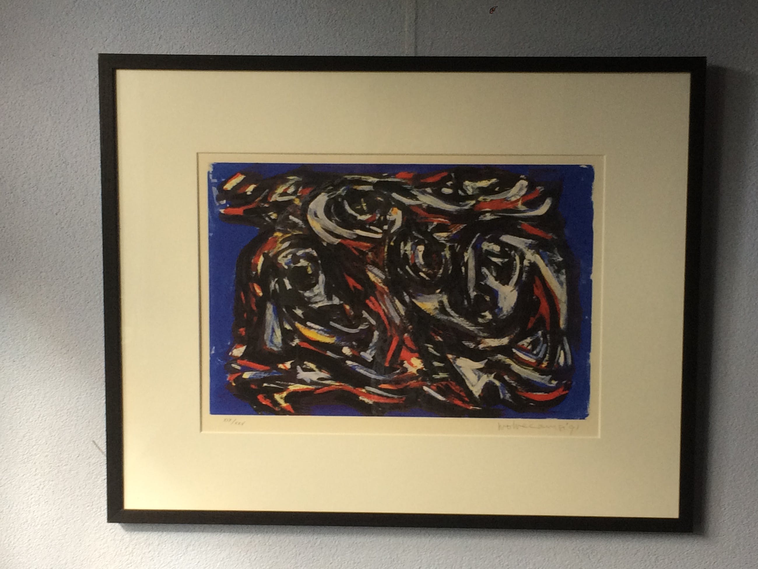 Fraai ingelijst werk van Theo Wolvecamp (CoBrA) in zwart beukenhouten Barthlijst. Kan zo aan de muur.Gesigneerd en genummerd.Het werk kan het best worden opgehaald omdat de lijst er dan bij zit. Opnieuw laten inlijsten kost al meer. Het werk kan tegen een meerpijs per koerier bij u worden afgeleverd. Kan niet met lijst per aangetekende post.