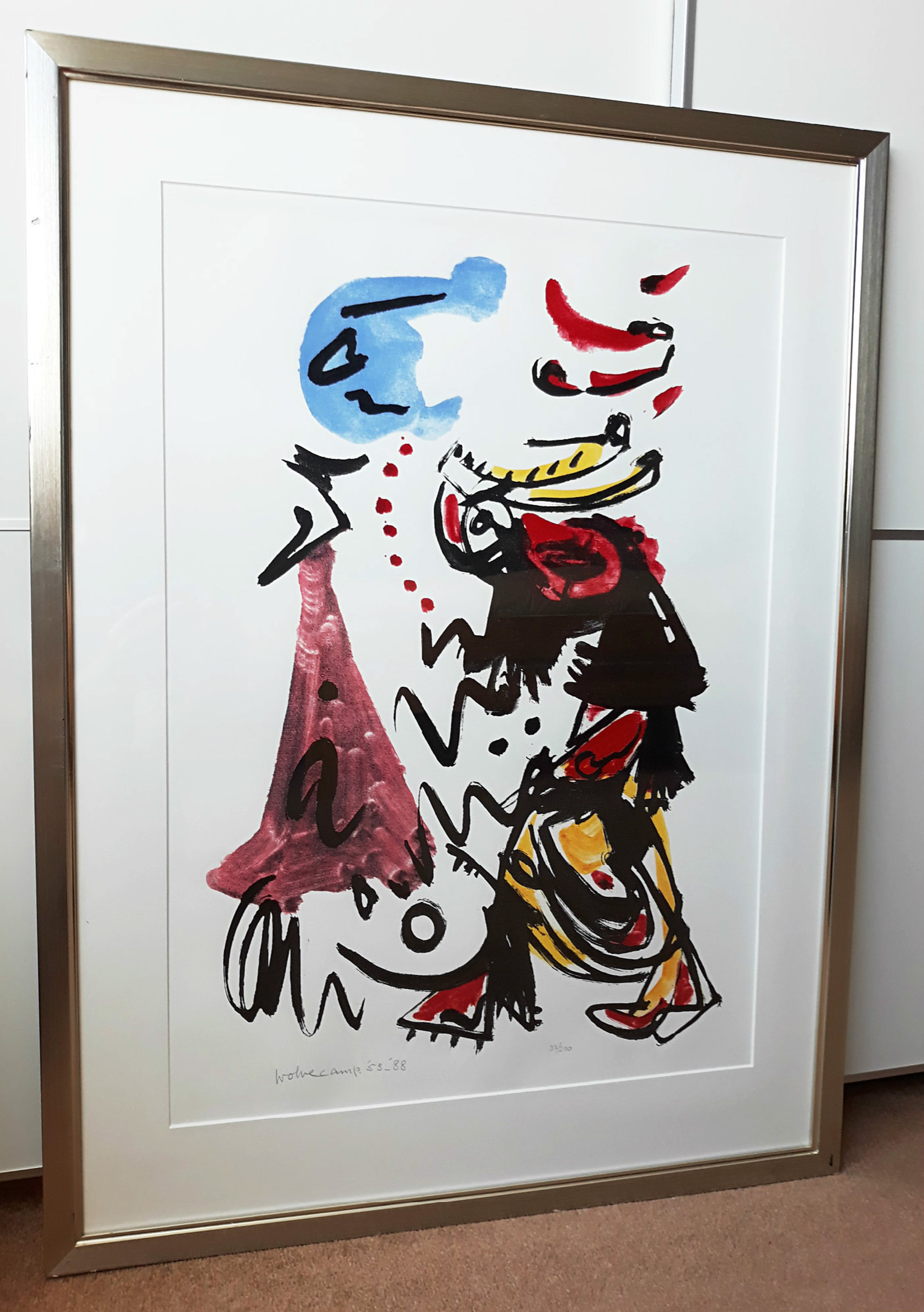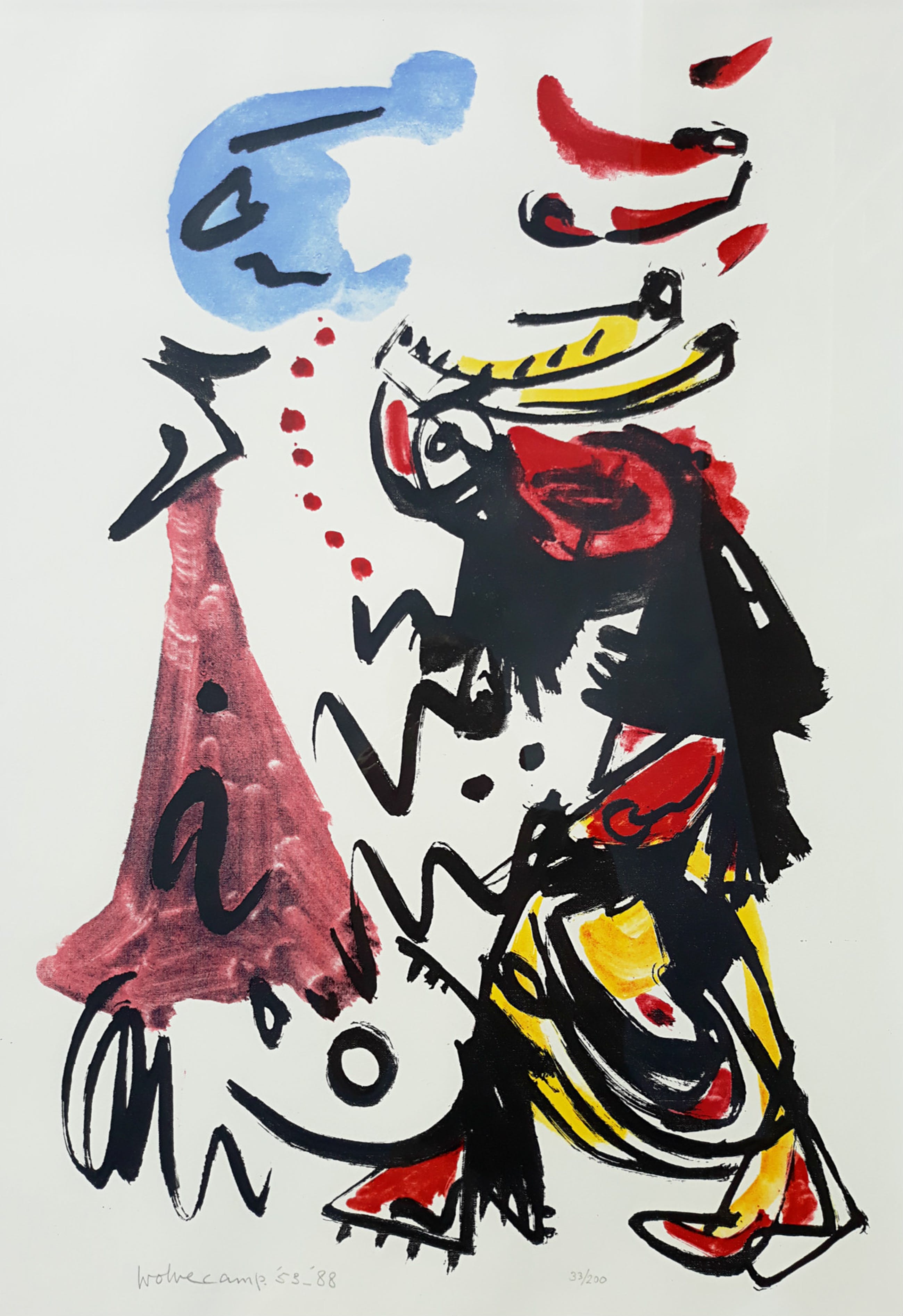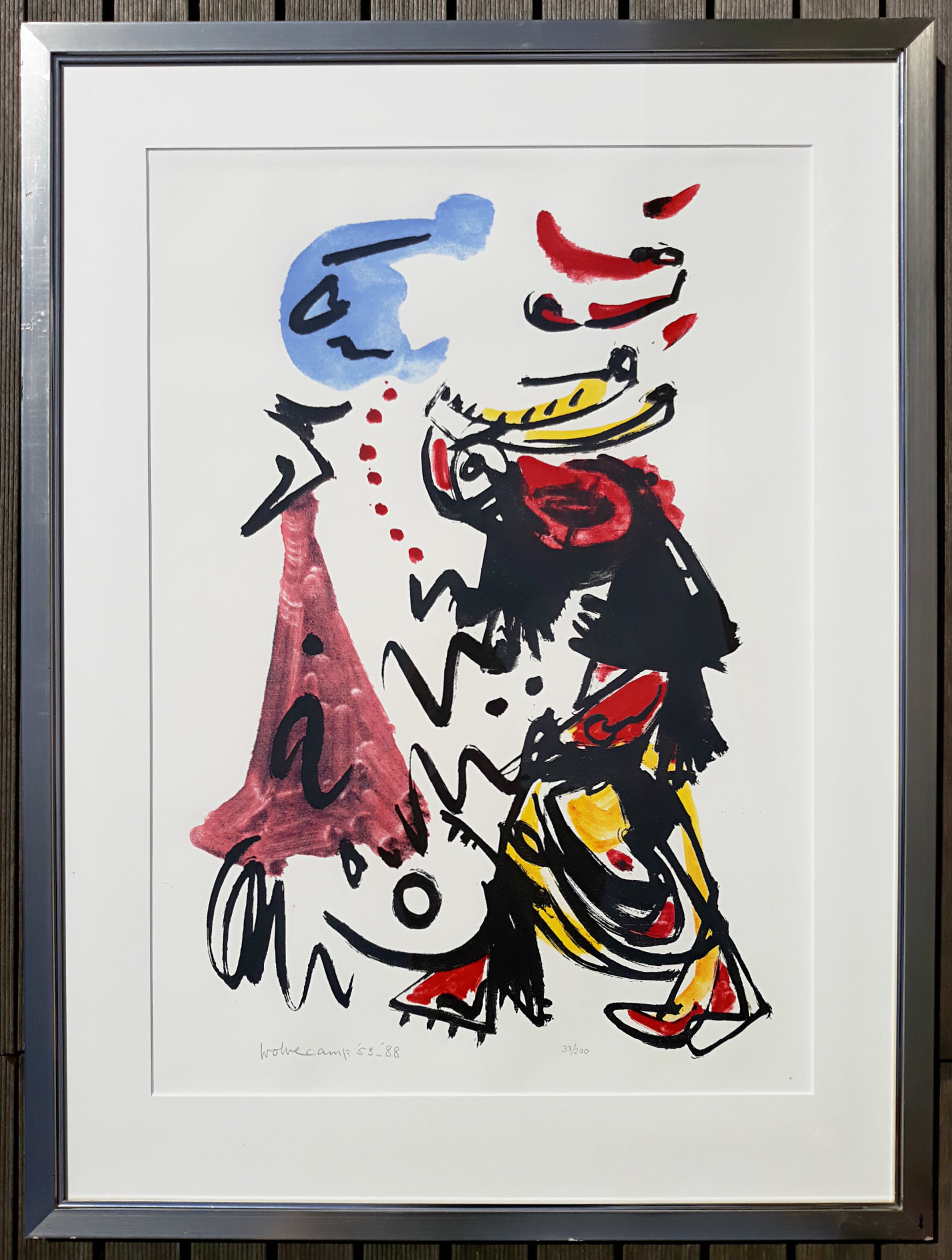 Groot, retrospectief werk van Theo Wolvecamp. Zeefdruk op papier, met potlood gesigneerd, gedateerd (’53-‘88) en genummerd (33/200). Mooi ingelijst, achter glas en met smetteloos, zuurvrij passe-partout. In uitstekende conditie, alleen wat kleine krasjes op de lijst. Afkomstig uit de kunstcollectie van Deloitte.