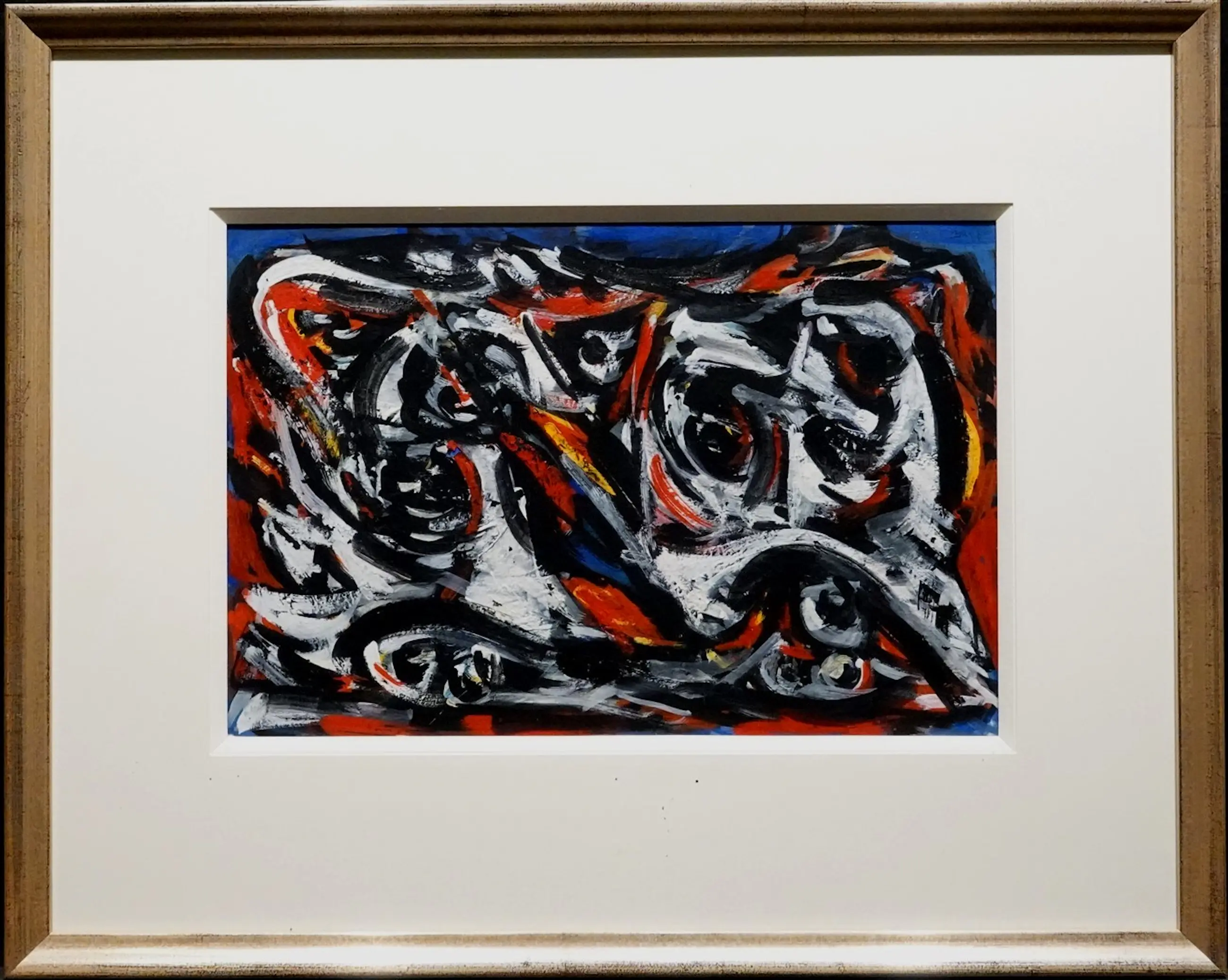 Ingelijste gouache van Theo Wolvecamp. Compositie. Afmetingen incl. lijst: H59 x B73cm. Afmetingen voorstelling: H30 x b46.5cm.
