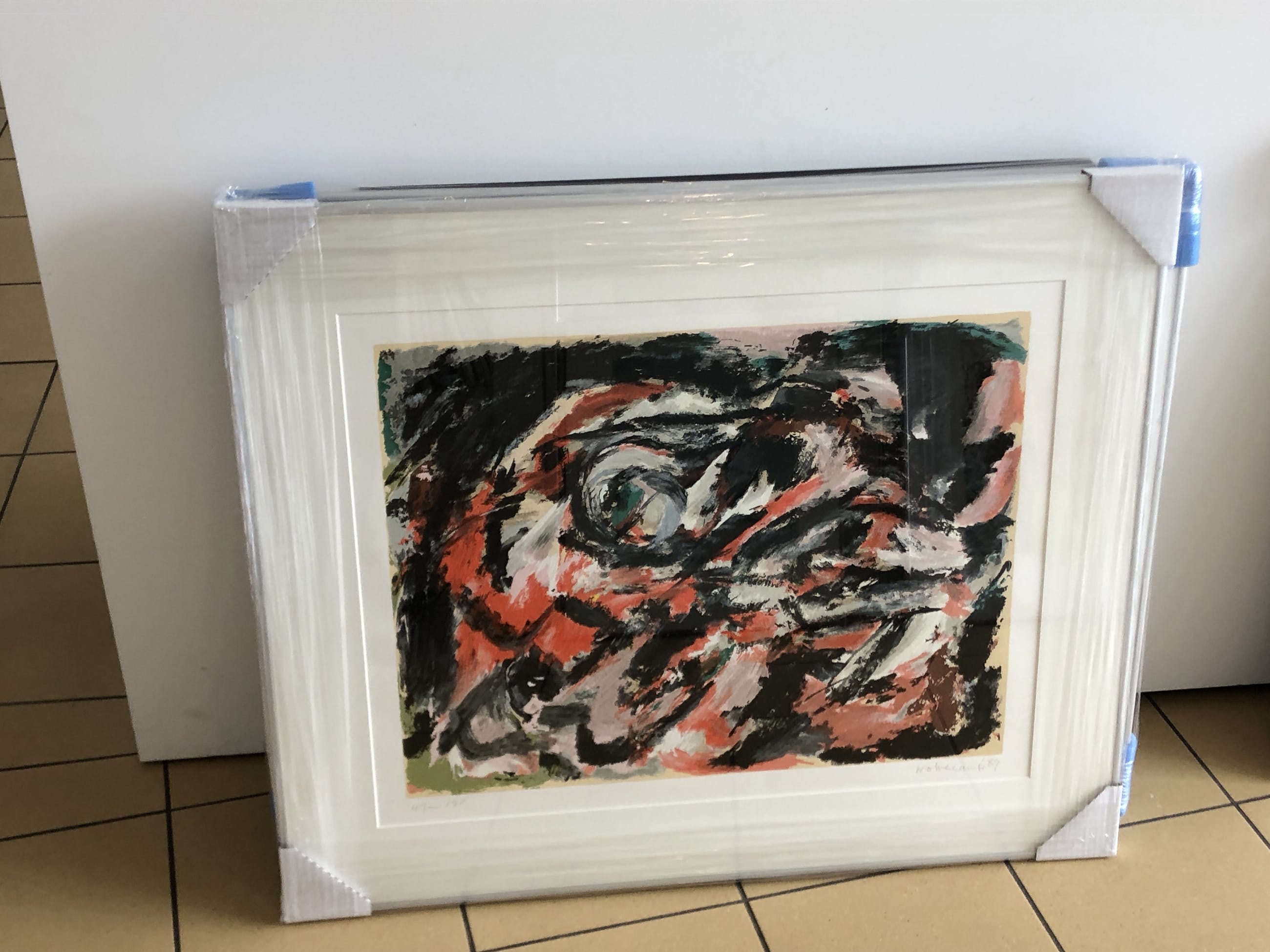 De foto is door het glas van de lijst heen genomen. In overleg kunt u uw aankopen laten opslaan in onze verwarmde opslagruimte en ze in een later stadium ophalen.