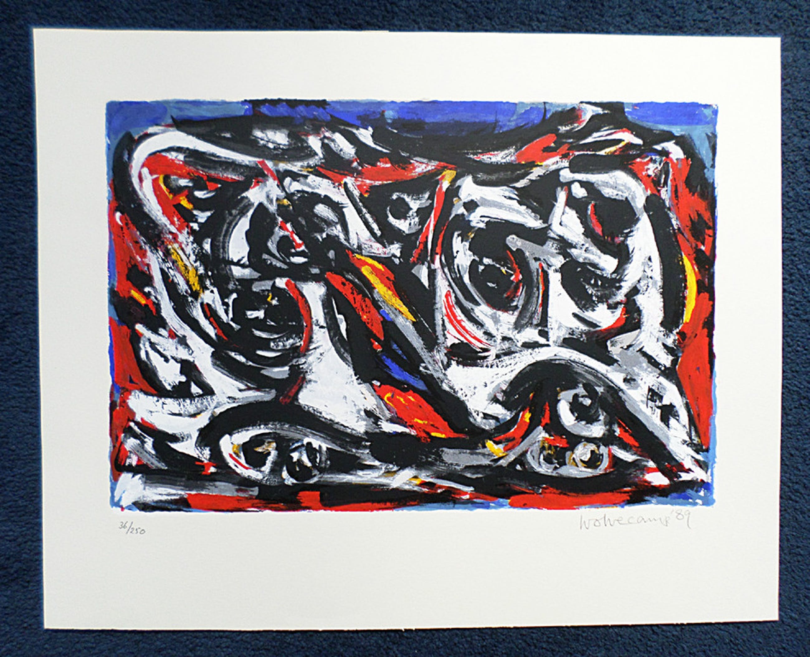 Mooie Theo Wolvecamp op Arches. Handgesigneerd, gedateerd (1989) en genummerd (36 uit een oplage van 250). Afkomstig uit de kunstcollectie van ABN AMRO. Het werk is nooit ingelijst geweest, waarschijnlijk zelfs nooit uit het depot geweest, want is in mint conditie.