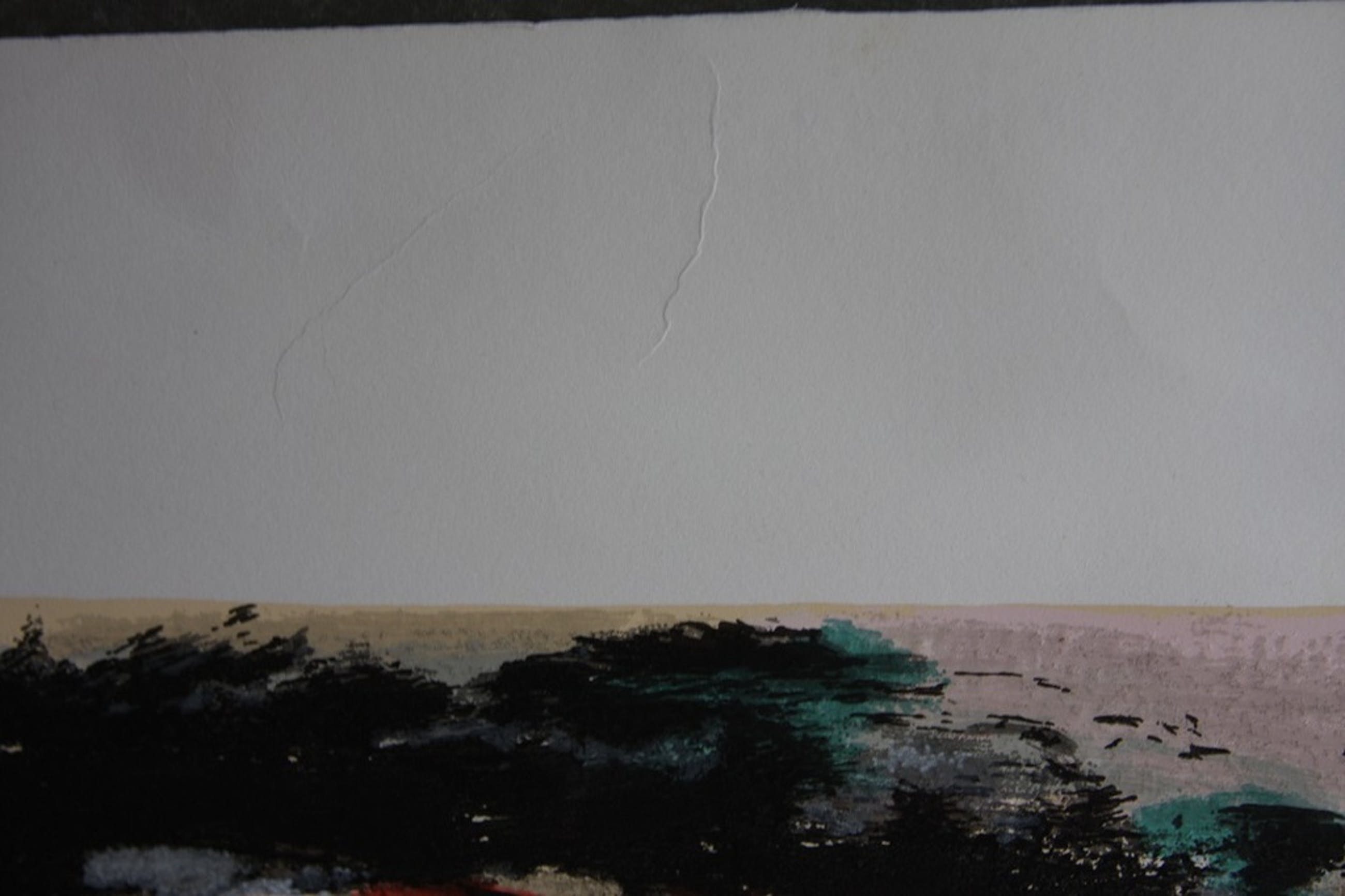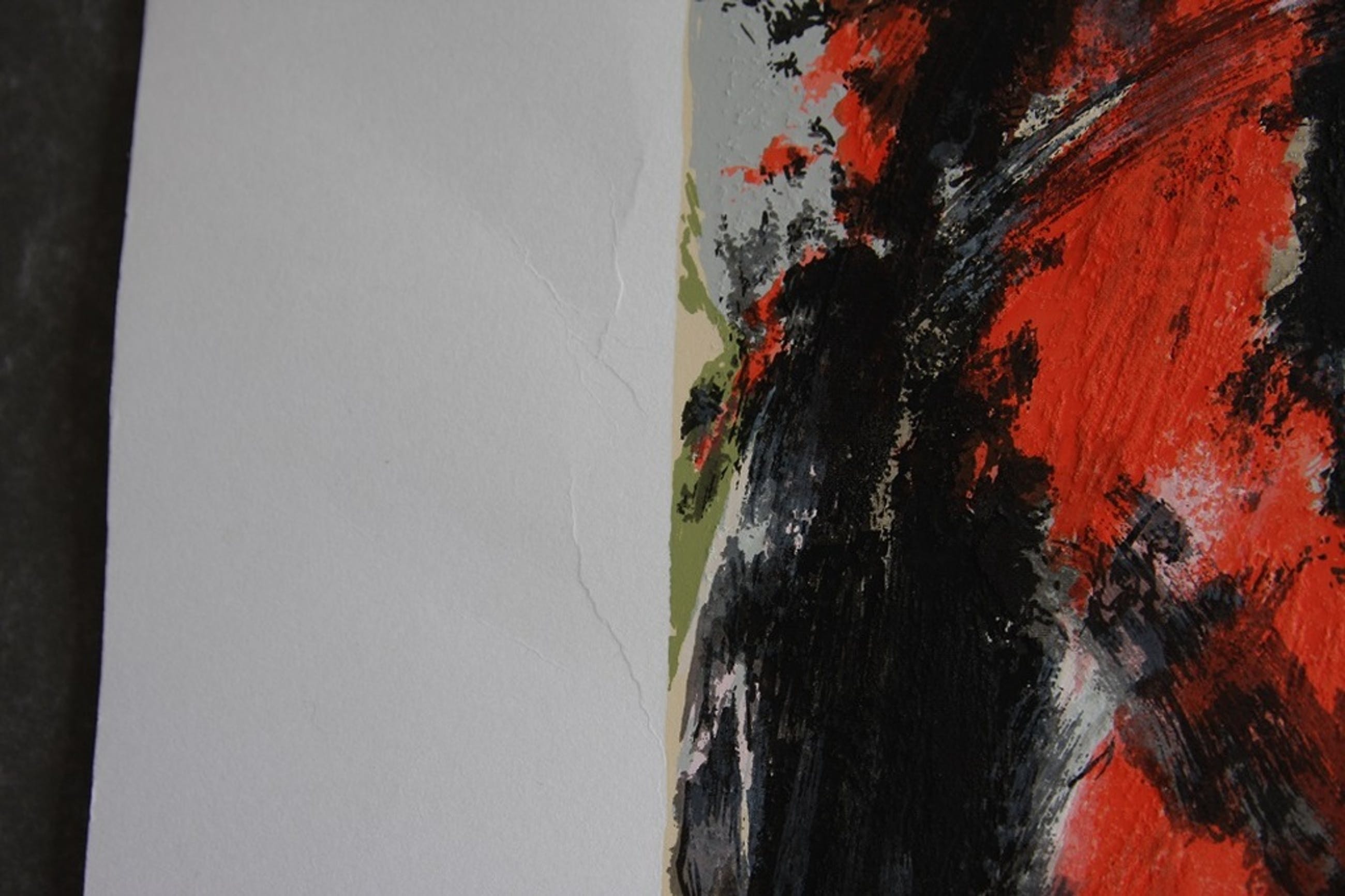 De verf is op sommige plekken zo dik dat het op een olieverf schilderij lijkt. De rand heeft beschadigingen (zie detailfoto's), o.a. twee kleine scheurtjes, alsook wat kreukels, vlekken en een klein gaatje. Zeefdruk zelf is onbeschadigd.