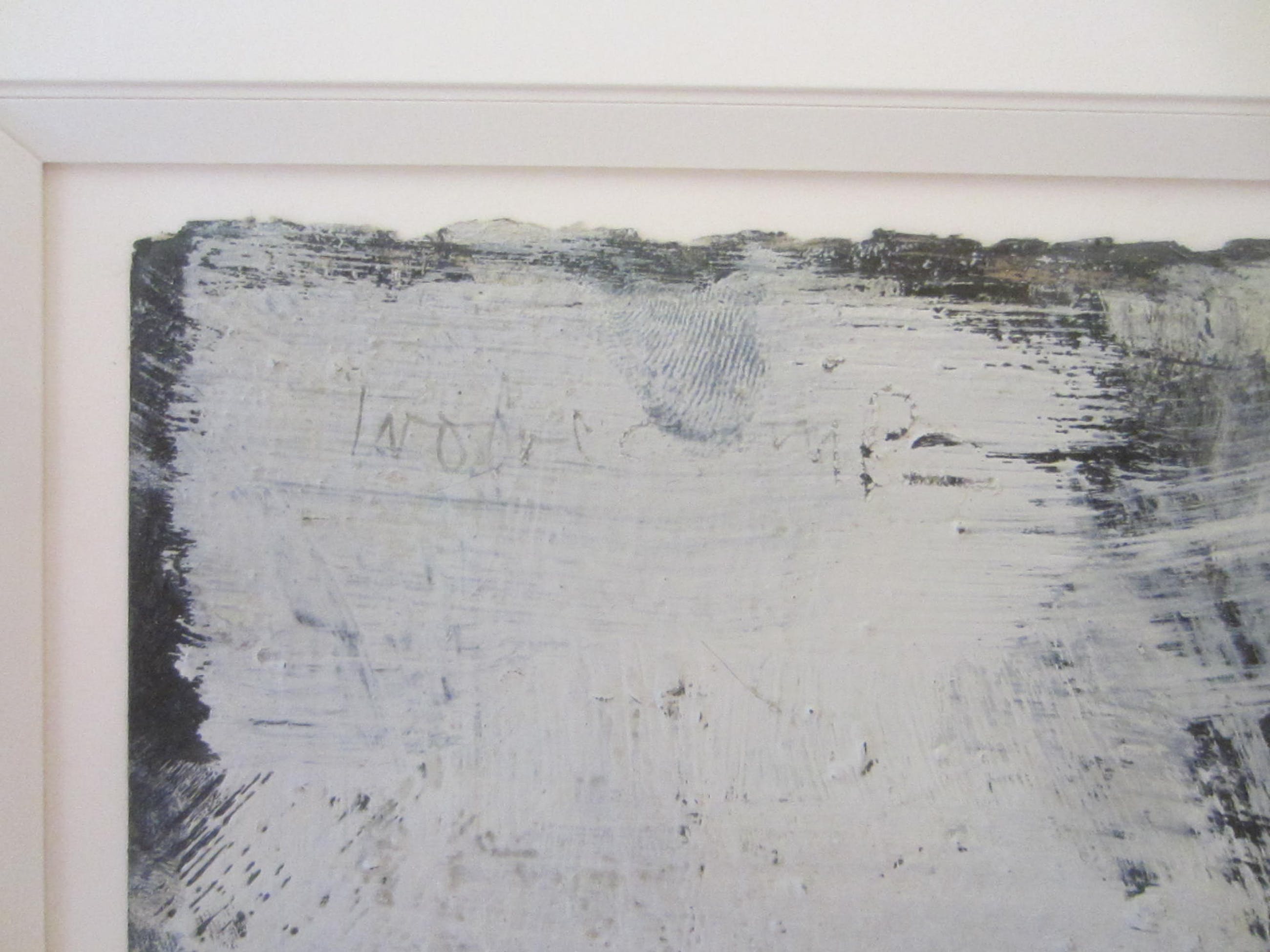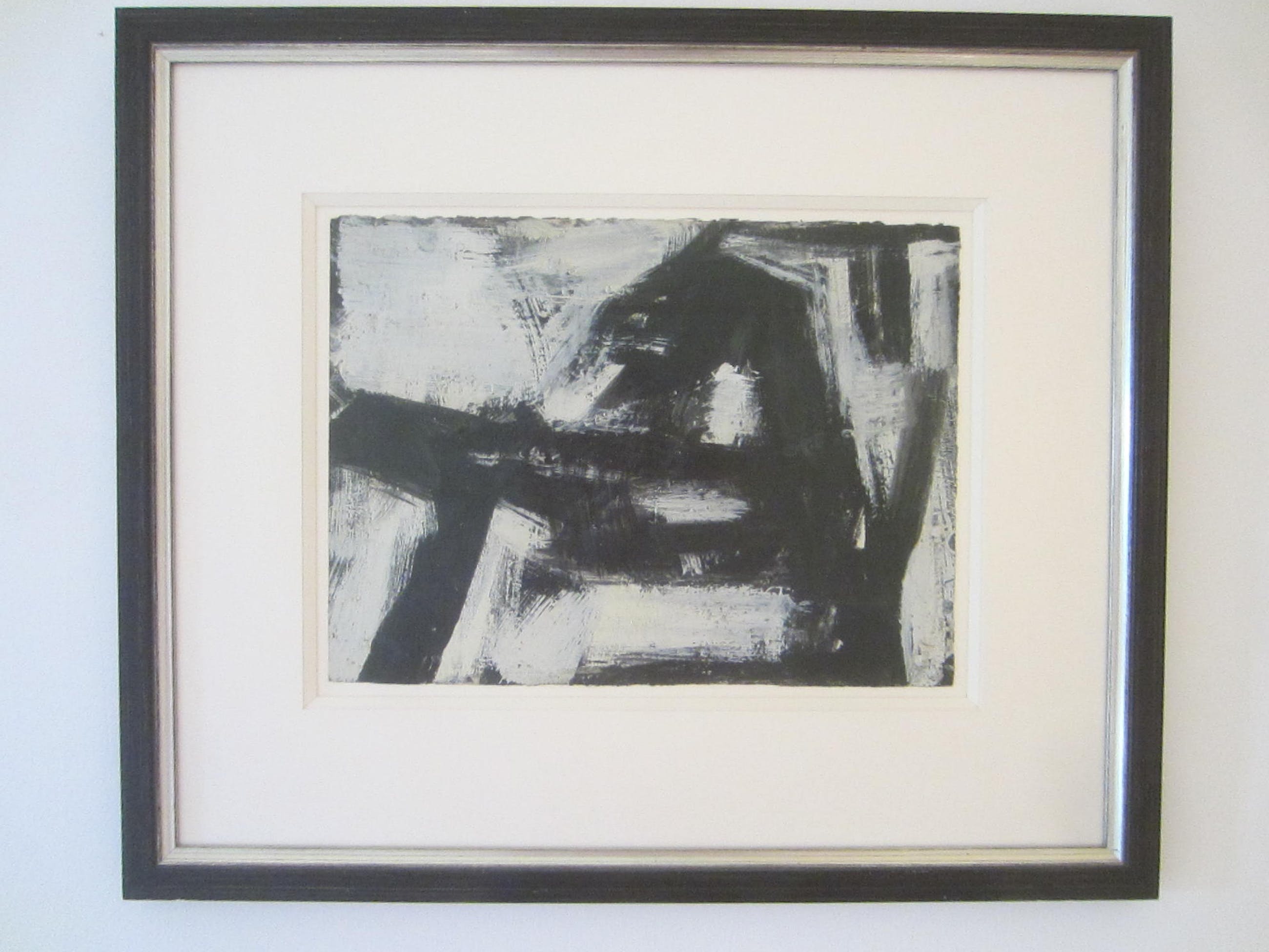 Zwart-wit gouache op papier, vrijstaand geplakt in kader. Geen barsten in het werk. Gesigneerd linksboven. Bij de signatuur is een vingerafdruk van Wolvekamp zichtbaar.