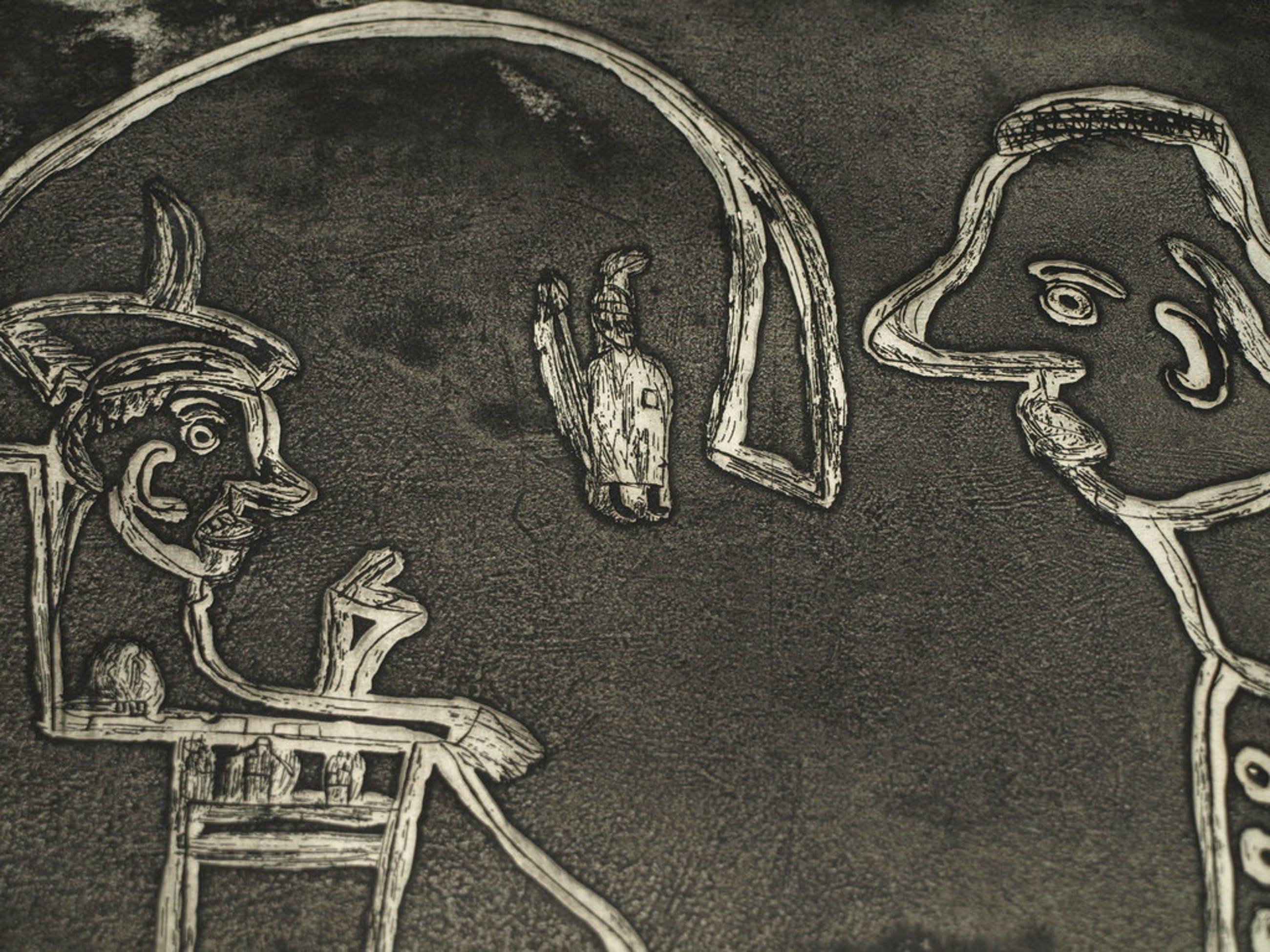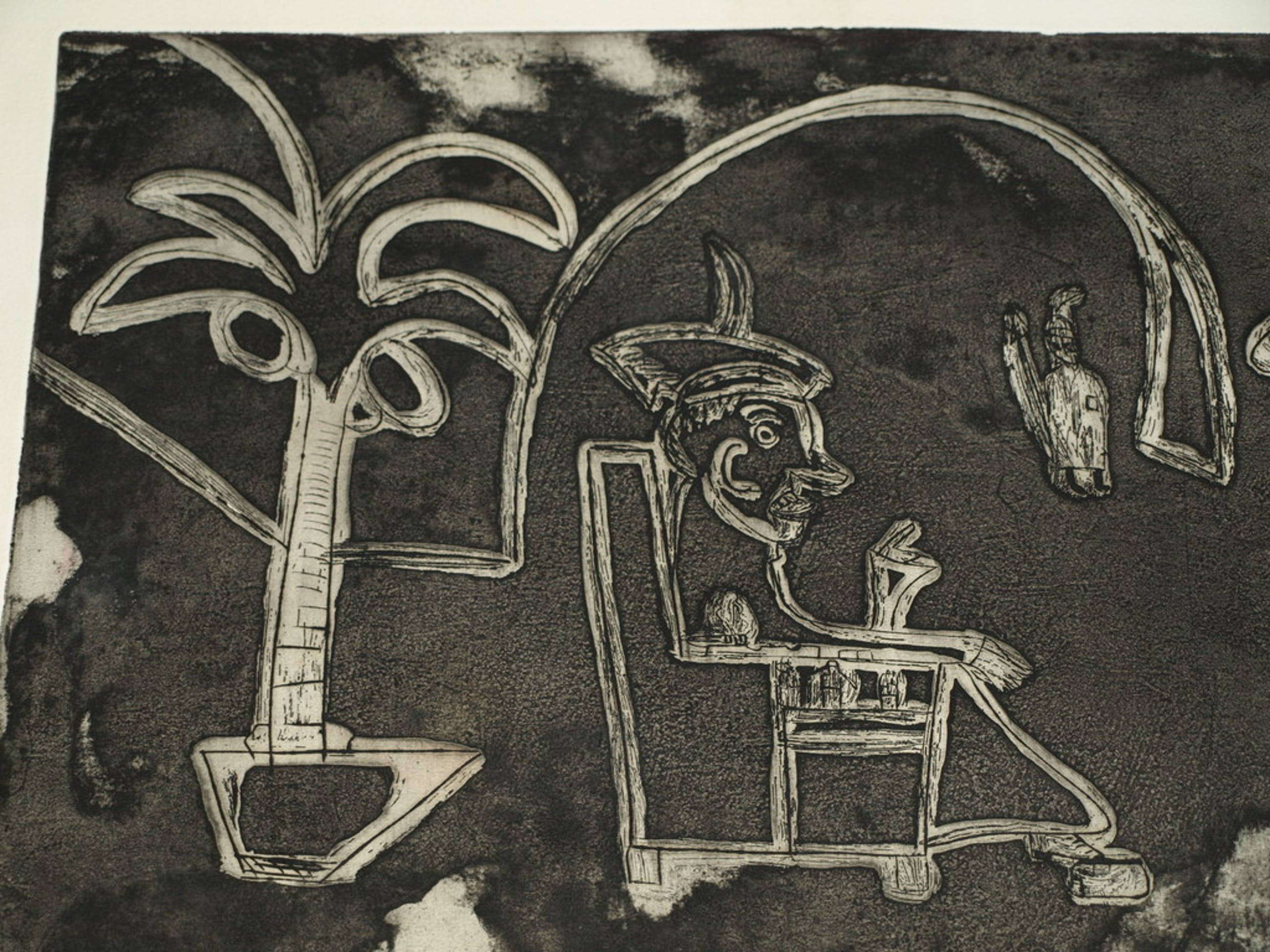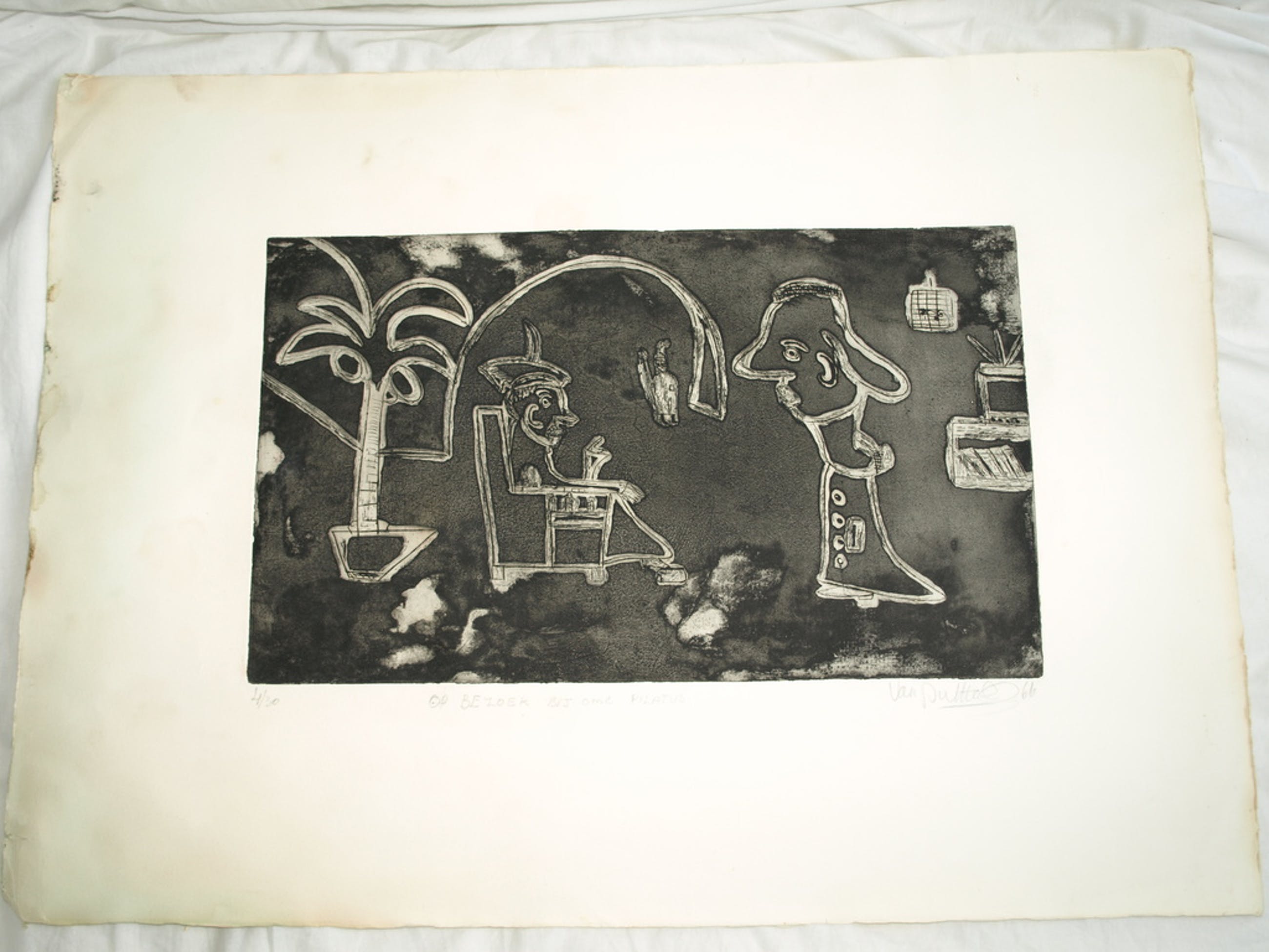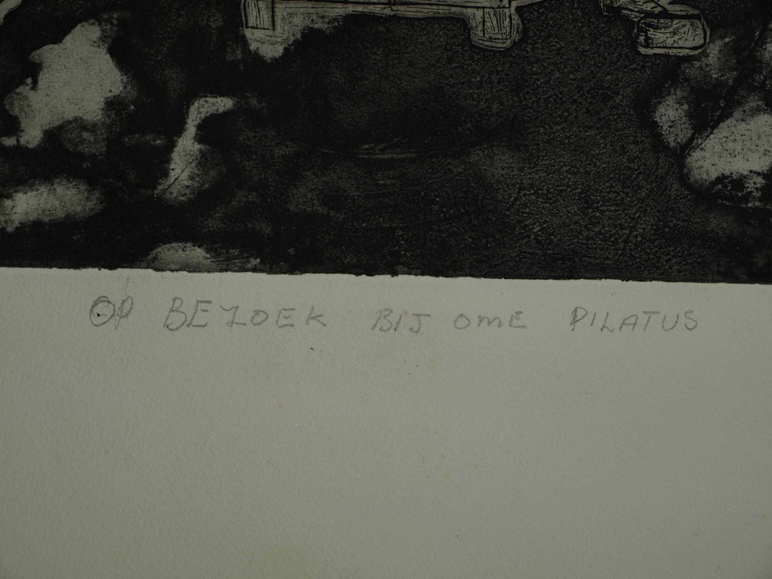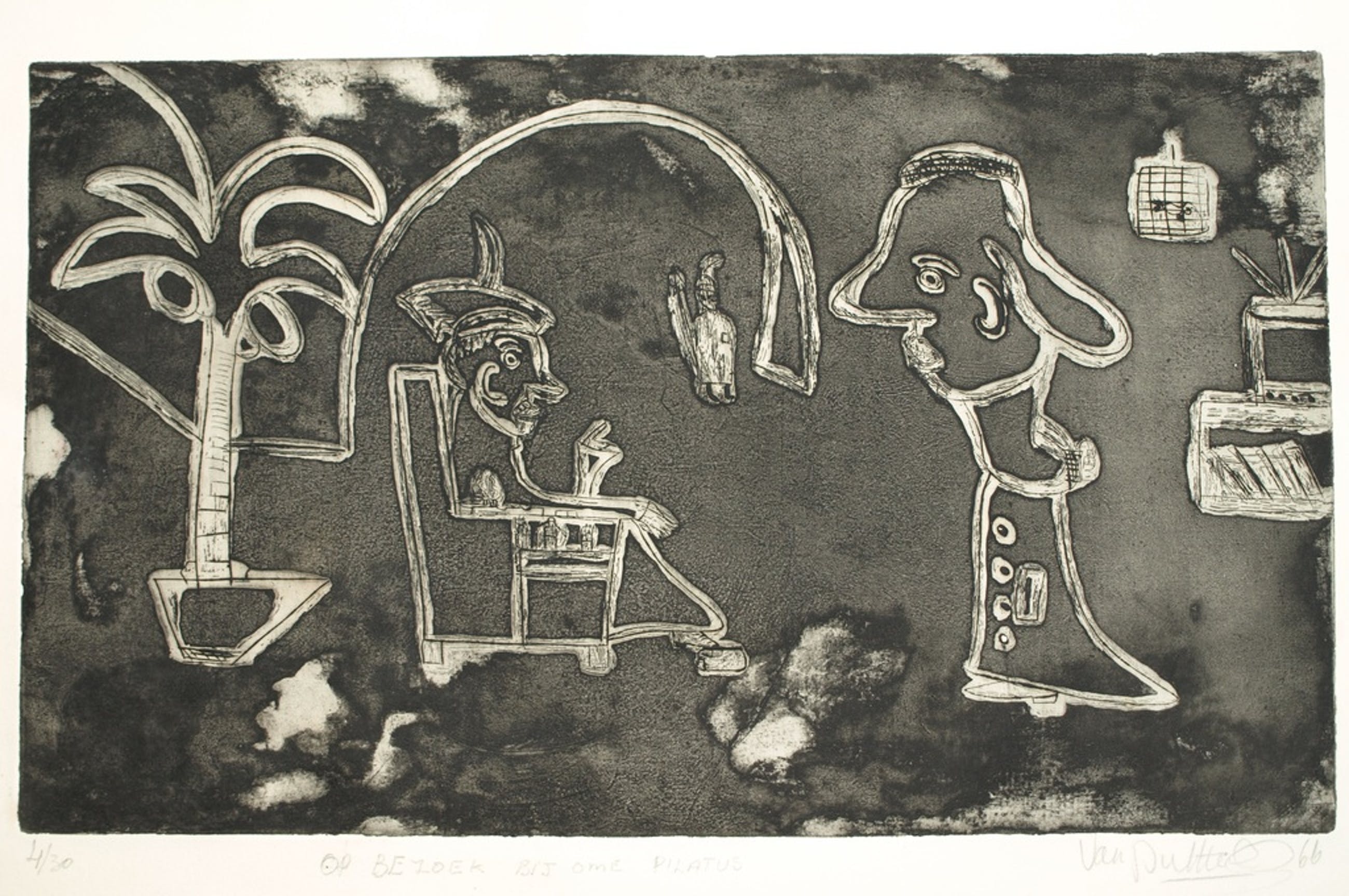 Een grote ets (+ aquatint) met humor van de Amsterdamse kunstenaar Theodoor Herbert van Putten (1929-1980), met als titel: “Op bezoek bij ome Pilatus”.