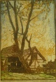 Theodor Schultze-Jasmer - Leiterwagen und Bäume vor Katen, Farblinolschnitt, Handdruck - Verkocht