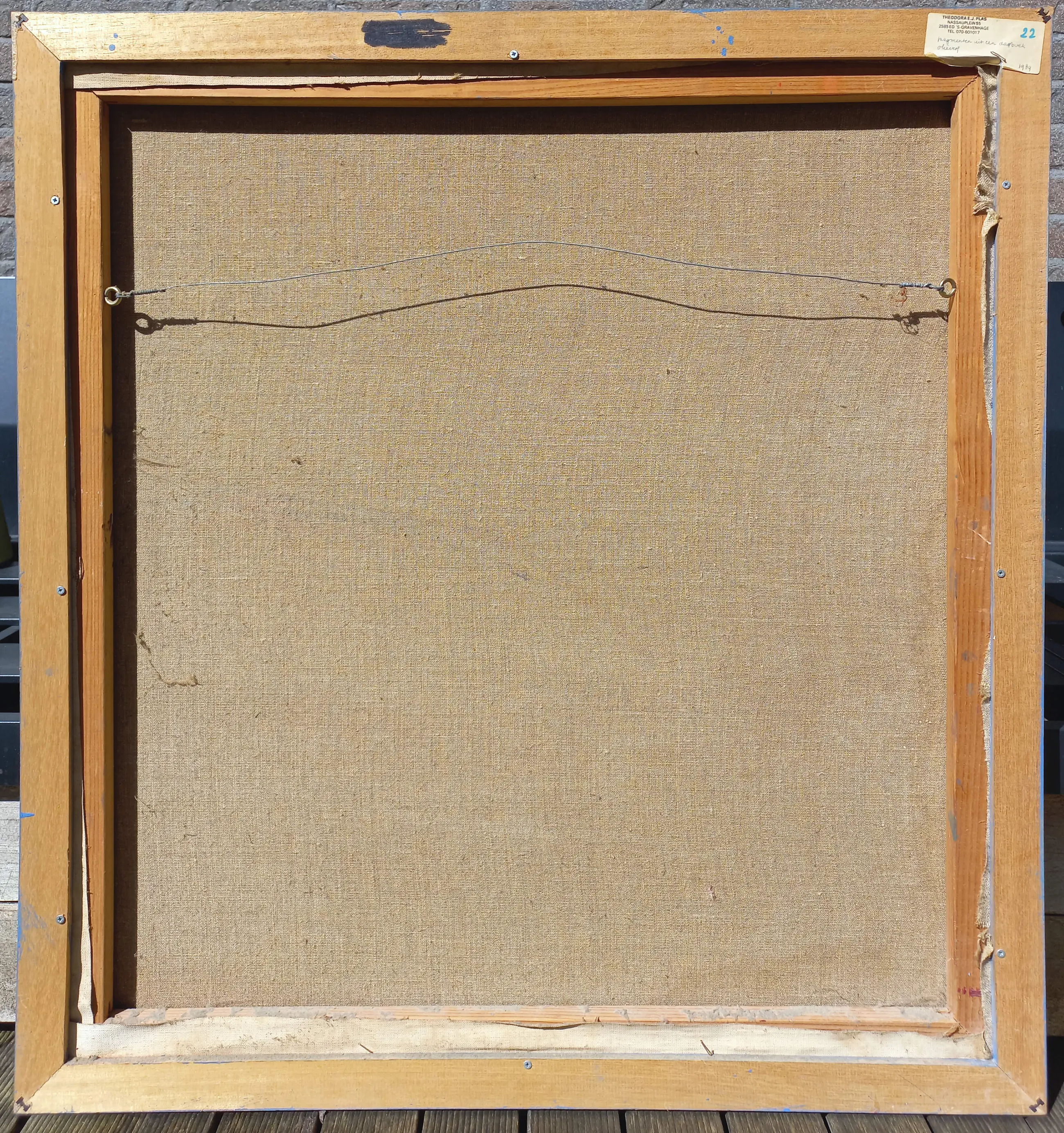 Mooi, karakteristiek werk van Theodora Plas. Olieverf op doek, gesigneerd en gedateerd (‘89) rechtsonder, in verso op label getiteld en nogmaals gedateerd. In nette, blauwe baklijst. Alles in zeer goede conditie.