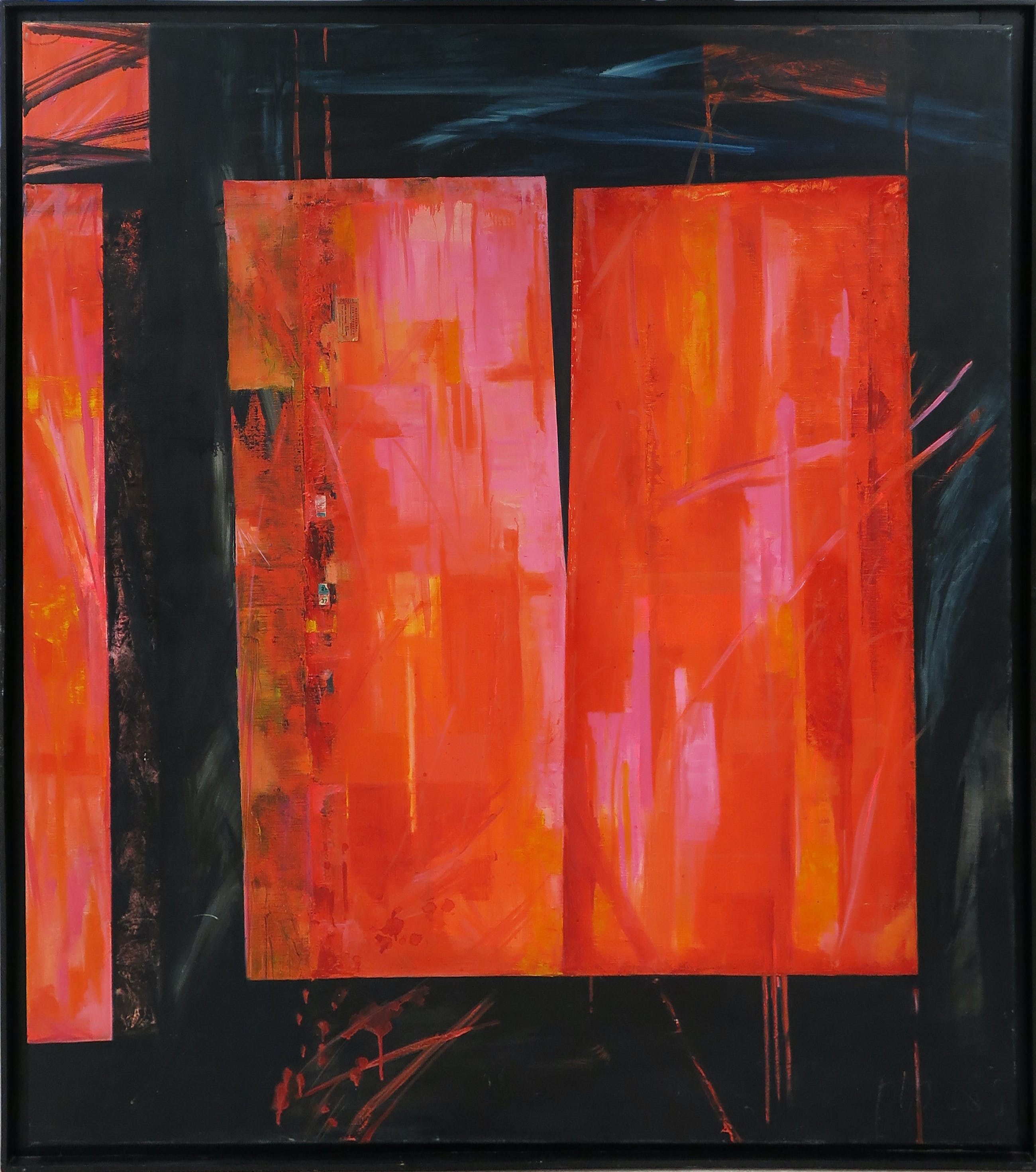 | Over het algemeen in goede staat. Enkele delen van de collage laten enigszins los. In de linkderonderhoek, tussen de twee rode vlakken, zit een beschadiging in de verflaag. | |