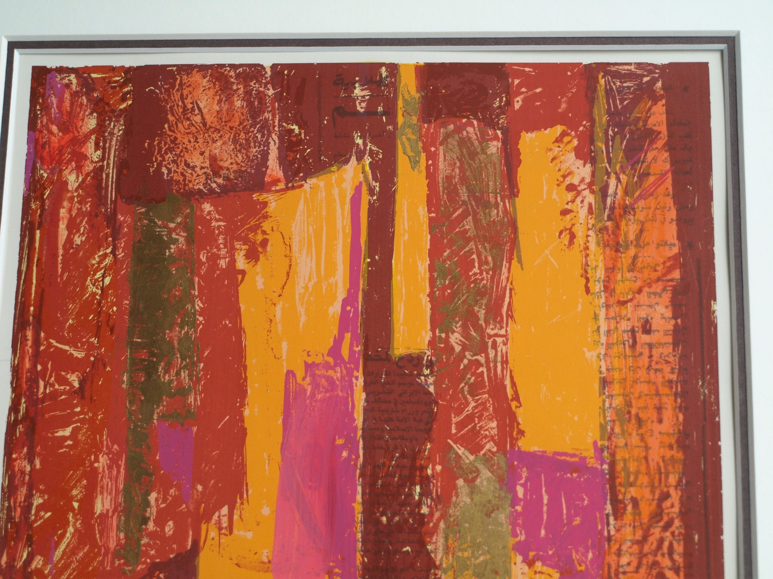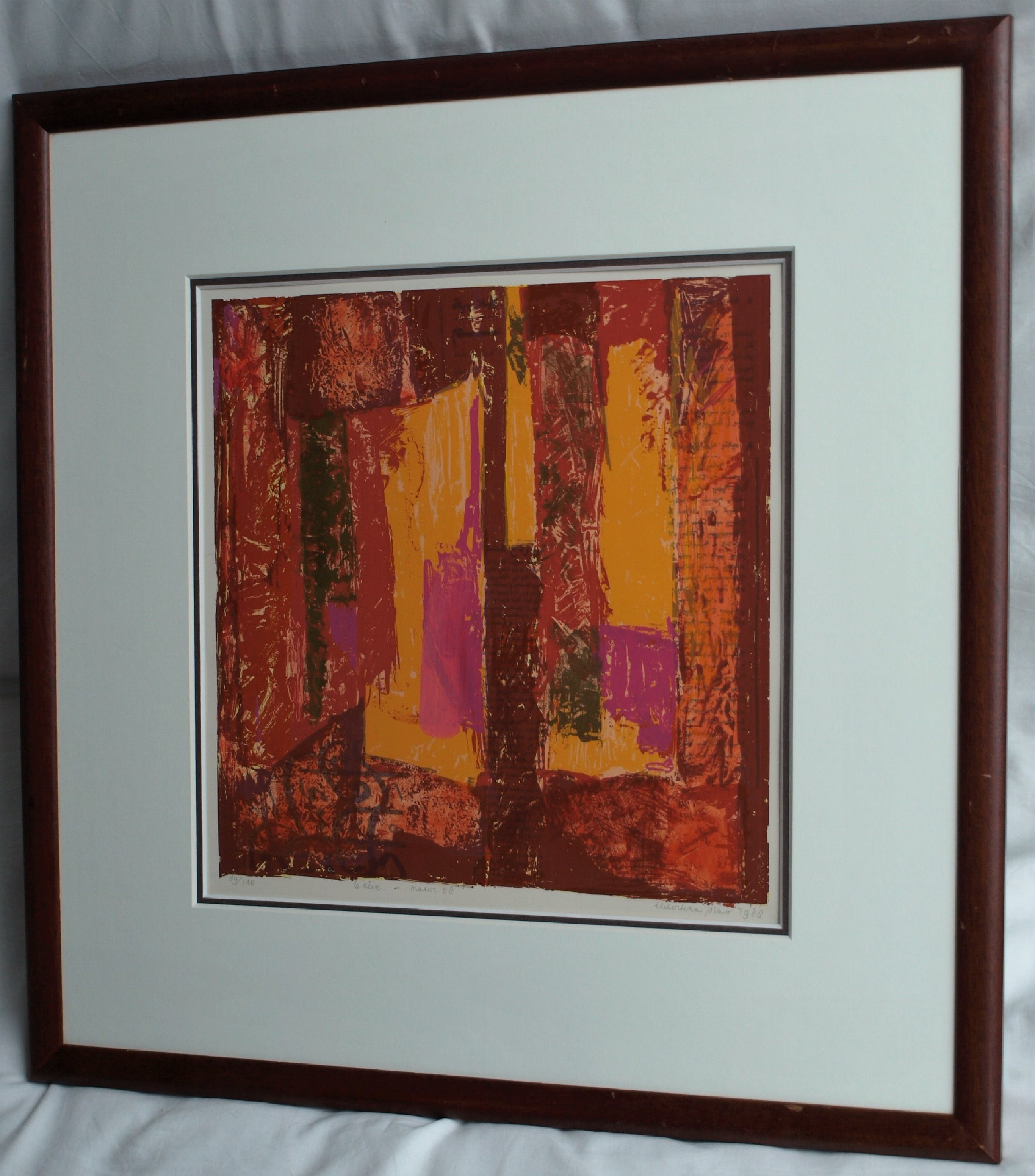 De zeefdruk is in zeer goede staat. De lijst heeft slijtplekjes. Zie ook de foto’s voor een eigen indruk. Het werk kan zo aan de muur. | |||