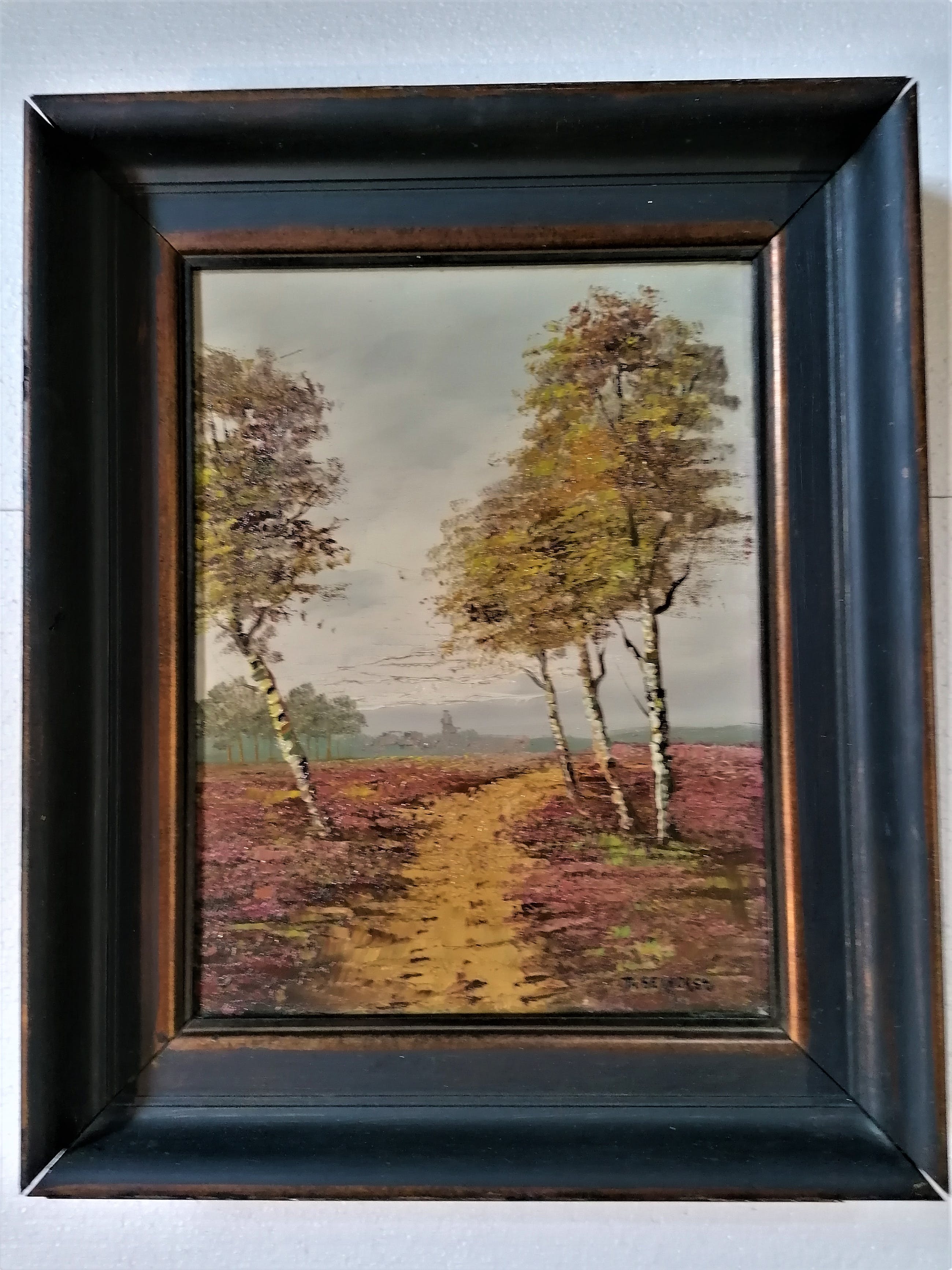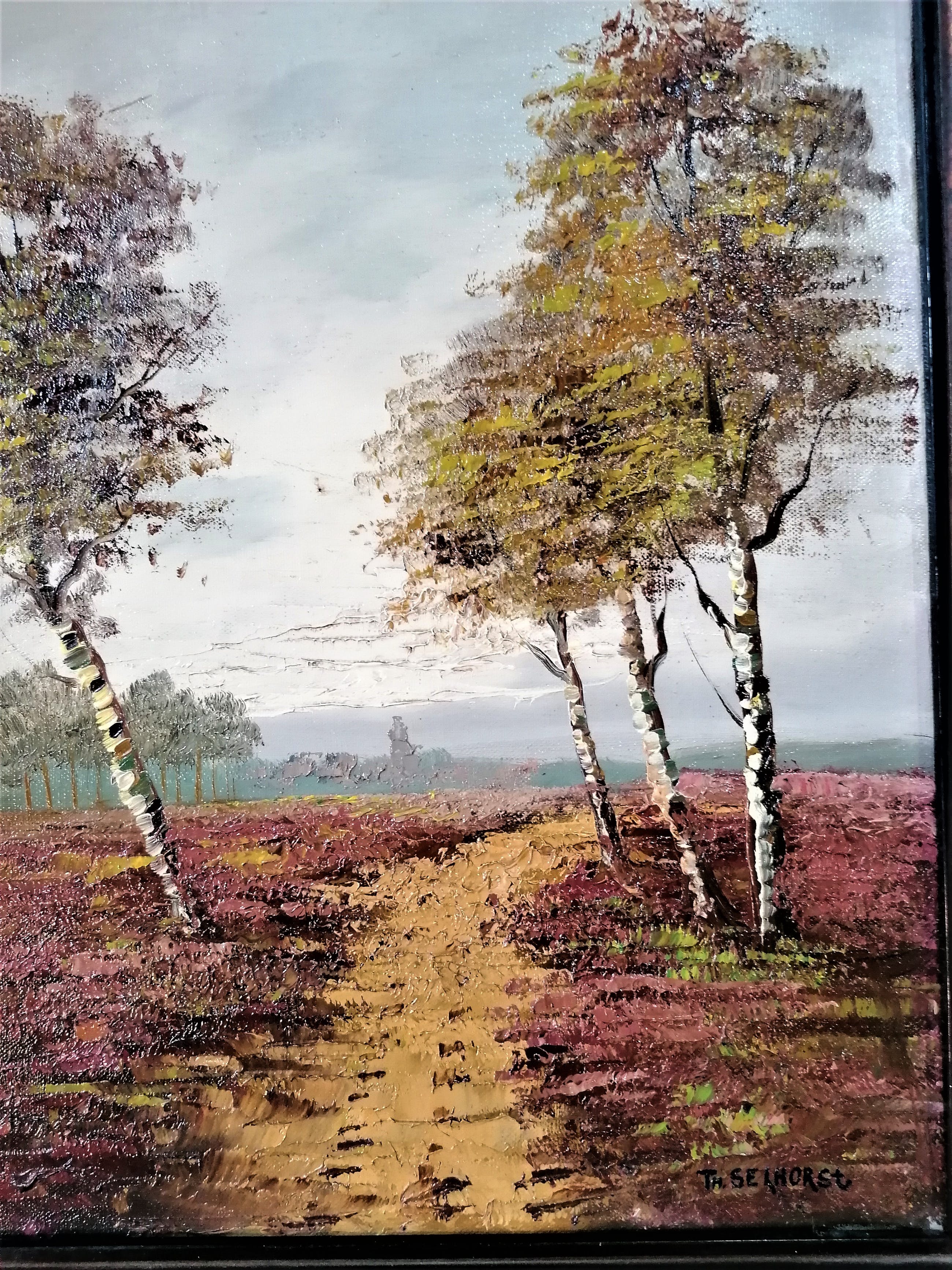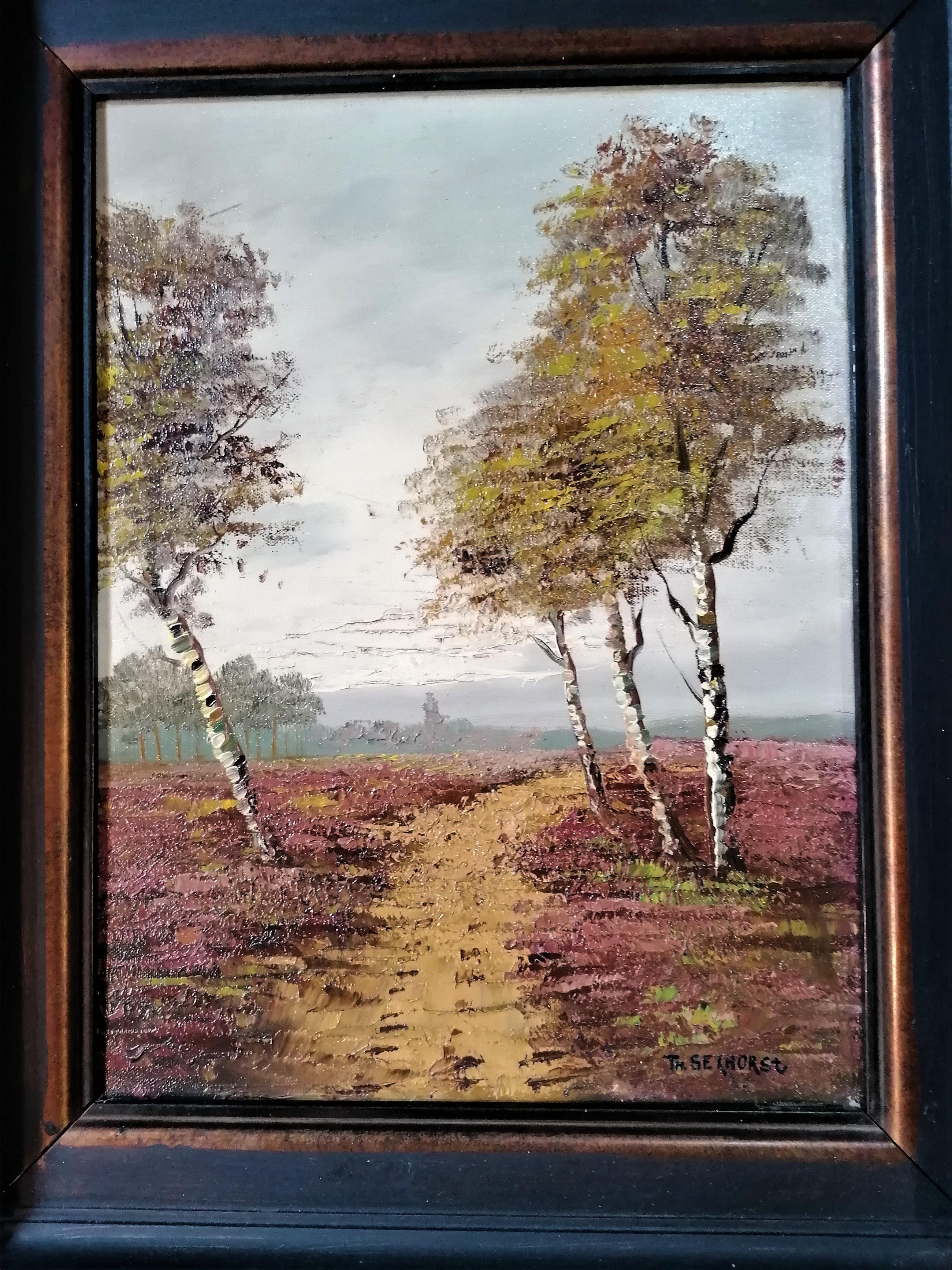 Zicht op dorp vanaf de heide. Geschilderd door Theodorus Selhorst (1891-1982). Techniek: olieverf op doek. Gesigneerd aan de rechter onderzijde. De afmetingen van het doek zijn: 30 cm x 40 cm. Inclusief de lijst zijn de afmetingen: 42 cm x 52 cm.