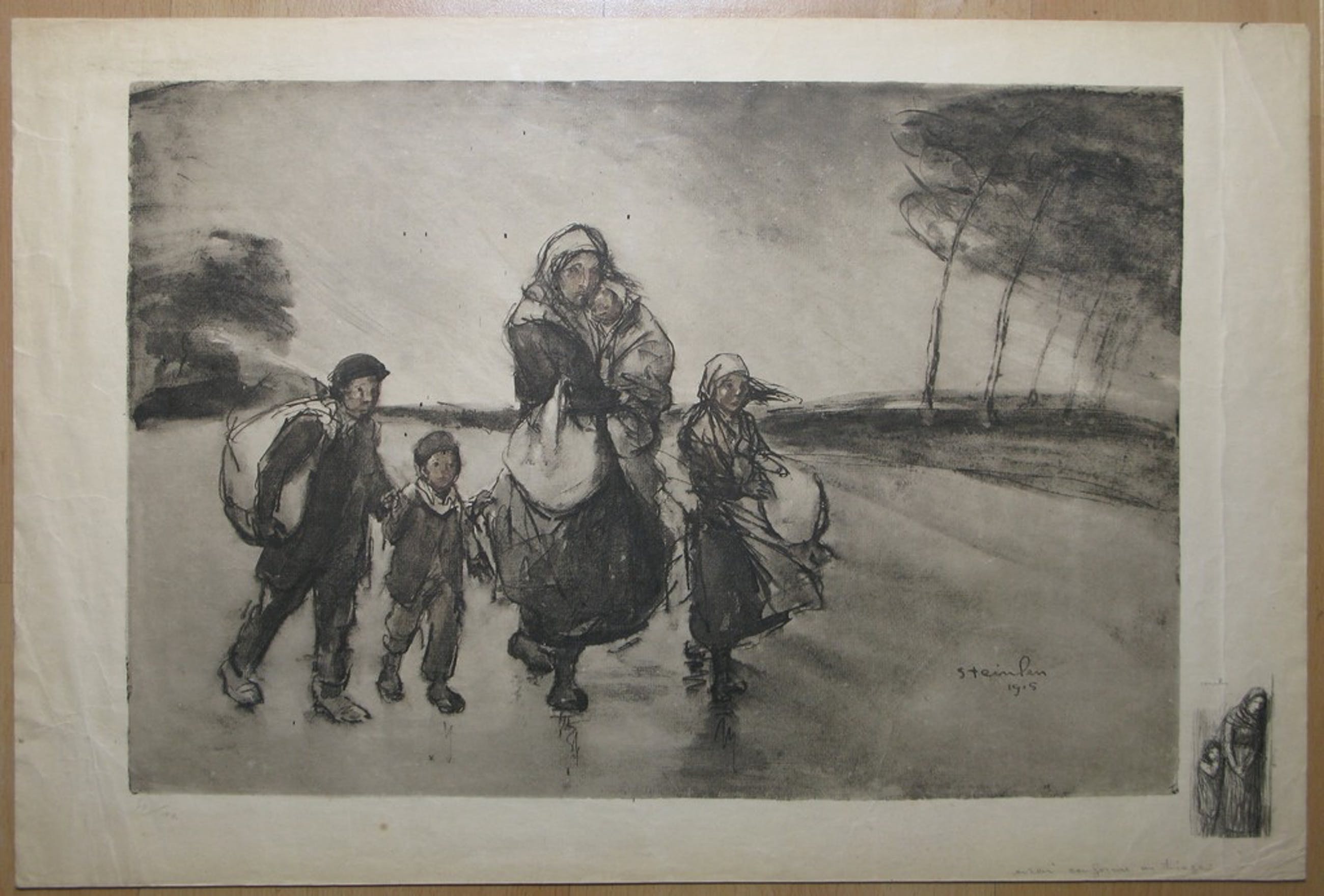 Fraaie litho van kunstenaar Steinlen, beroemd geworden door vele illustraties in Parijse kunsttijdschriften. Op deze grote litho is in de rechter marge een tweede voorstelling afgedrukt. Onderop staat vermeld: essai conforme le tirage. Links onder 70/100. De voorstelling is gaaf en scherp, de marges vertonen kreukjes die onder een passepartout zullen wegvallen. Maat litho, 39x58 cm.