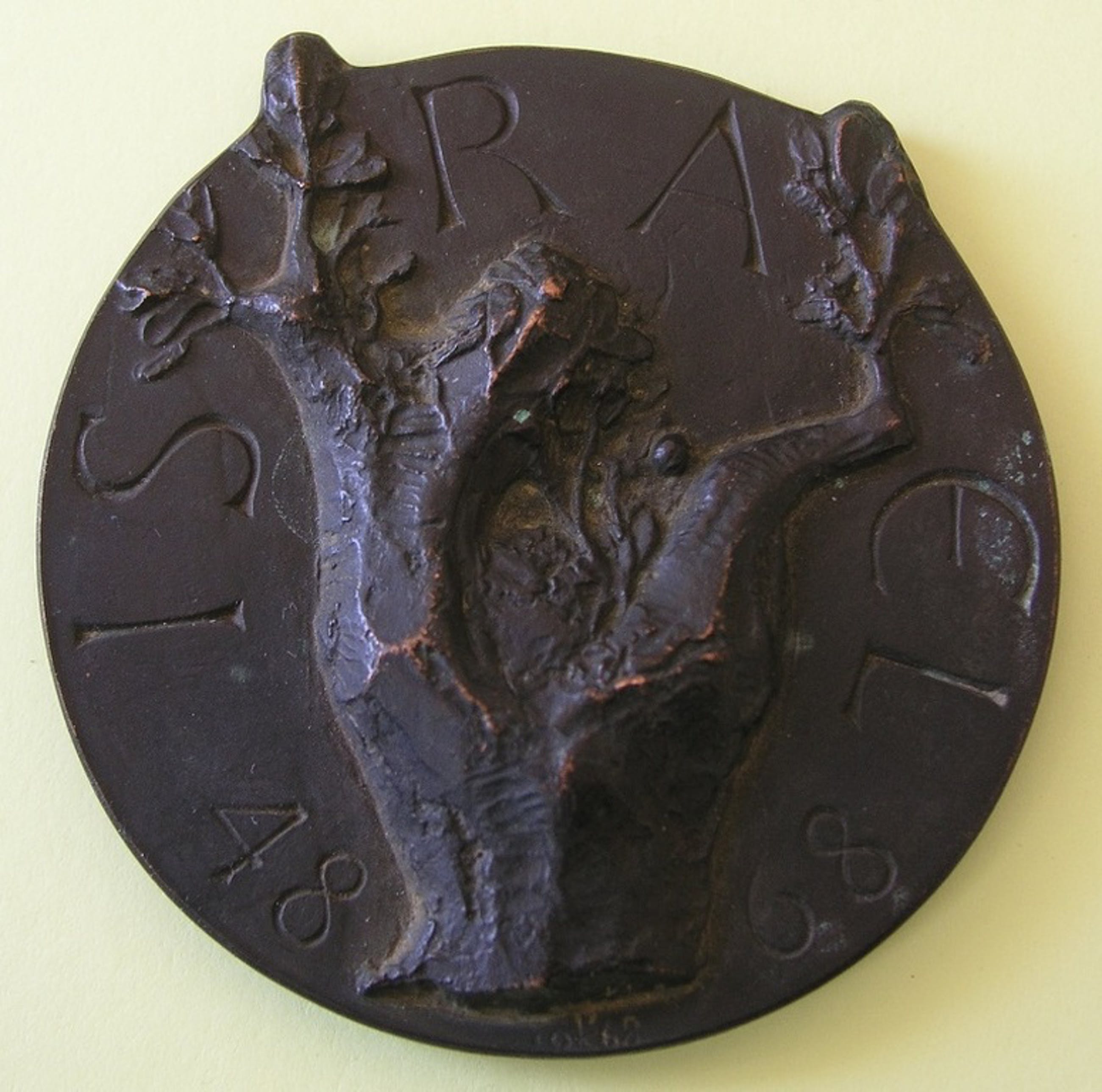 Een krachtige olijfboom die in zijn toppen nieuwe bladeren zet. De boom symboliseert het land en de inwoners van Israël. Het Israël, dat door hard werken zijn land tot bloei brengt. Het randschrift: ISRAËL 48-68 duidt op pregnante wijze naam en periode aan.