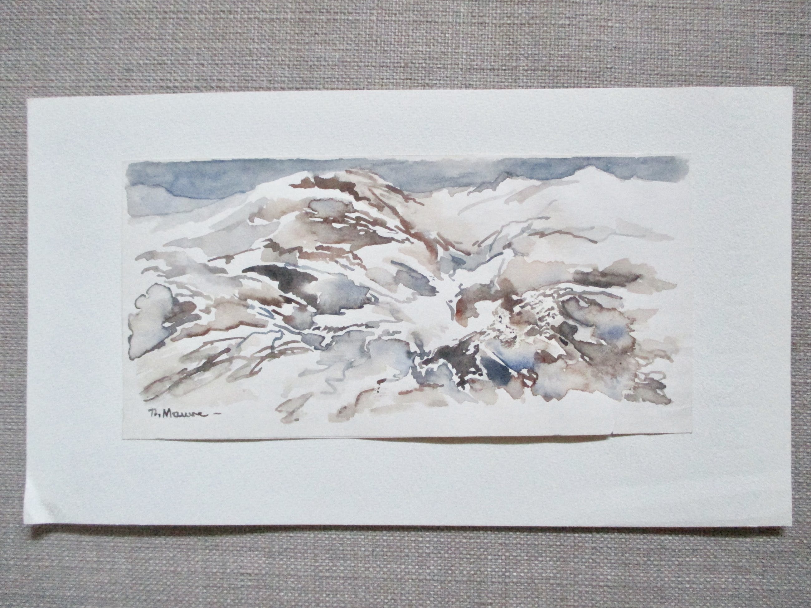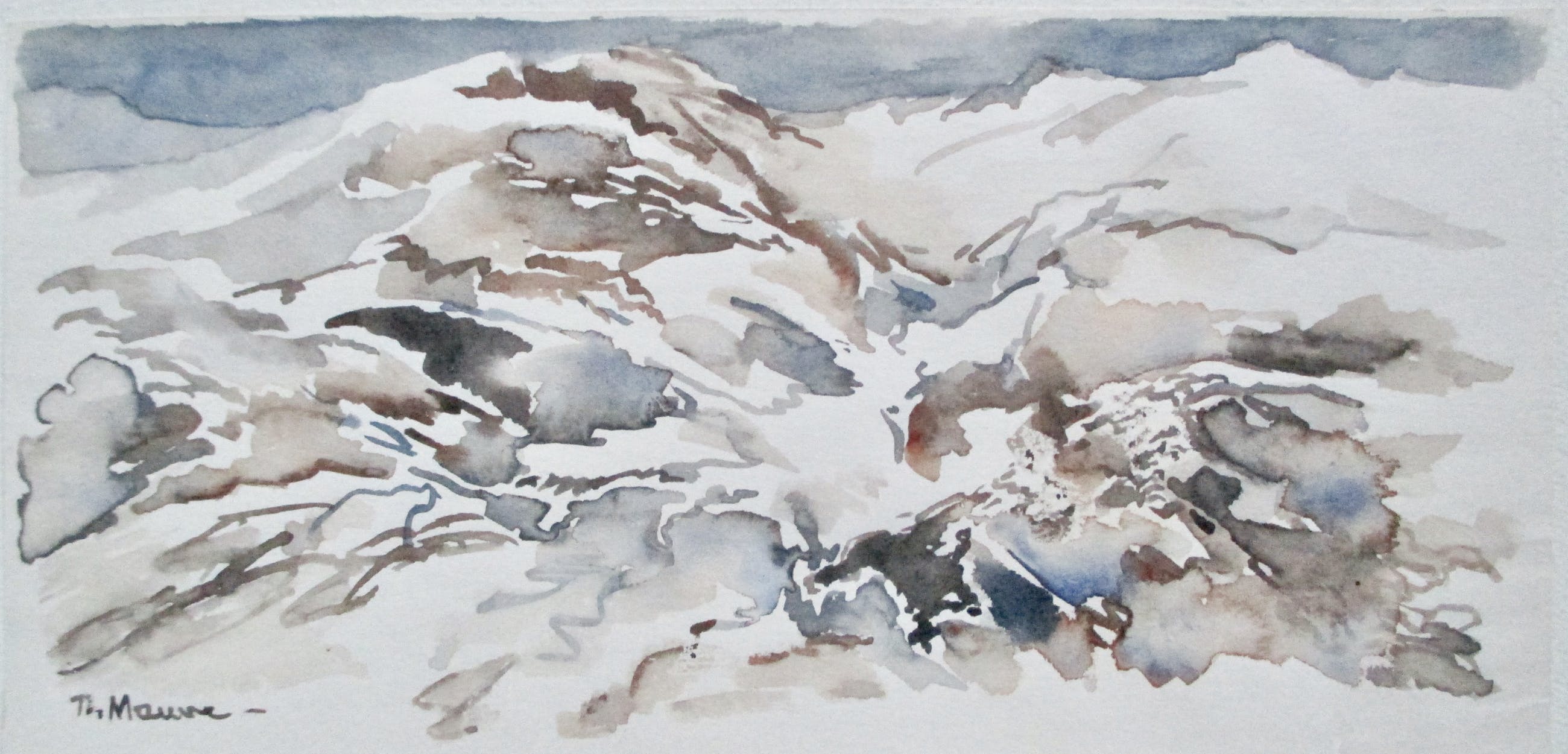 Aquarel van Thijs Mauve, gesigneerd l.o . Afm. bld 9.6 x19.5. het blad is bevestigd op een ander blad papier.