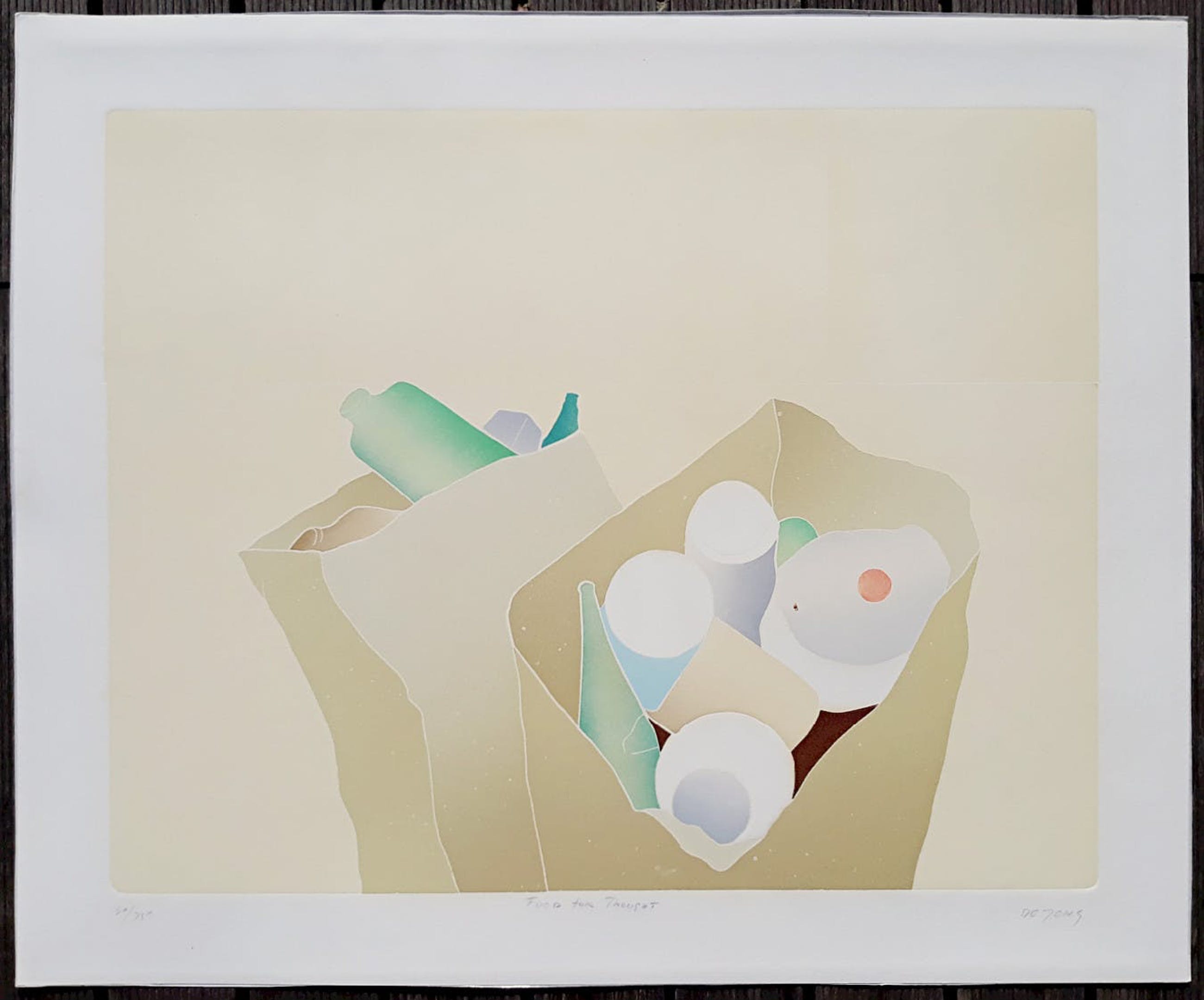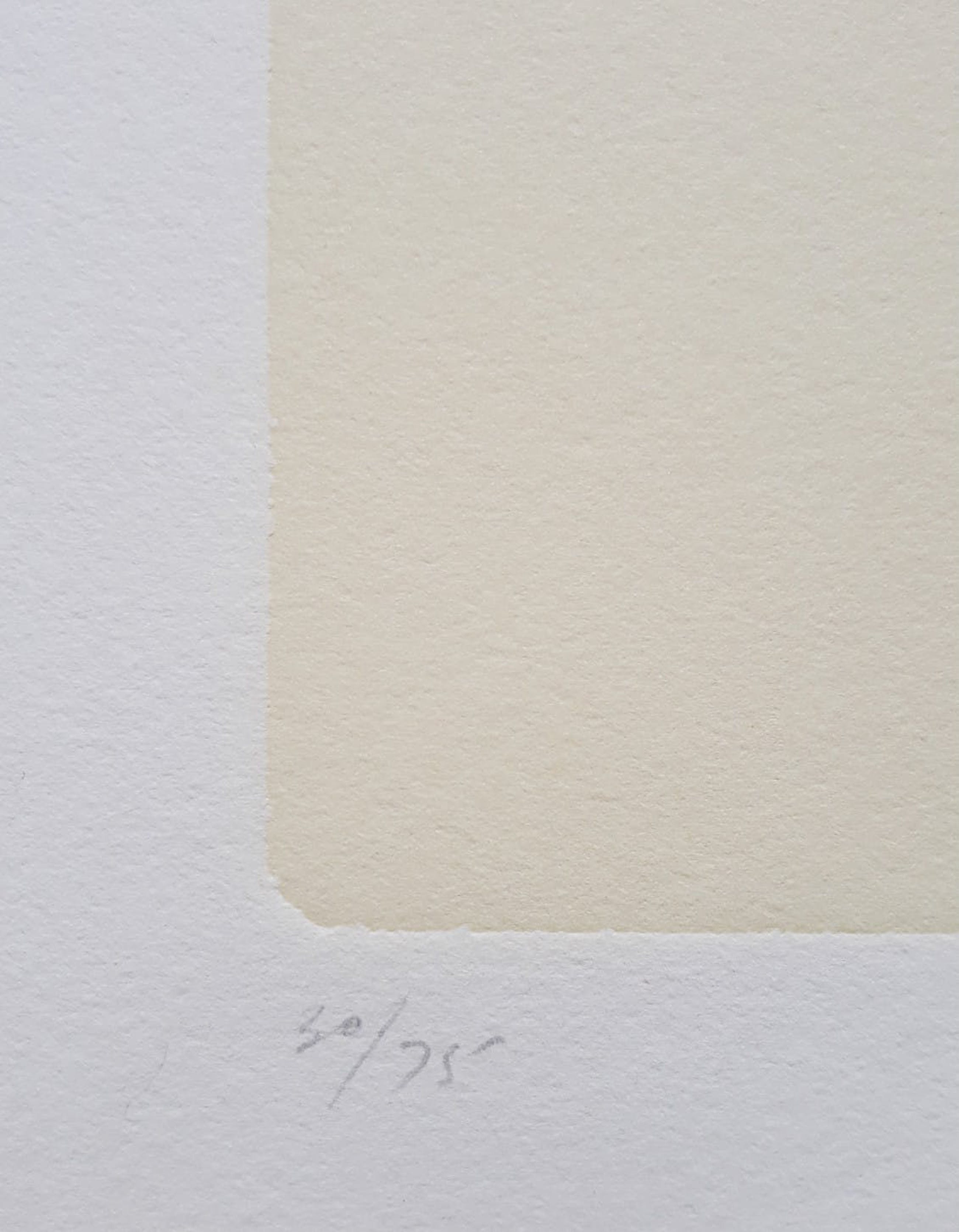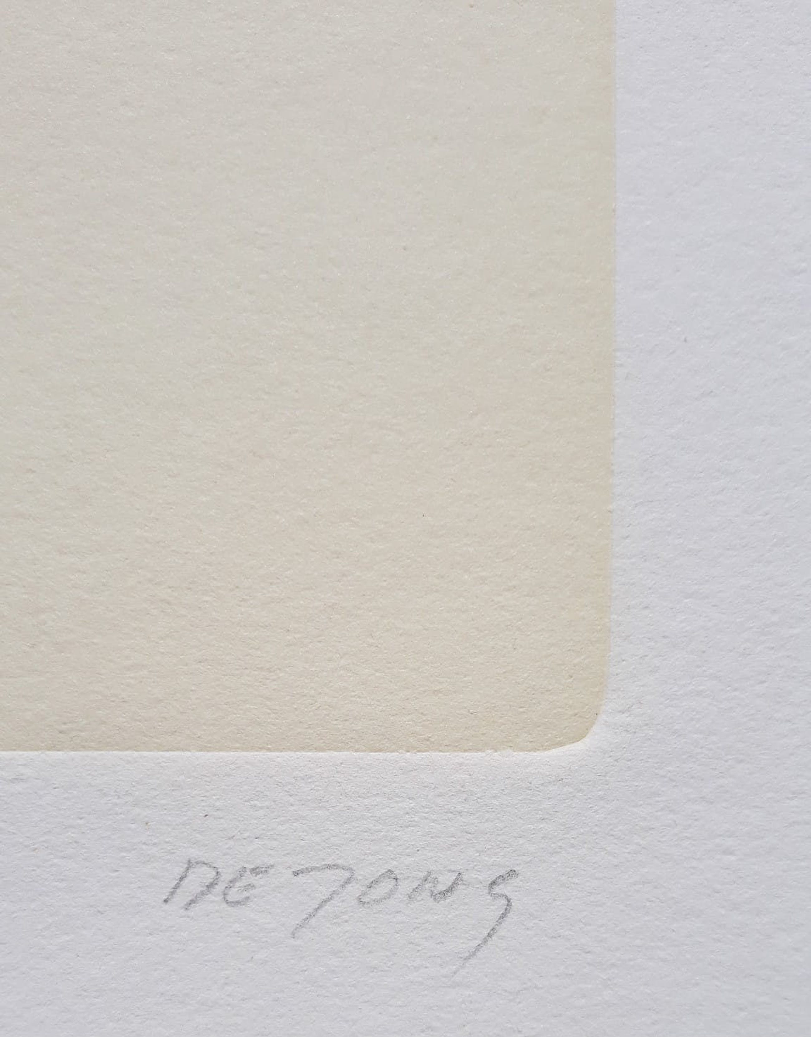 Apart, herkenbaar werk van Thom de Jong. Aquatint ets op geschept papier, met potlood gesigneerd, getiteld en genummerd (30/75), te dateren jaren 80. Afkomstig uit de kunstcollectie van ABNAMRO, in zeer goede conditie. Werk heeft ingelijst gezeten want er zitten taperesten langs de randen aan de achterkant van het blad. Opnieuw ingelijst met passe-partout is het werk uitstekend.