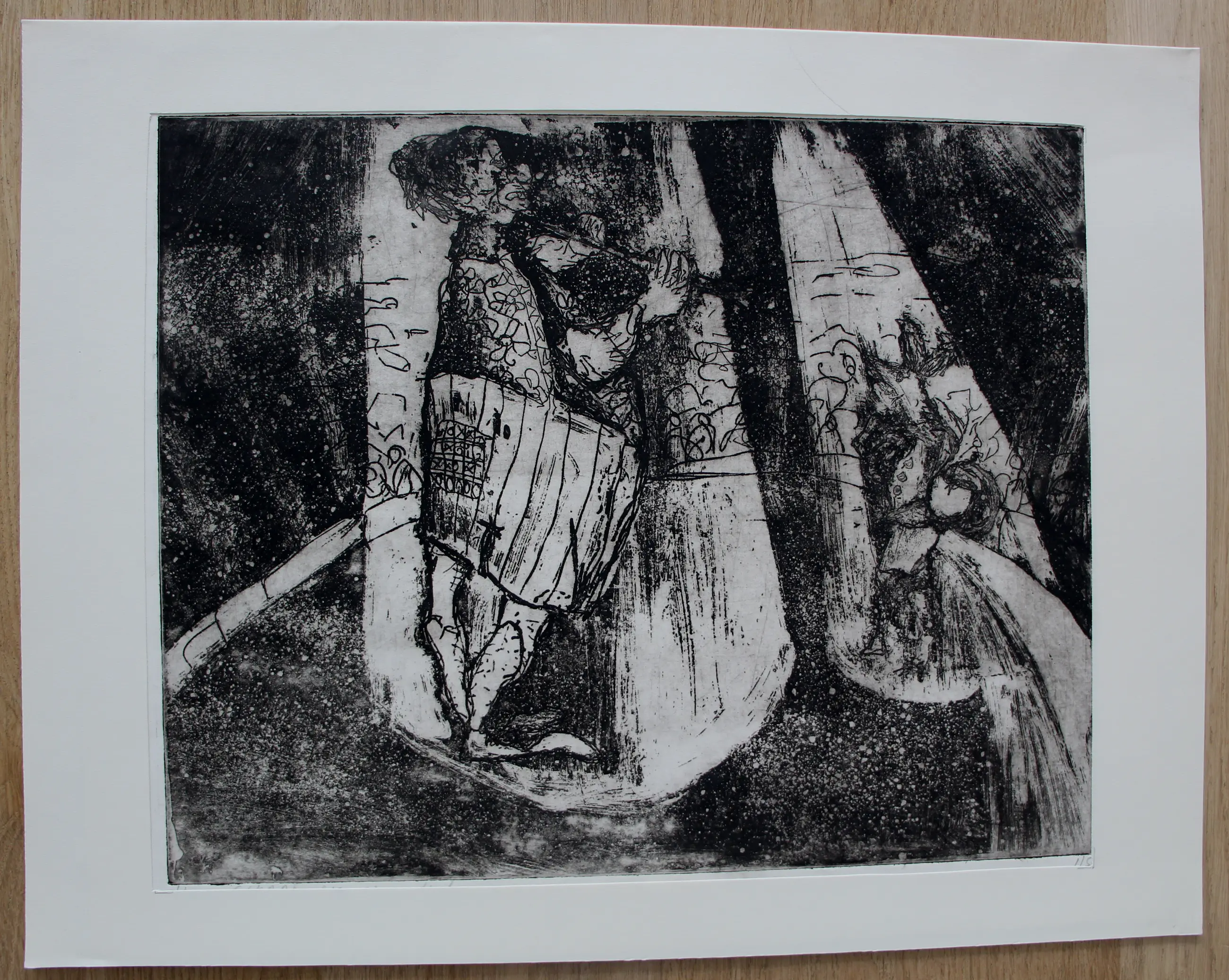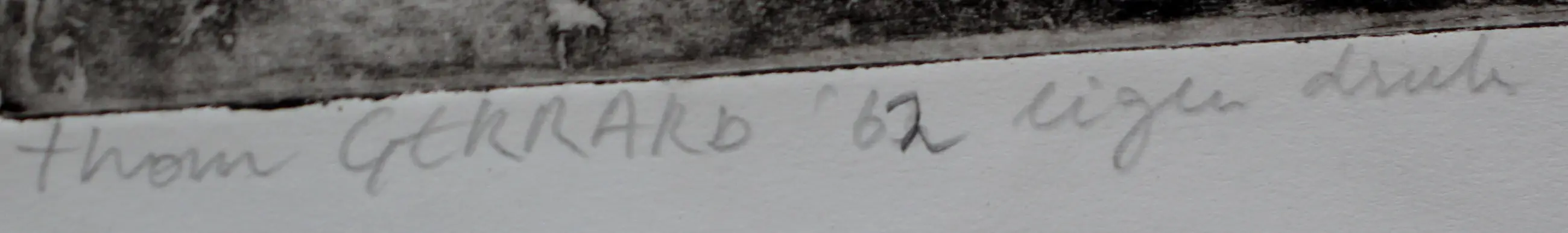 Ets van Thom Gerrard. Jaar: 1962. Oplage: 1/50. Afmetingen incl passe-partout: H38.5x b49.5cm. Afmetingen voorstelling: H31 x b38.5cm. Het werk is links onderaan, met potlood, gesigneerd door de kunstenaar. De authenticiteit van het aangeboden werk wordt volledig gegarandeerd. Een certificaat van echtheid kan, op aanvraag, worden gegarandeerd.