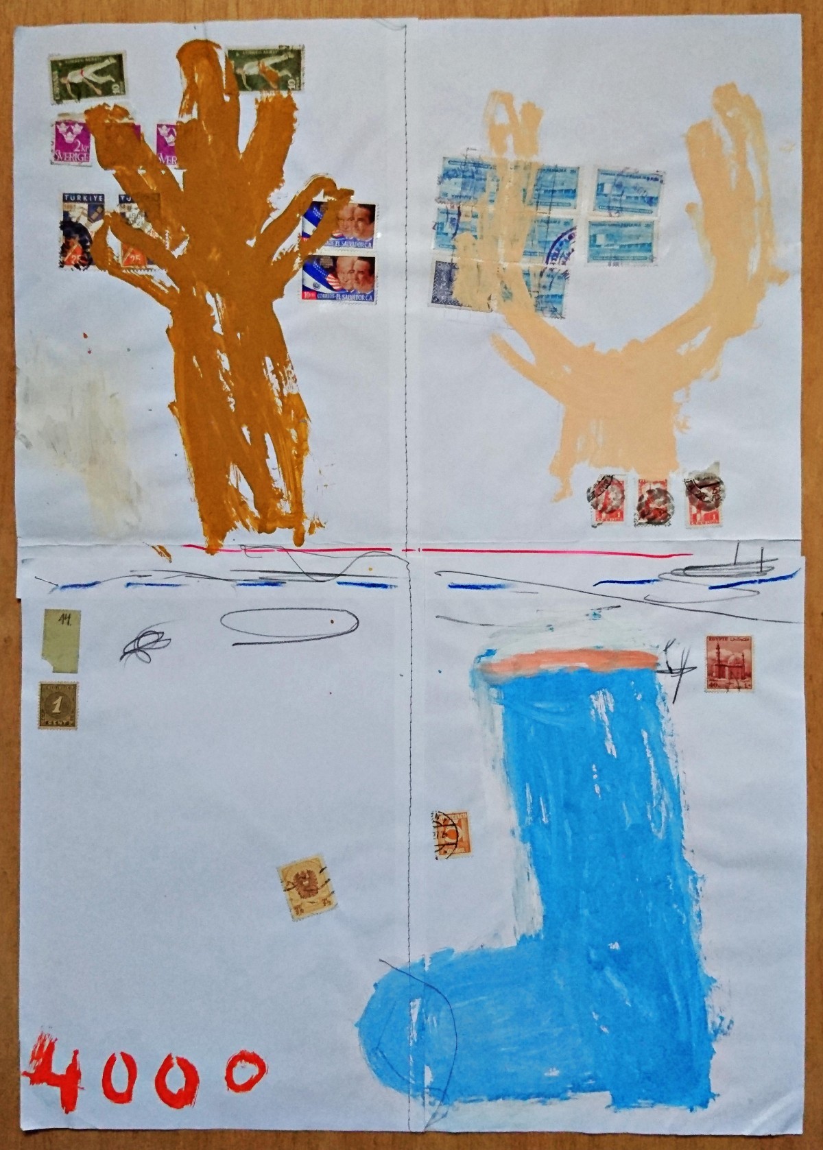 >>>>>>>>>>>>>>>>>>>>>>>>>>>>>>>>>>>>>>>>>>>>>>>>>>>>>>>Einmaliges, wunderschönes und typisches Original Gemälde in Acrylfarbe, Grafit und Collage auf gebrauchtem, teilweise bedrucktem Papier, des bekannten Malers und Graphikers mit dem originellen Pseudonym "4000" Titel: ohne (Stiefel), geschaffen um 2006, Unikat, Maße ca. 52 x 42 cm (HxB). vom Künstler handsigniert unten links, rückseitig mit Bleistift von fremder Hand bezeichnet. Fachgerechte Lagerung im Graphikschrank, war nie gerahmt, in farbfrischem, gutem Zustand !